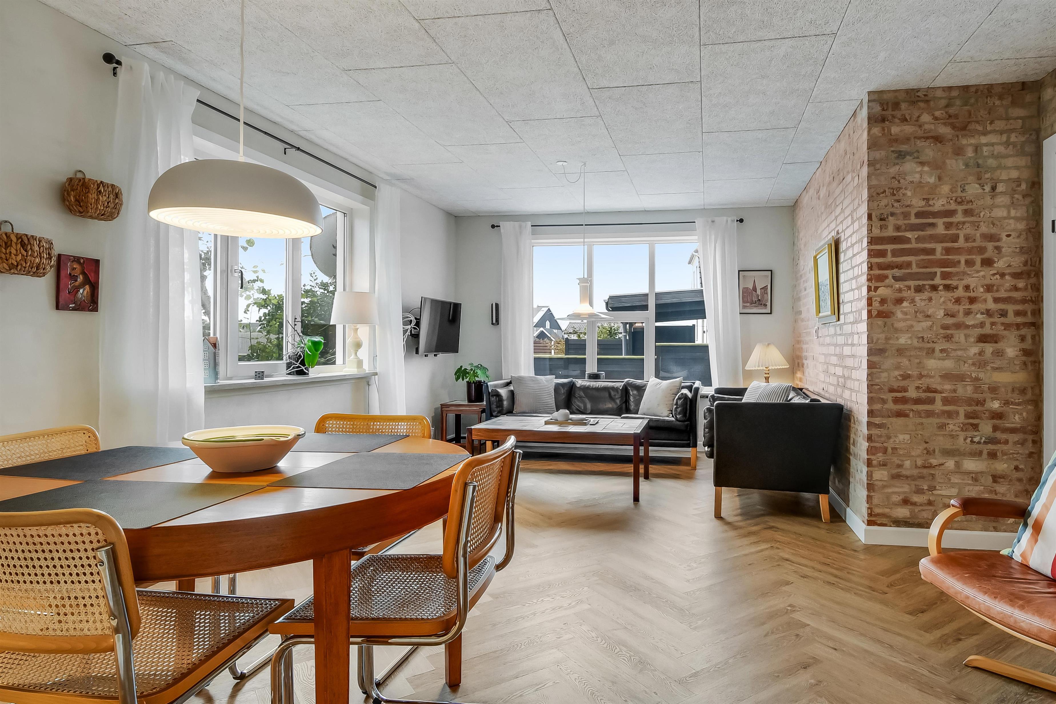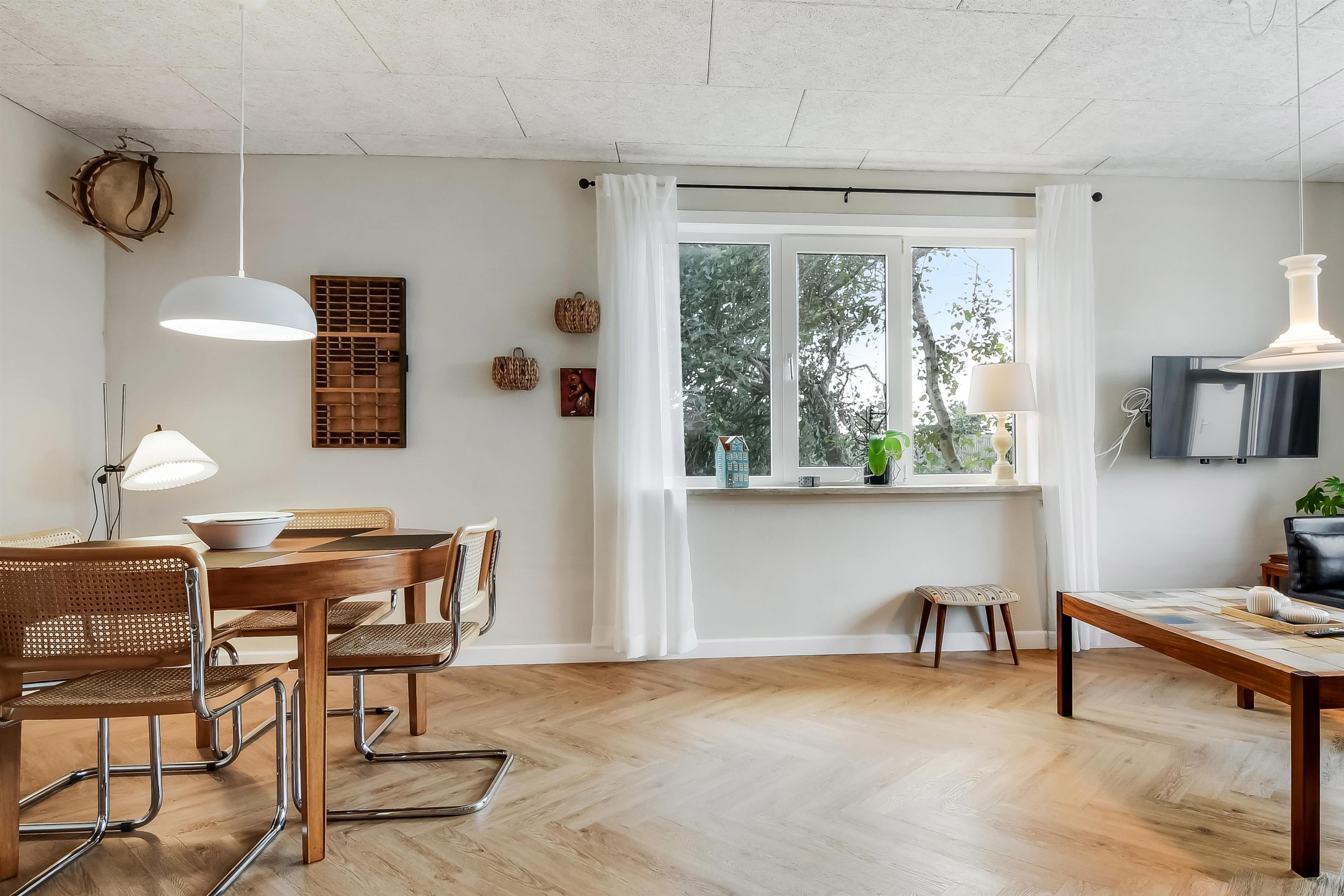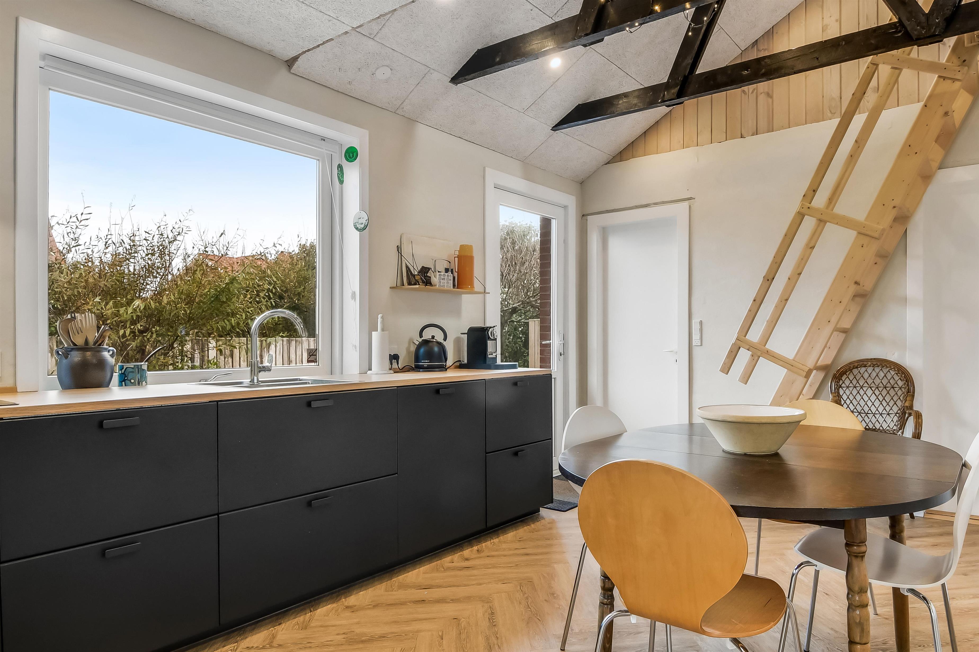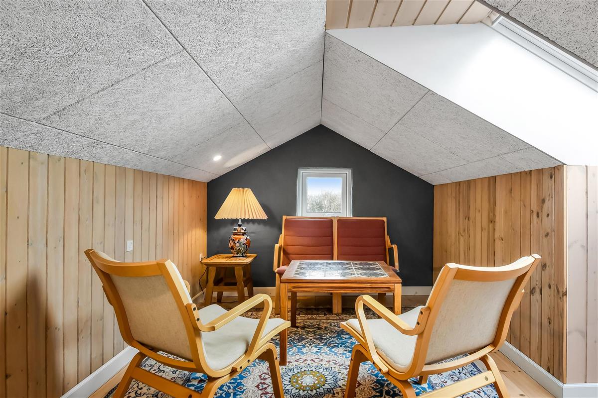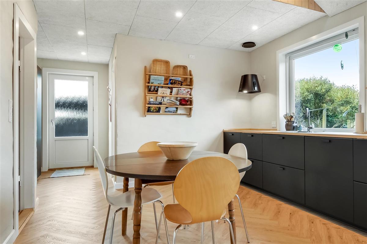 Die Einrichtung des Hauses verfügt über einen praktischen Flur mit Waschmaschine und extra Ablageplatz. Die Küche ist neu und der Esstisch steht an der Küche, damit es einfach ist, das Essen zum Tisch zu bringen. Die Küche hat einen Herd mit Induktionskochplatte, eingebauten Ofen, Kühlschrank und ein Gefrierschrank mit 150 l, Geschirrspüler, Airfryer und Fußbodenheizung. In der Küche können Sie die Balken an der Decke sehen. Schöner Wohnraum mit Holzboden, Ledermöbeln, TV mit Parabol-Antenne und deutschen und dänischen Programmen, Chromecast mit der Möglichkeit für Streaming von eigenen Programmen, für die Sie selber ein Abonnement haben. Im Wohnraum gibt es auch eine Fußbodenheizung. 2 Schlafräume: 2B + 1DB und ein offener Schlafboden mit 2 Schlafmöglichkeiten. Von der Küche geht es über eine steile Treppe zum 1. Stock. Schönes Badezimmer mit Toilette, Dusche, Waschbecken und Fußbodenheizung.