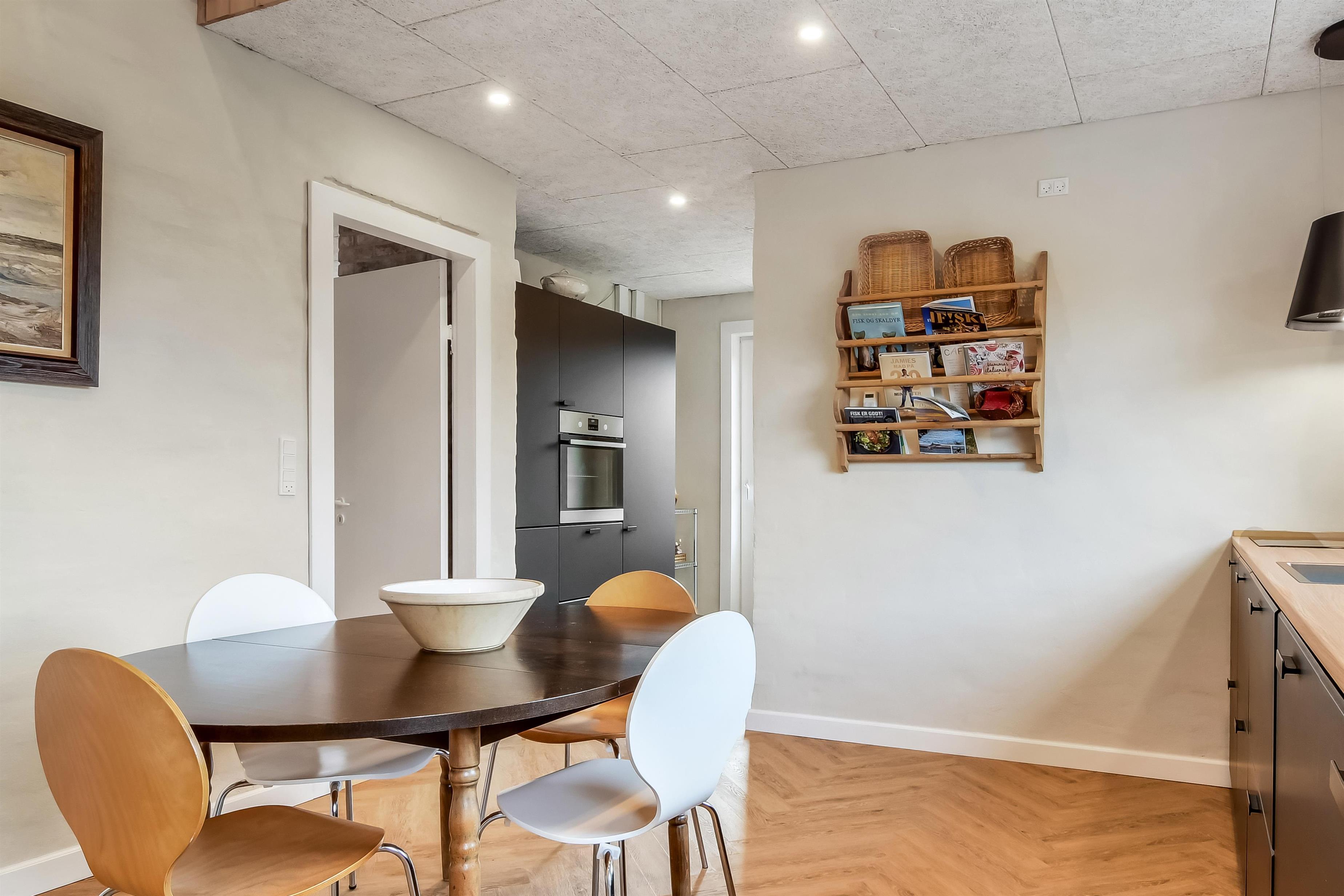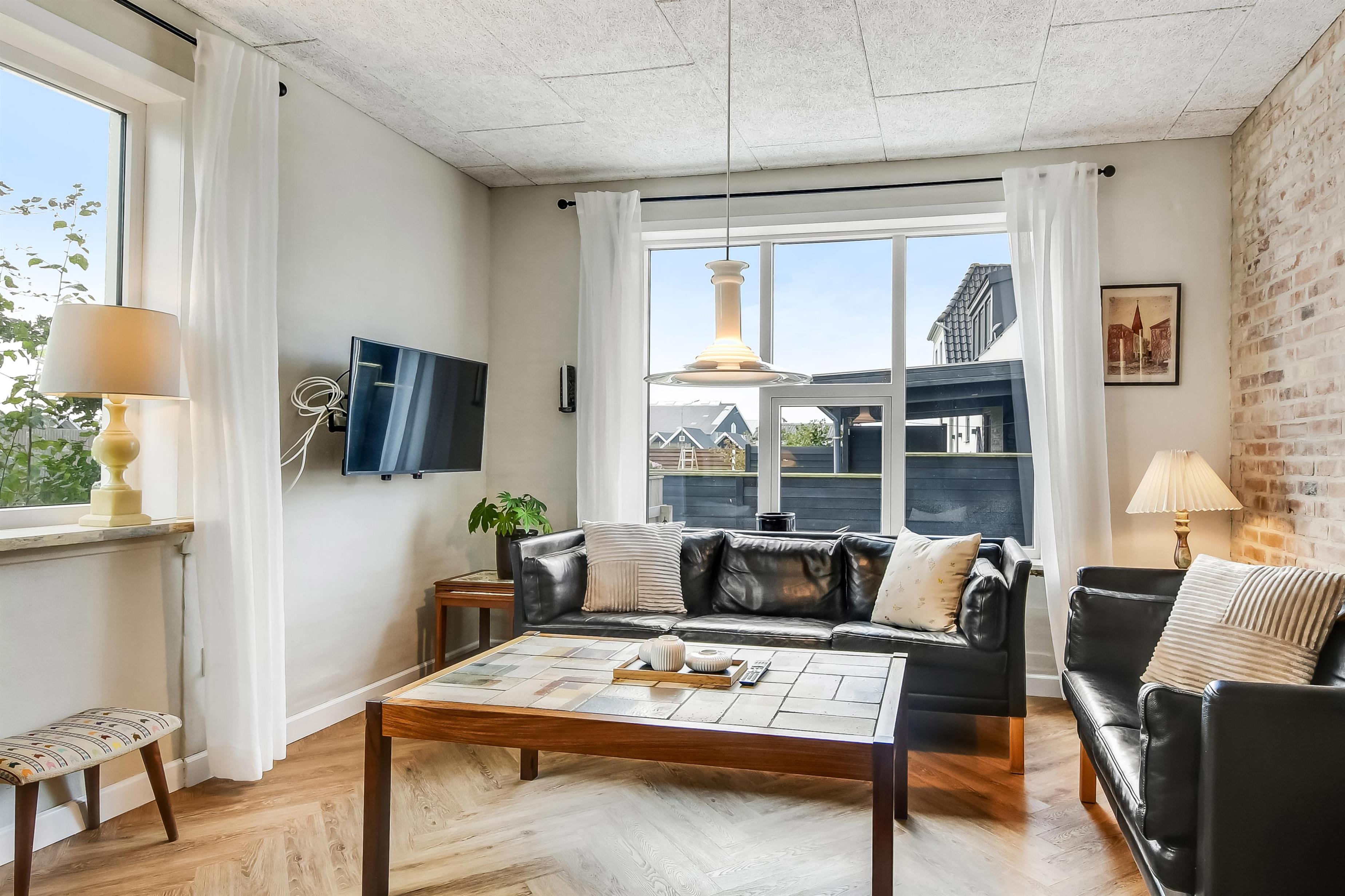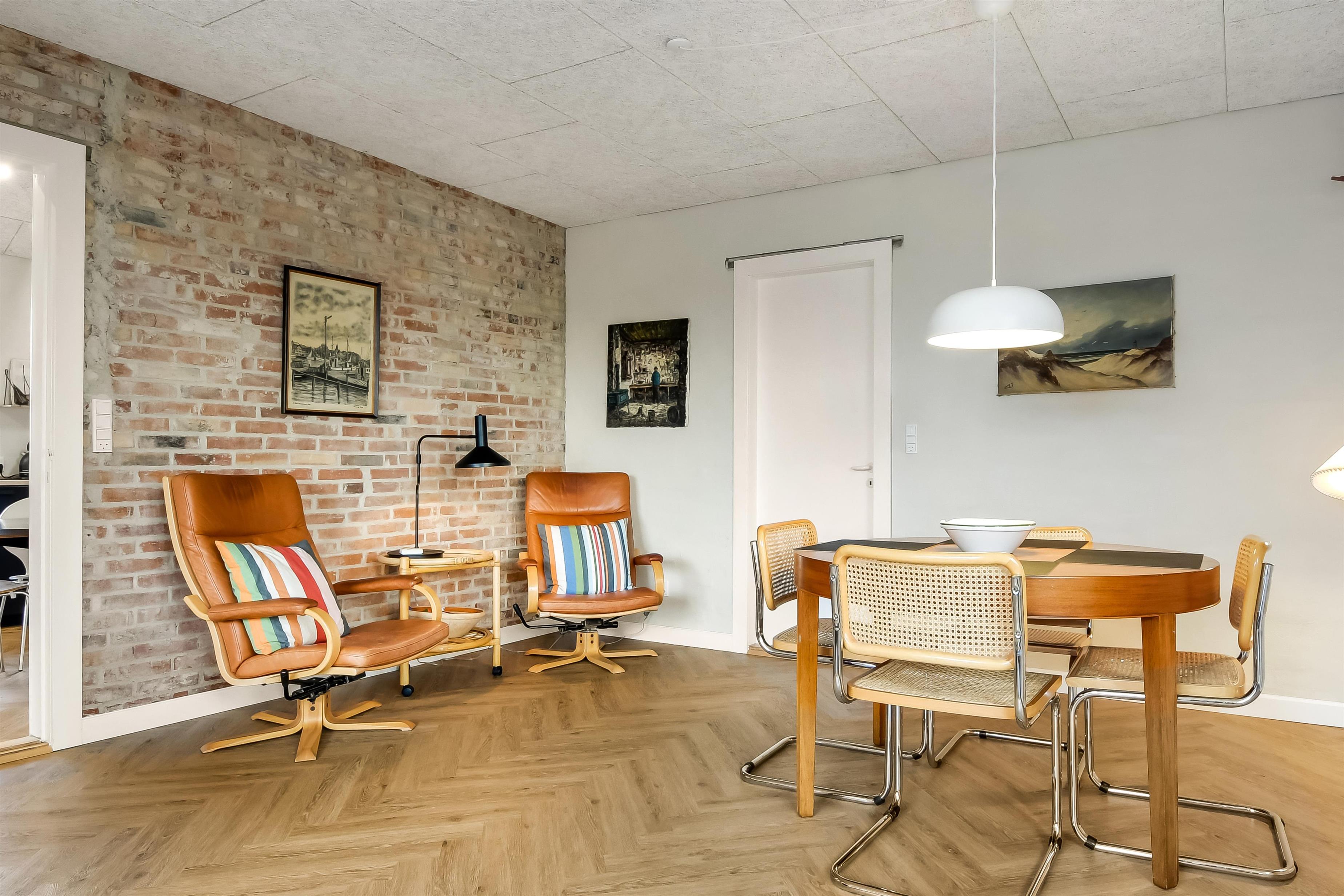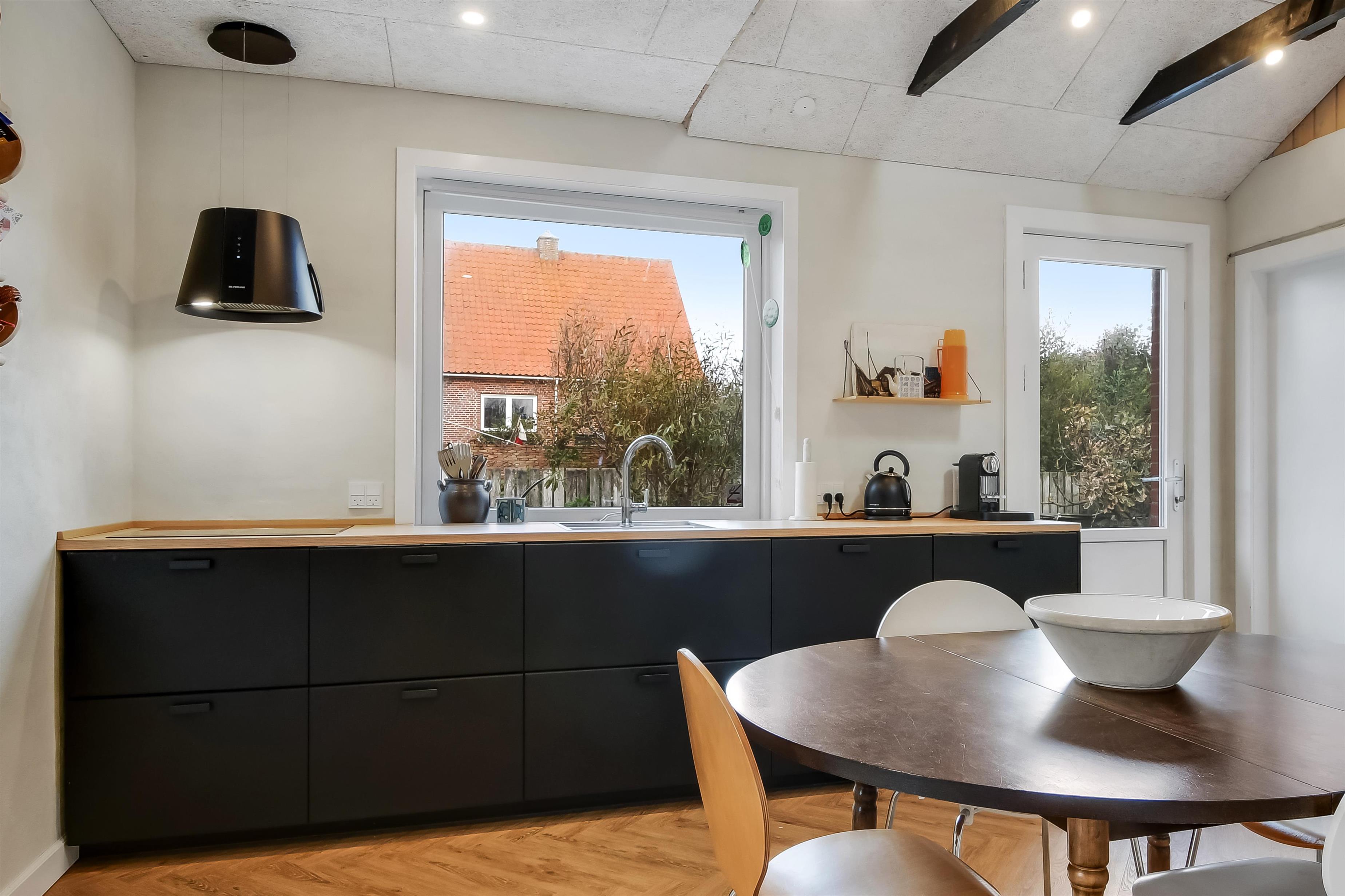 Die Einrichtung des Hauses verfügt über einen praktischen Flur mit Waschmaschine und extra Ablageplatz. Die Küche ist neu und der Esstisch steht an der Küche, damit es einfach ist, das Essen zum Tisch zu bringen. Die Küche hat einen Herd mit Induktionskochplatte, eingebauten Ofen, Kühlschrank und ein Gefrierschrank mit 150 l, Geschirrspüler, Airfryer und Fußbodenheizung. In der Küche können Sie die Balken an der Decke sehen. Schöner Wohnraum mit Holzboden, Ledermöbeln, TV mit Parabol-Antenne und deutschen und dänischen Programmen, Chromecast mit der Möglichkeit für Streaming von eigenen Programmen, für die Sie selber ein Abonnement haben. Im Wohnraum gibt es auch eine Fußbodenheizung. 2 Schlafräume: 2B + 1DB und ein offener Schlafboden mit 2 Schlafmöglichkeiten. Von der Küche geht es über eine steile Treppe zum 1. Stock. Schönes Badezimmer mit Toilette, Dusche, Waschbecken und Fußbodenheizung.