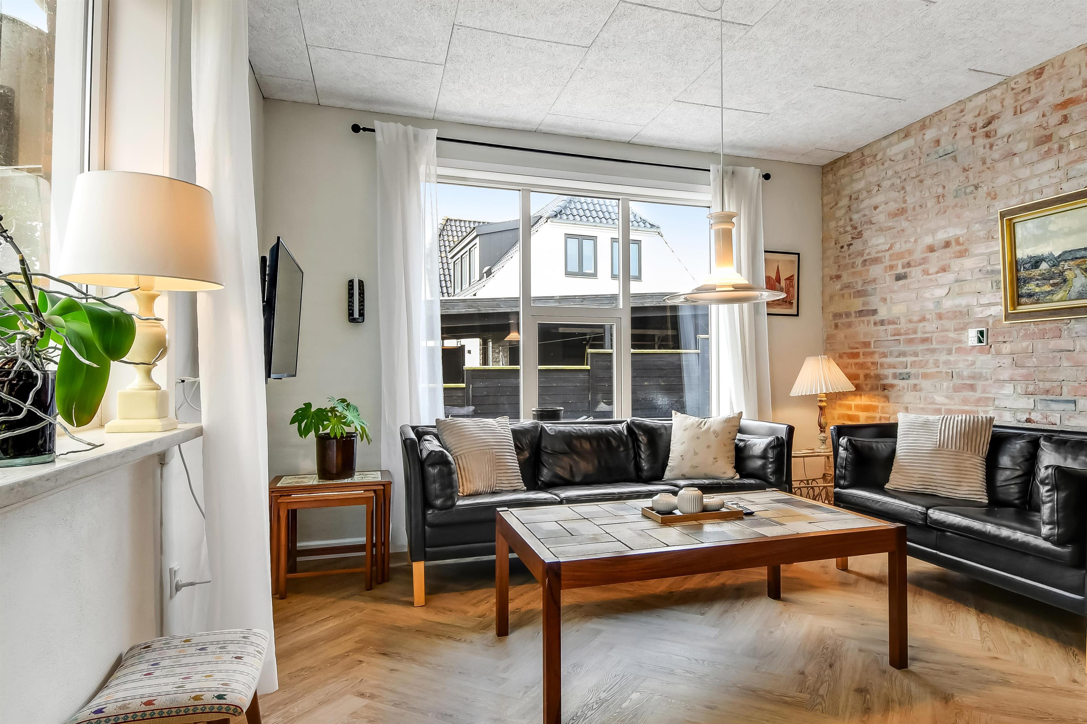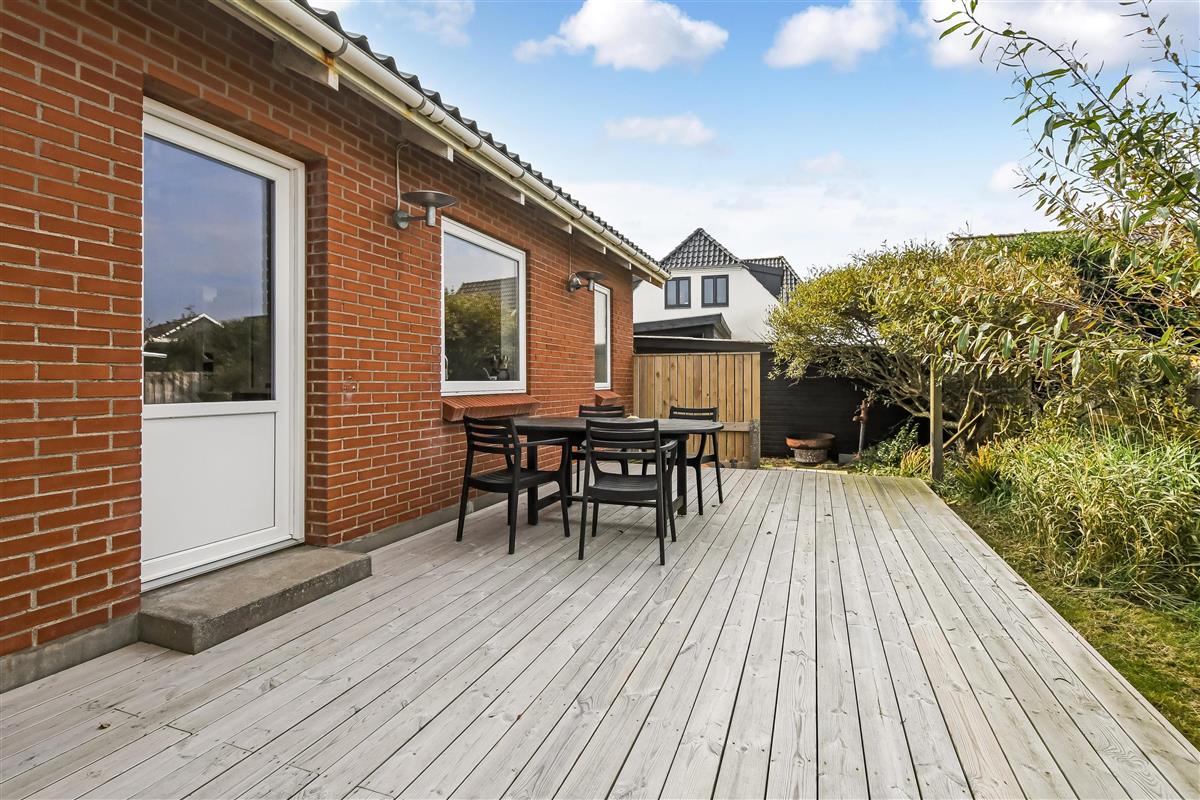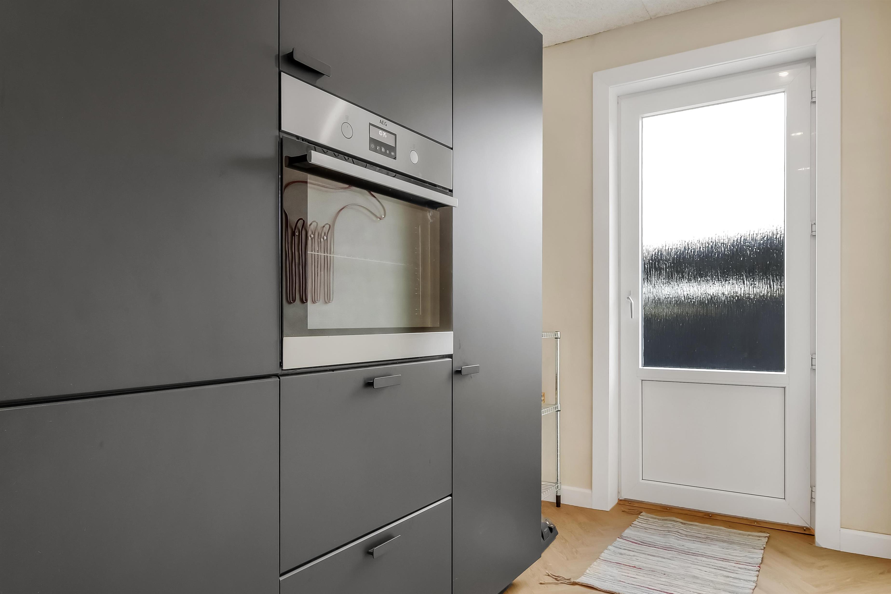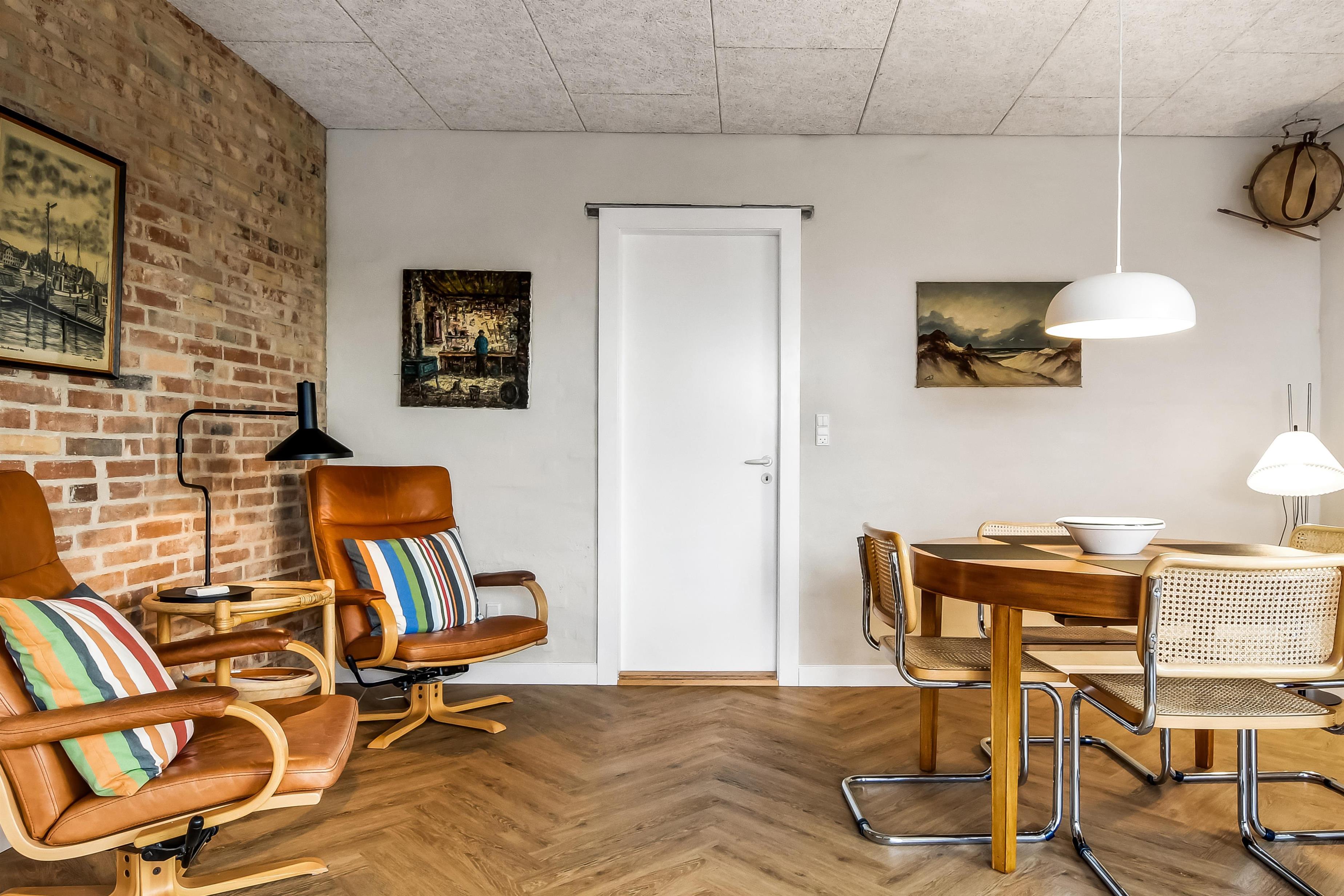 Die Einrichtung des Hauses verfügt über einen praktischen Flur mit Waschmaschine und extra Ablageplatz. Die Küche ist neu und der Esstisch steht an der Küche, damit es einfach ist, das Essen zum Tisch zu bringen. Die Küche hat einen Herd mit Induktionskochplatte, eingebauten Ofen, Kühlschrank und ein Gefrierschrank mit 150 l, Geschirrspüler, Airfryer und Fußbodenheizung. In der Küche können Sie die Balken an der Decke sehen. Schöner Wohnraum mit Holzboden, Ledermöbeln, TV mit Parabol-Antenne und deutschen und dänischen Programmen, Chromecast mit der Möglichkeit für Streaming von eigenen Programmen, für die Sie selber ein Abonnement haben. Im Wohnraum gibt es auch eine Fußbodenheizung. 2 Schlafräume: 2B + 1DB und ein offener Schlafboden mit 2 Schlafmöglichkeiten. Von der Küche geht es über eine steile Treppe zum 1. Stock. Schönes Badezimmer mit Toilette, Dusche, Waschbecken und Fußbodenheizung.