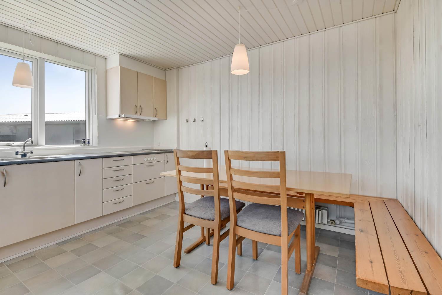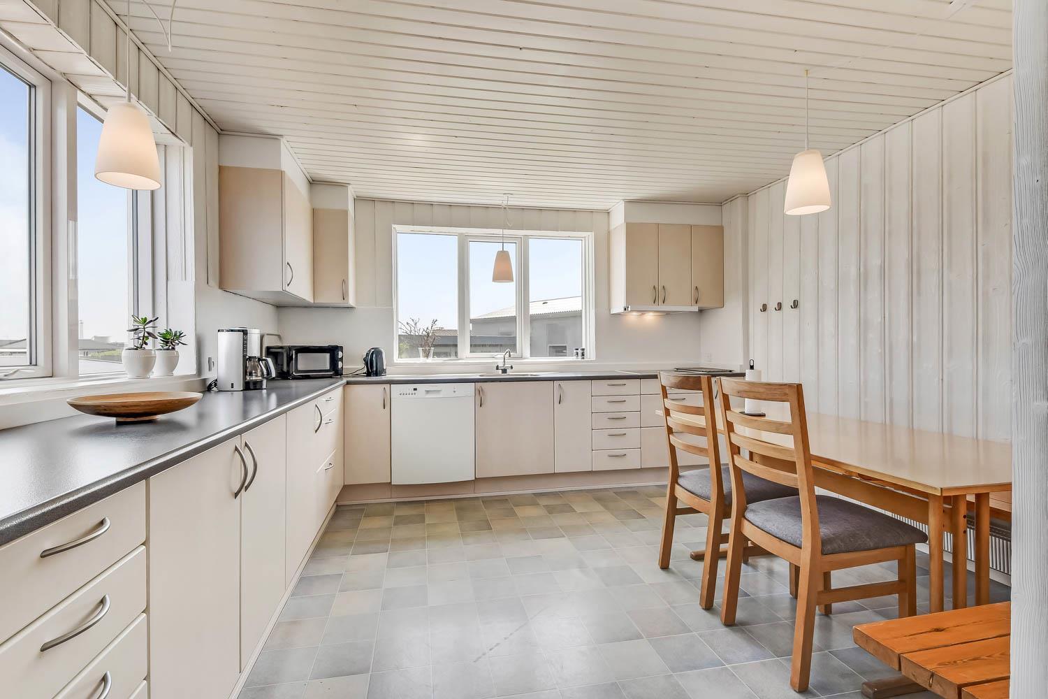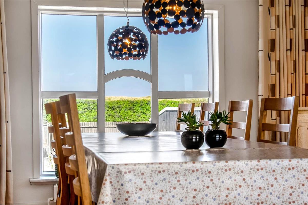 147 qm großes Ferienhaus, im Jahr 2024 renoviert. Vom Wohnraum gibt es einen tollen Blick zu den Dünen. Der Wohnraum ist mit Ledermöbeln, TV mit dänischen und deutschen Programmen, Radio und Esstisch eingerichtet. Die Küche ist mit Herd mit Ceranfeld-Kochplatten, Abzugshaube, Mikrowelle, Geschirrspüler und Kühlschrank und einem extra Esstisch mit Bank ausgestattet. Neben der Küche gibt es einen praktischen hinteren Flur mit separatem Gefrierabteil, Platz für Garderobe und Ausgang zum Garten. Toilette mit Fliesenboden, Toilette, Waschbecken. Es gibt praktische pflegeleichte Böden im ganzen Haus. Nichtraucher-Haus. Max. 2 Haustiere sind erlaubt. Das Haus wird mit Fernheizung beheizt und Sie zahlen einen festen Betrag pro Woche für die Fernheizung. Preis Fernheizung pro Woche vom 1.5.-31.10 42 EUR und vom 1.11.-30.4. 56 EUR.