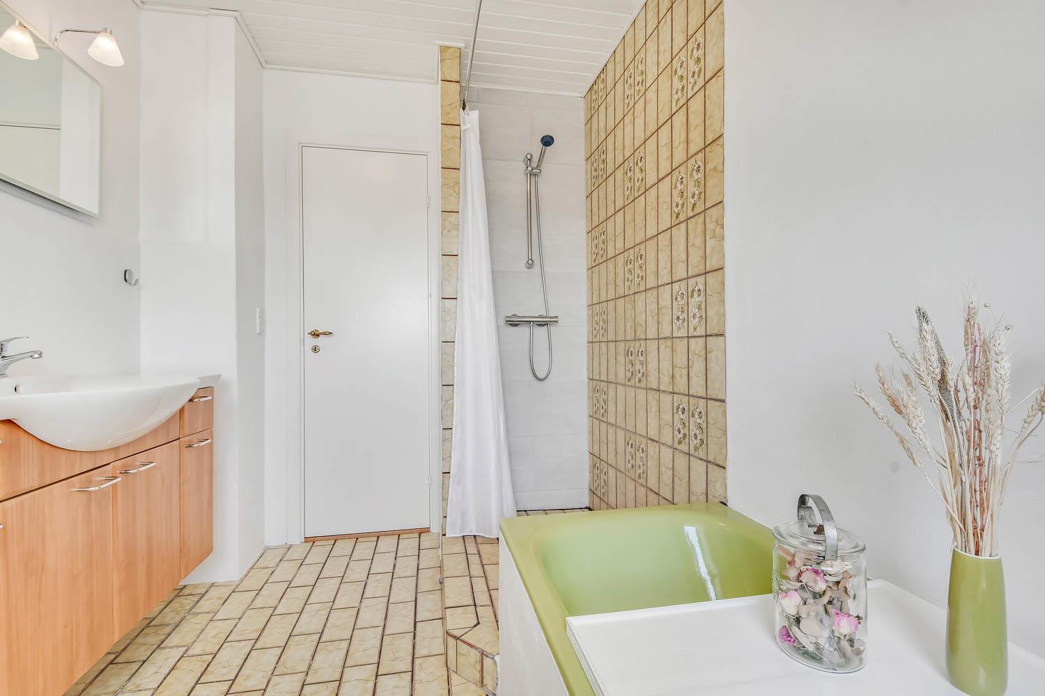 Im 1. Stock gibt es 3 Schlafräume. 1 großes Zimmer mit 4 Schlafplätzen: 1FB + 2B. Außerdem gibt es 2 Schlafräume mit jeweils einem DB. Im 1. Stock gibt es auch eine Toilette mit Waschbecken und seperates Baezimmer mit Dusche, Badewanne und Dusche.