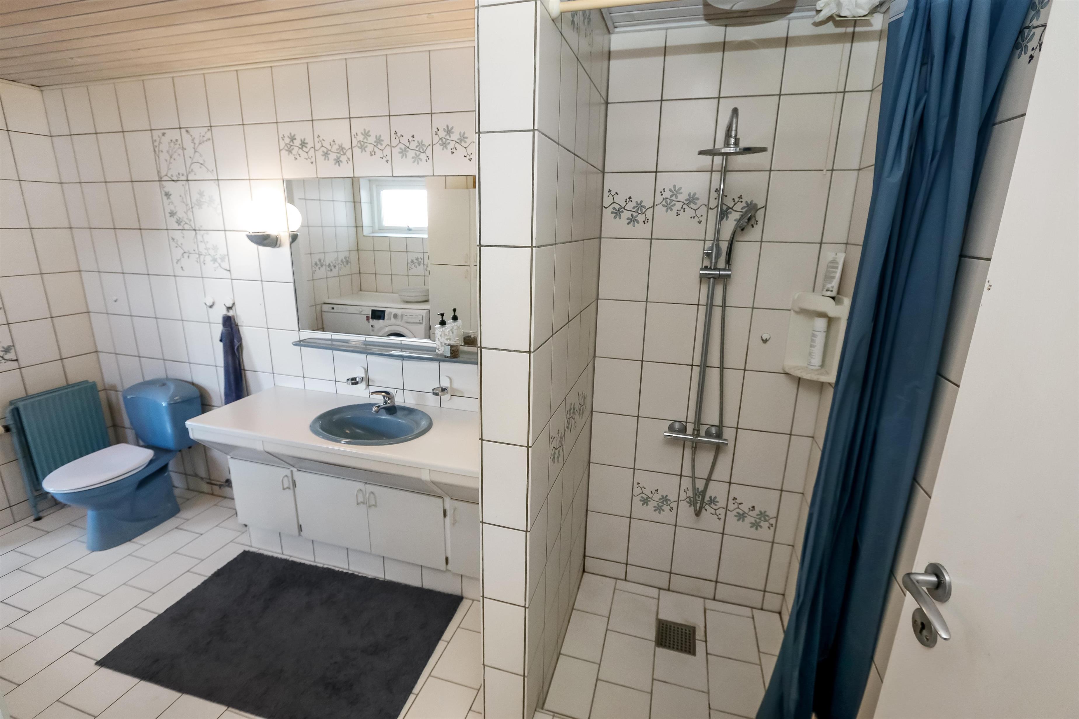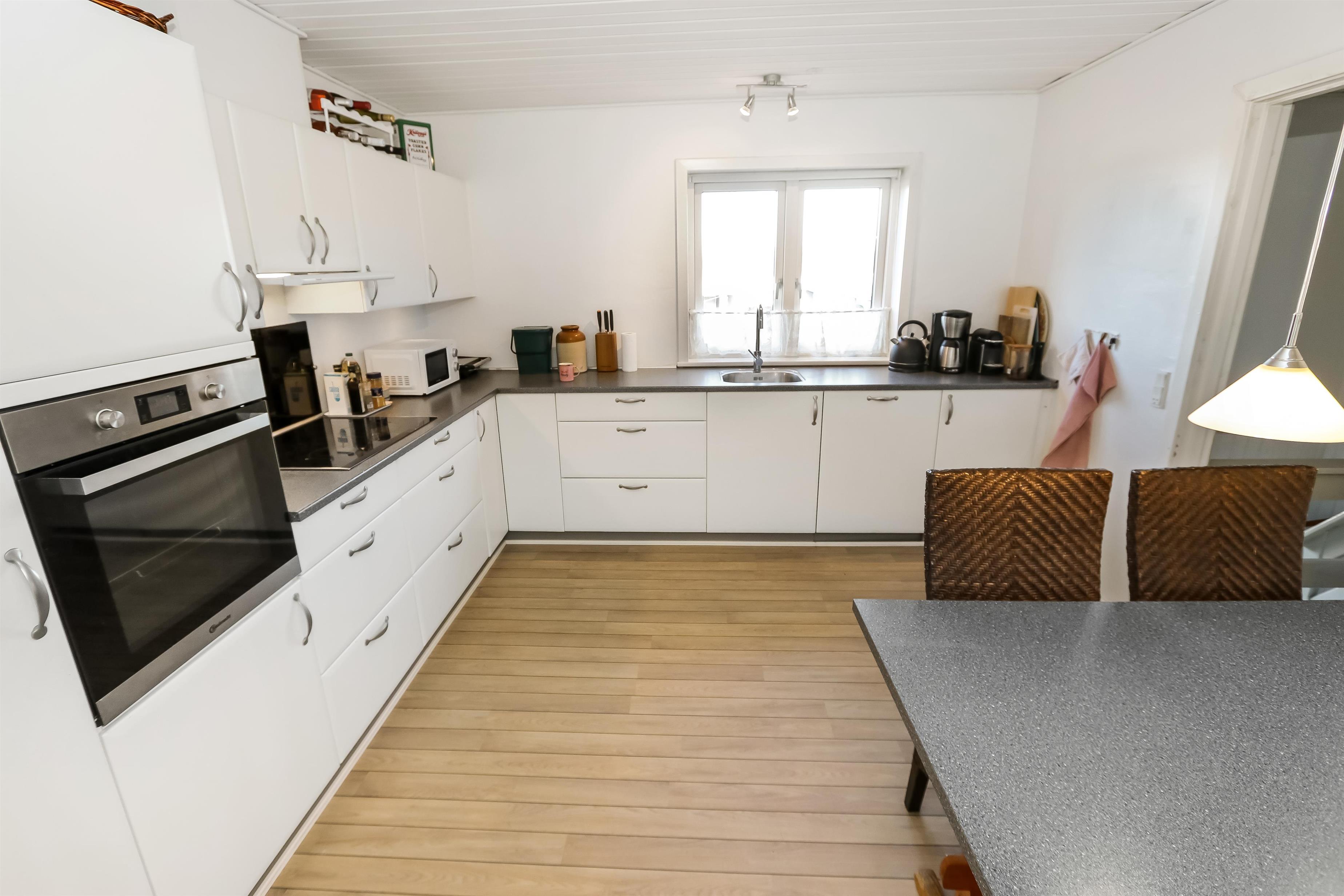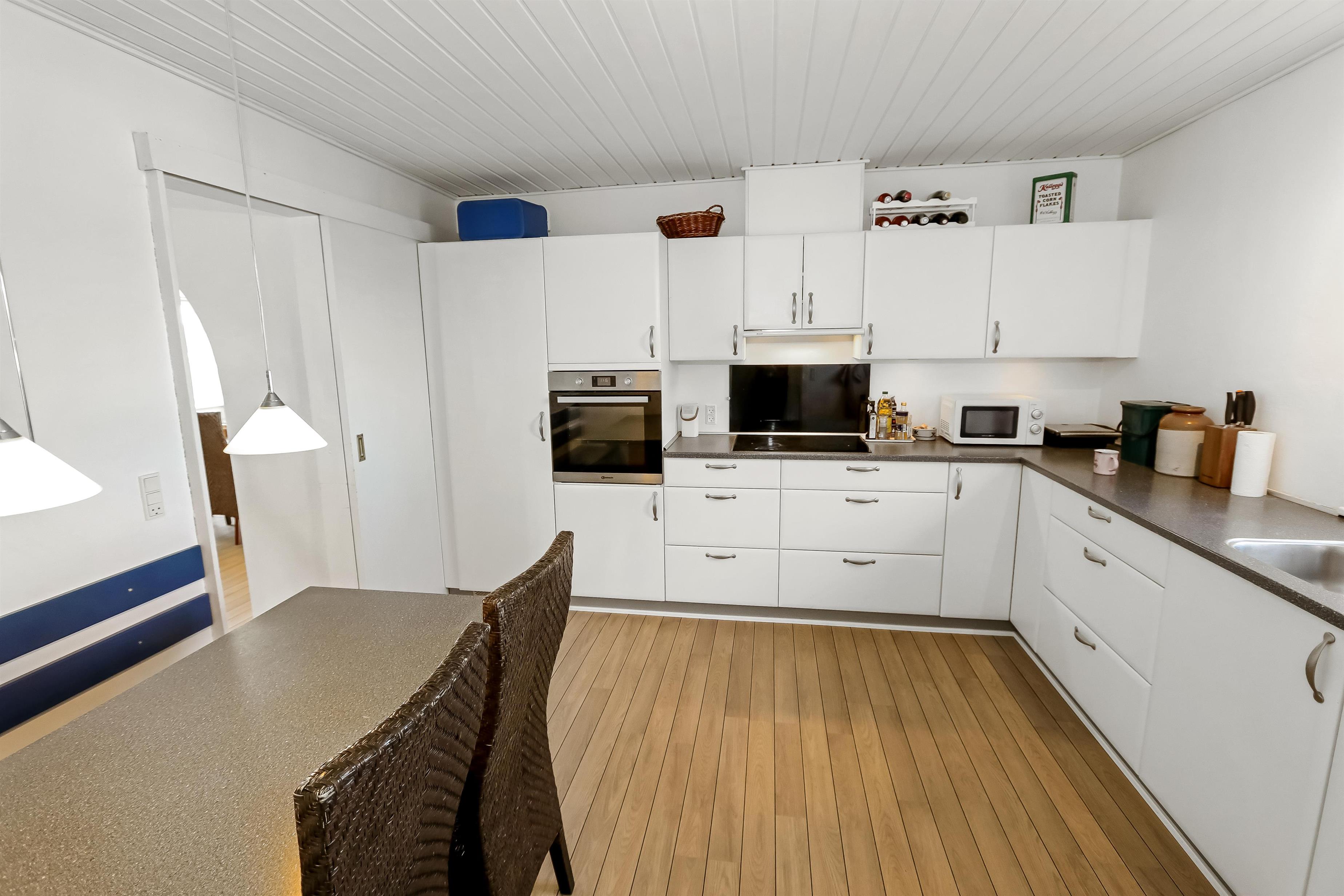 Ganzjähriges Haus auf 104 qm in 2 Etagen. Kleiner Flur mit Platz für Garderobe. Schöne neue Küche mit Essplatz, Geschirrspüler, Ceranfeld-Kochplatten, eingebauten Ofen, Abzugshaube, Mikrowelle, Kühlschrank mit Gefrierfach und schönem Blick über die hohen Dünen an der Nordsee. Wohnraum mit Ledermöbeln, TV mit dänischen und deutschen Programmen und Essplatz. Vom Flur geht eine Treppe zum großen Keller mit 1 Schlafraum mit 1DB (180 x 200 cm), Flur mit 90 L Gefriertruhe, Badezimmer mit Toilette, Waschbecken, Badewanne. Im Erdgeschoss gibt es 2 Schlafräume: 1DB (160 x 200 cm) + 1DB (160 x 200 cm). Badezimmer mit Toilette, Waschbecken und Dusche,und Waschmaschine und Trockner. Nichtraucher-Haus. 1 Haustier ist erlaubt. Die Deckenhöhe im Keller sind bloss 180 cm. Bei diesem Haus haben Sie freien zugang zur Værket in Thyborøn.