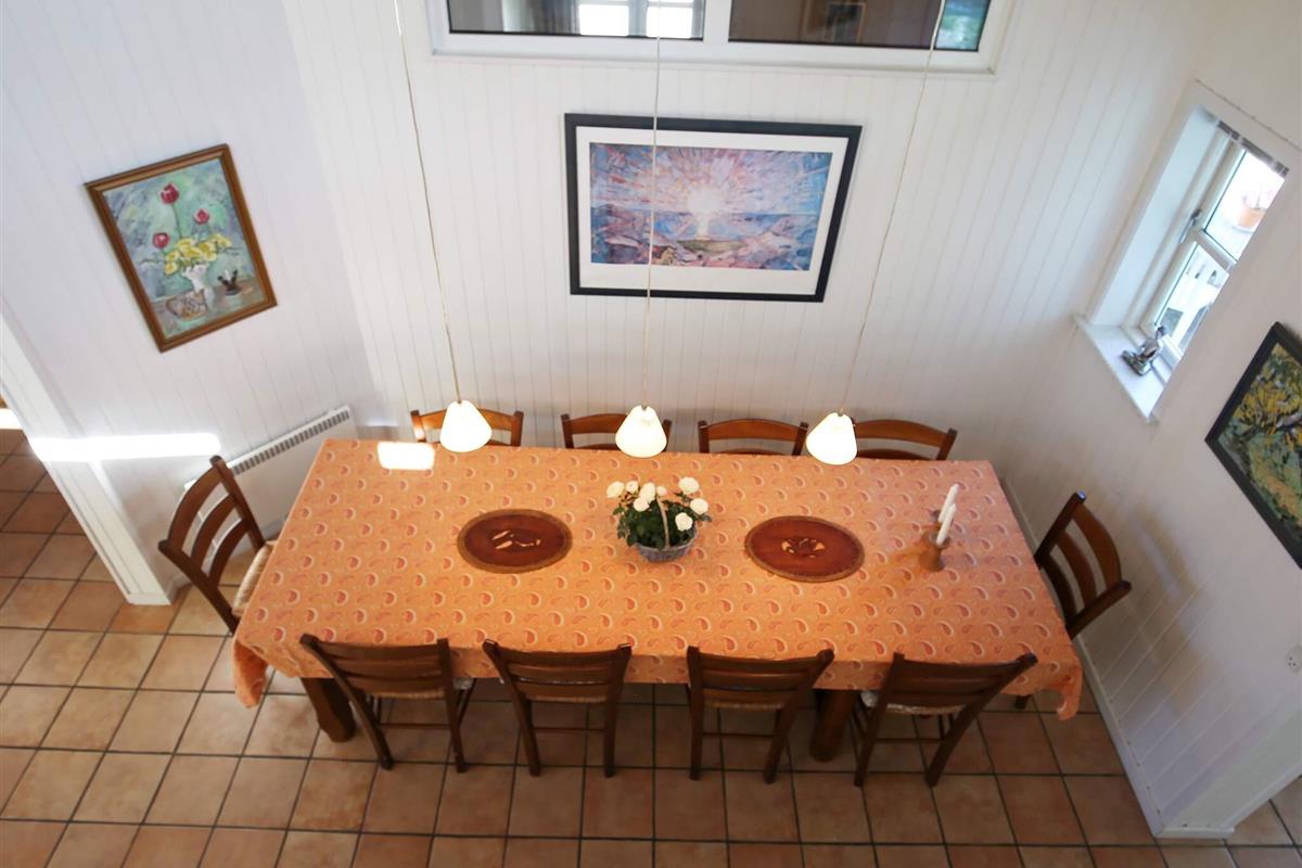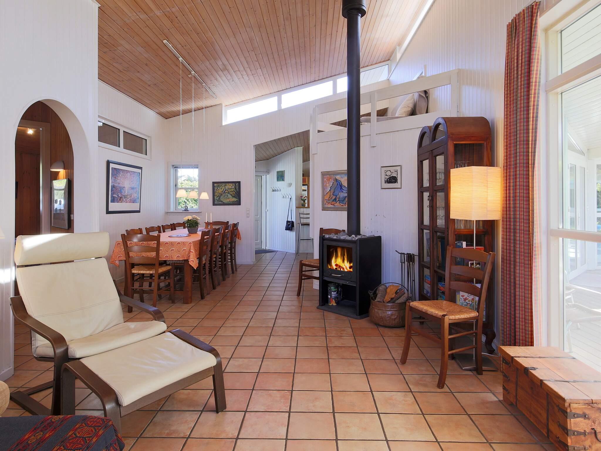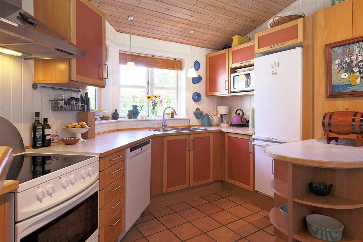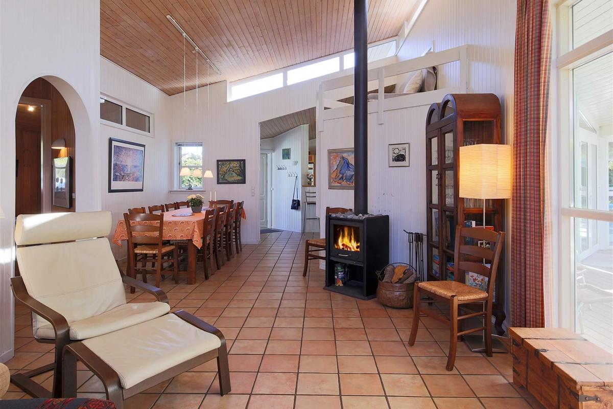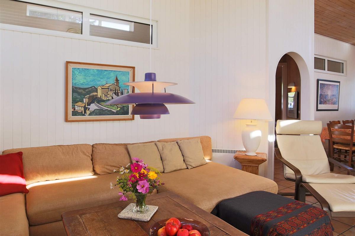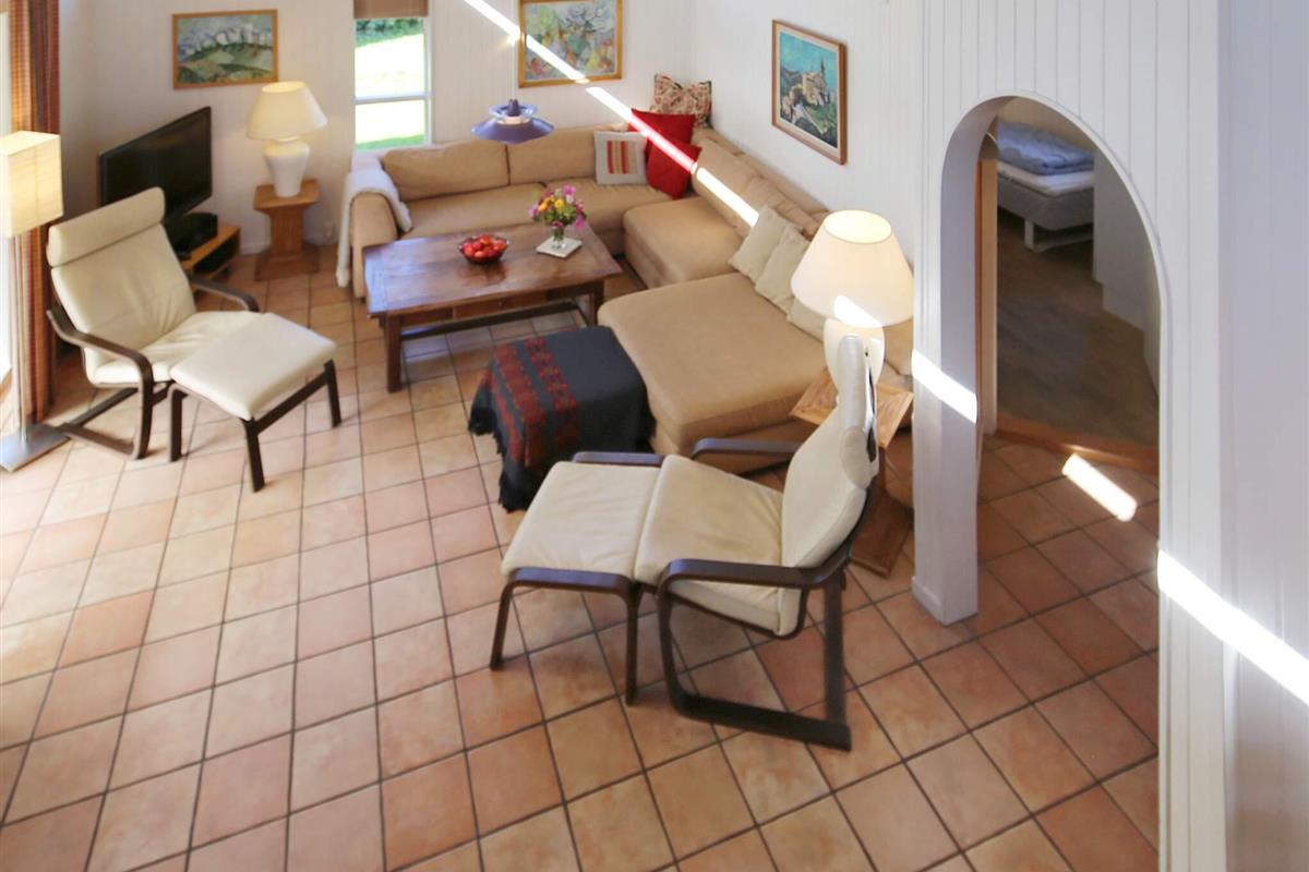 Zur guten Küchenausstattung des Hauses gehören auch Geschirrspüler, Mikrowelle, kleiner Gefrierschrank, Heißluftofen und Ceranfeld. Im geräumigen Wohn-/Essbereich, von dem aus man direkten Zutritt zum überdachten Teil der Terrasse hat, stehen ein Holzofen für kühlere Tage sowie WLAN, TV und Chromecast zum Streamen sowie DVD- und CD-Spieler zur Unterhaltung bereit.
