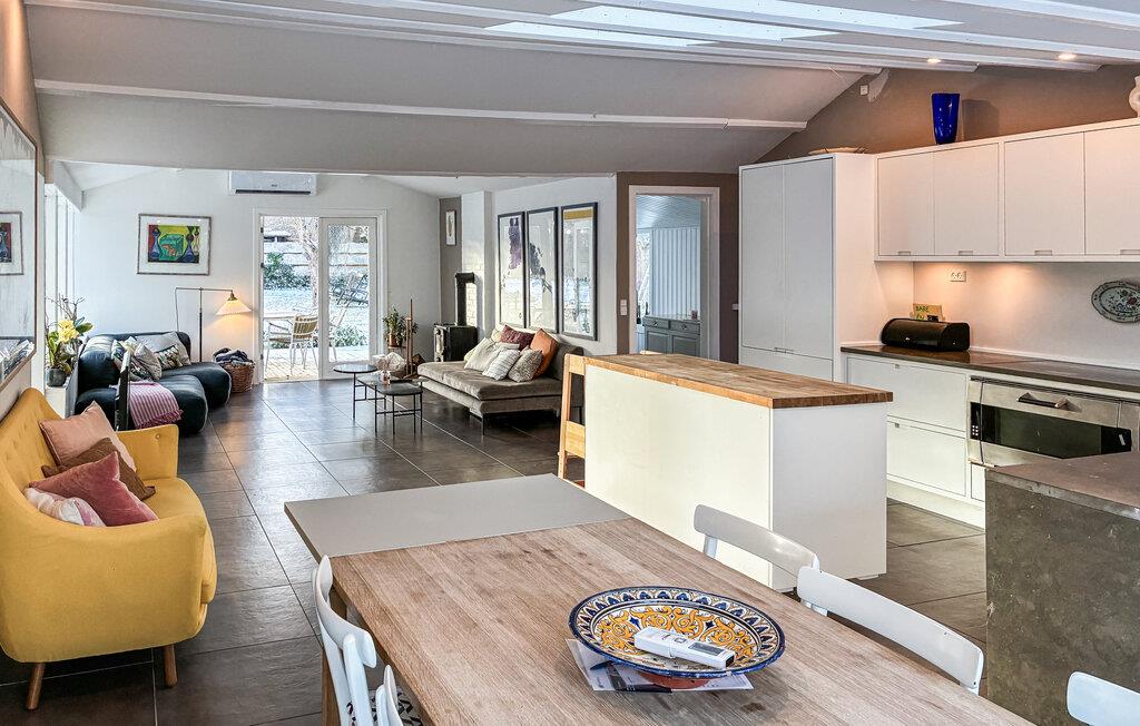 Dit huis verwelkomt je met een lichte en vriendelijke sfeer, waarin comfortabele banken, warm hout en een houtkachel zorgen voor een ontspannen sfeer. Leun hier achterover met een geurig kopje koffie, tover heerlijke maaltijden bij elkaar en eet aan de eettafel met uitzicht op het groen.