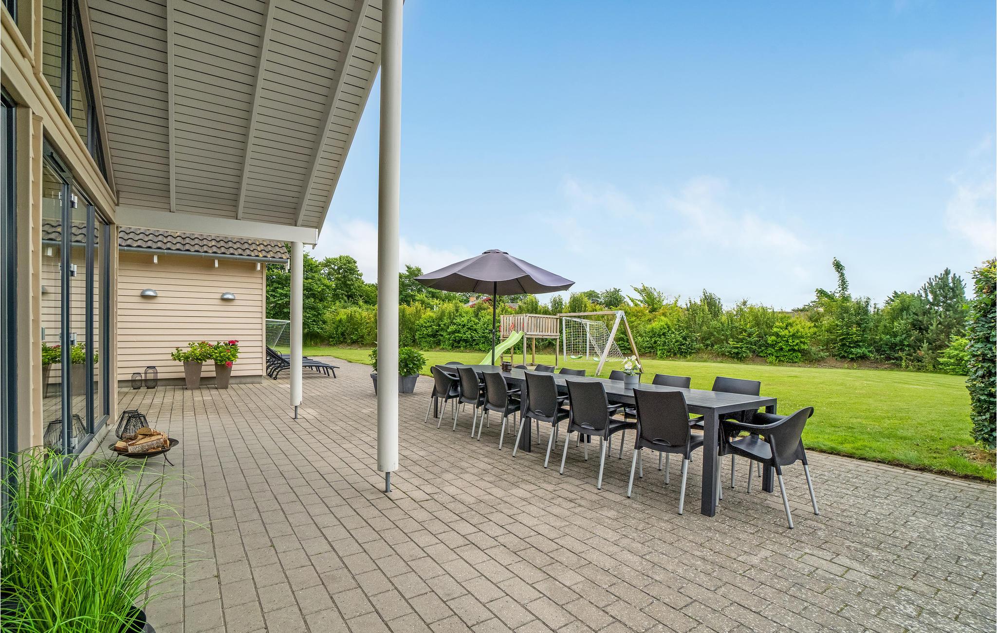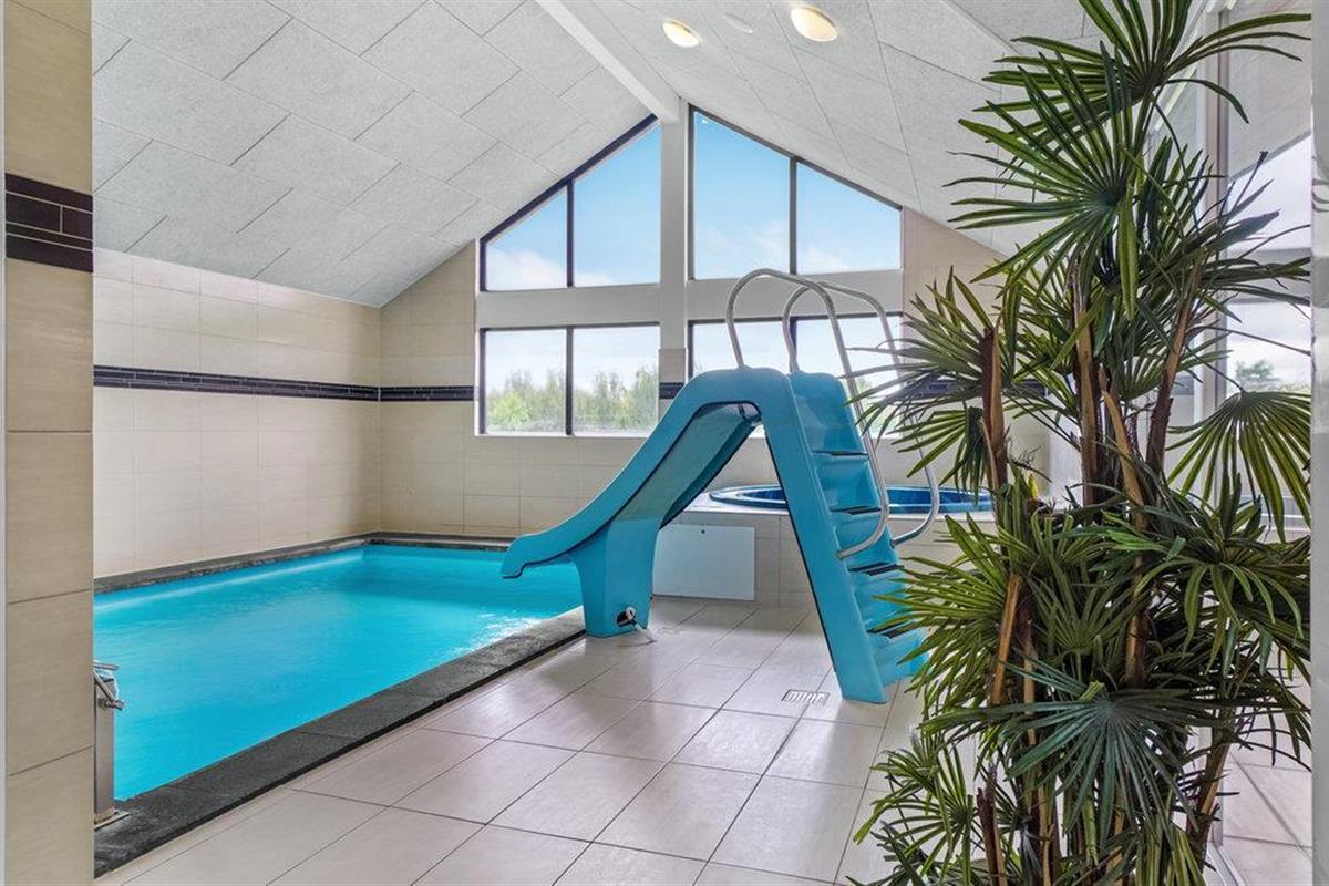 Het vakantiehuis heeft zijn eigen "waterpark", waar het zwembad een Romeinse trap, een tegenstroomsysteem en een waterglijbaan biedt. U kunt ook ontspannen in de whirlpool of opwarmen in de sauna. Er zijn voetbalgoals en een klimtoren in de tuin - kinderen en kinderzielen zullen zich hier nooit vervelen.