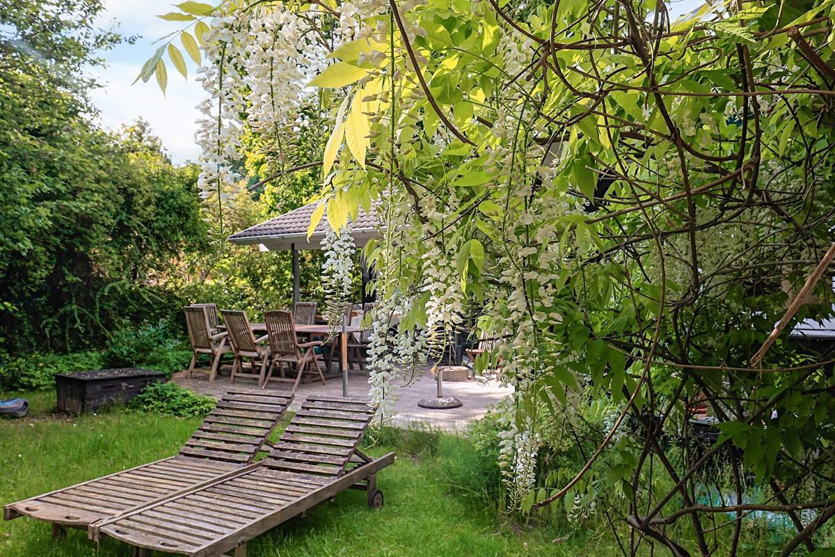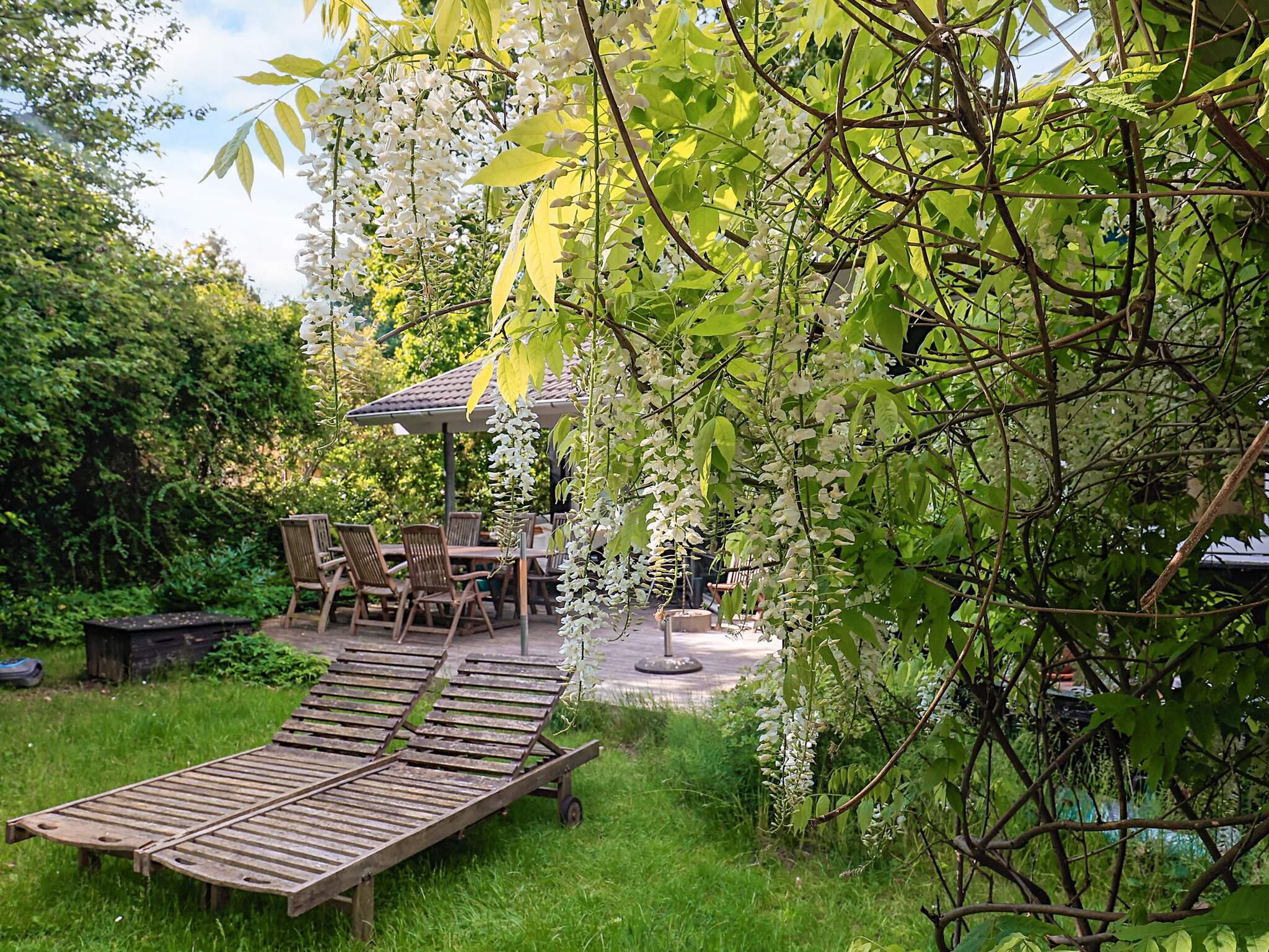 Das zugehörige Naturgrundstück mit Rasenfläche und schützenden Bäumen ringsum stellt ein Spielhäuschen sowie Grill und Gartentrampolin (Nutzung nur auf eigenes Risiko) zur Verfügung.