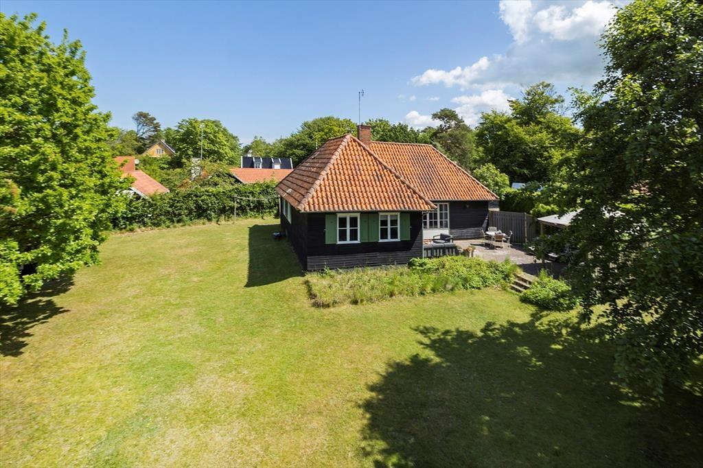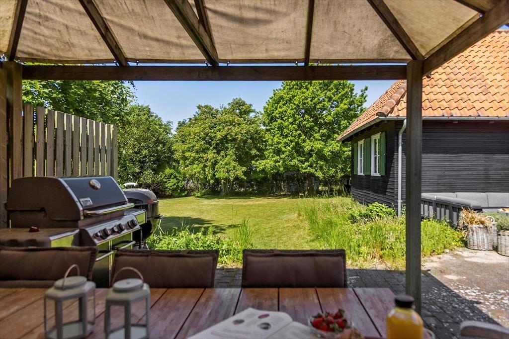 Das Ferienhaus steht auf einem ruhigen Grundstück, welches von Zäunen und hohen Hecken umgrenzt wird. Es gibt eine große Rasenfläche, kleinere Bäume und Büsche.