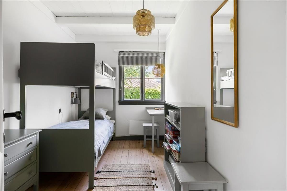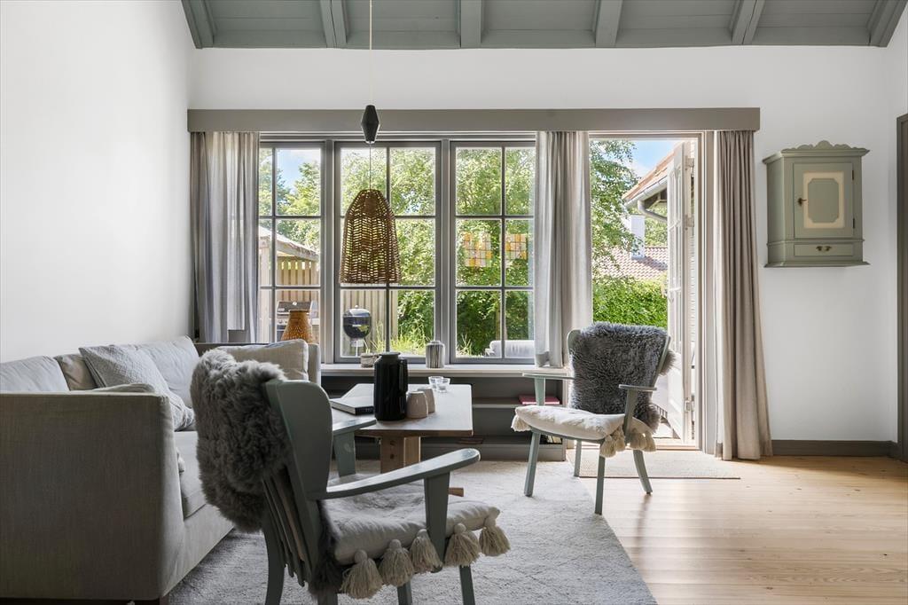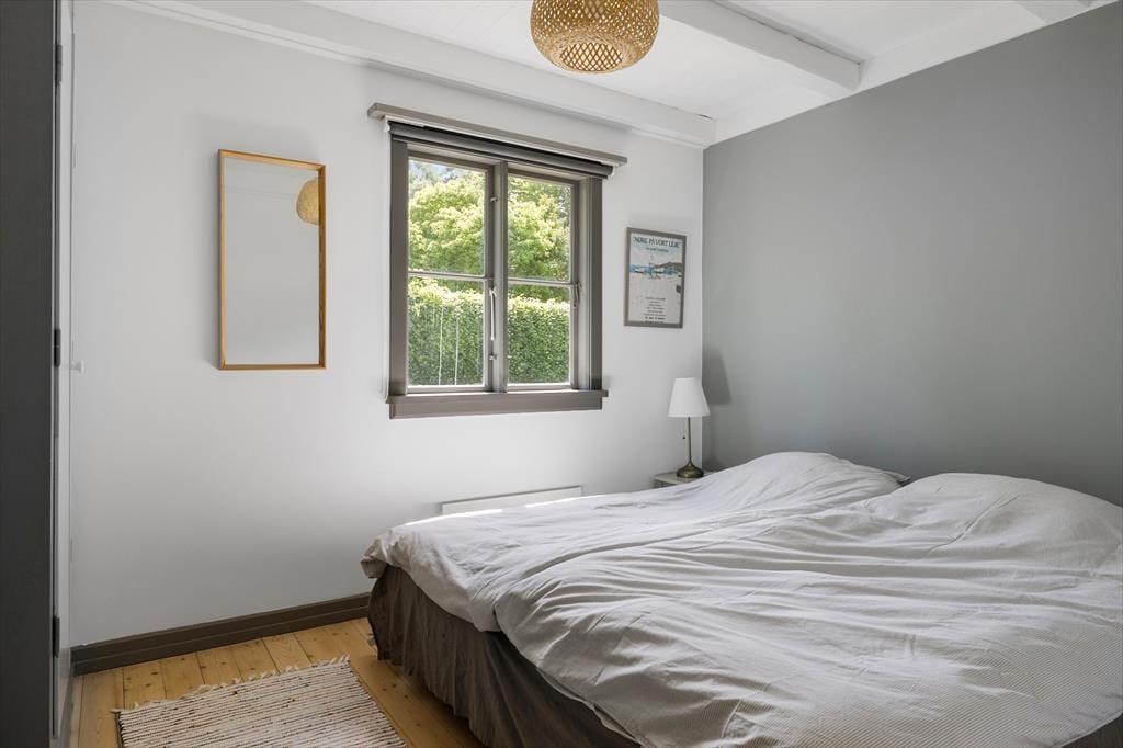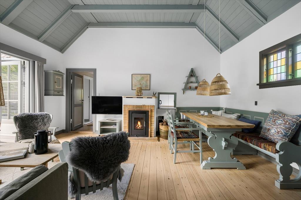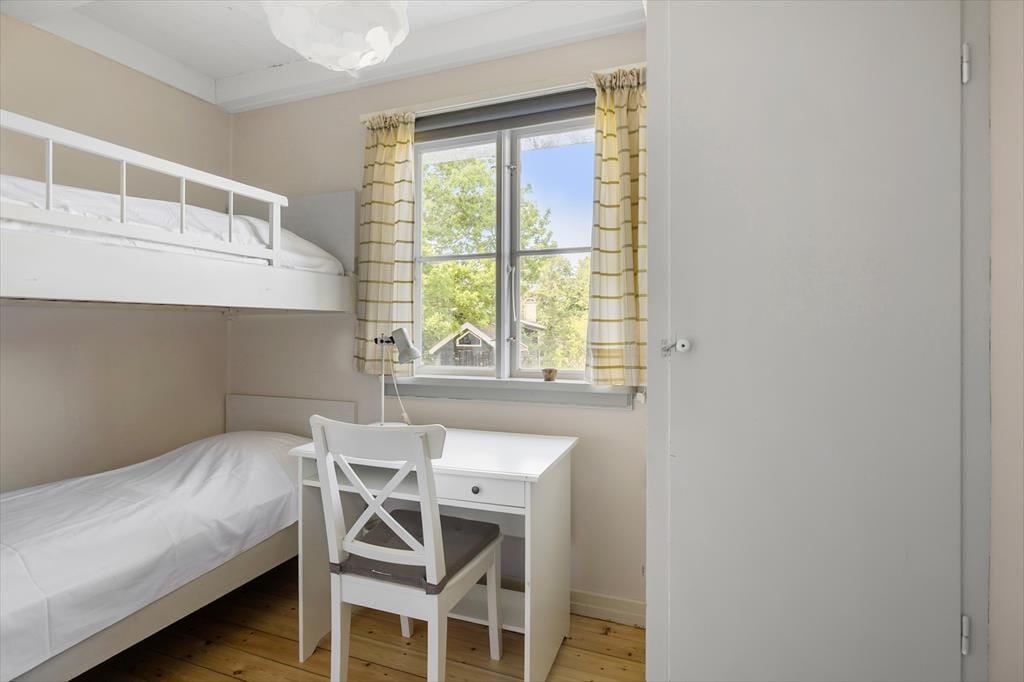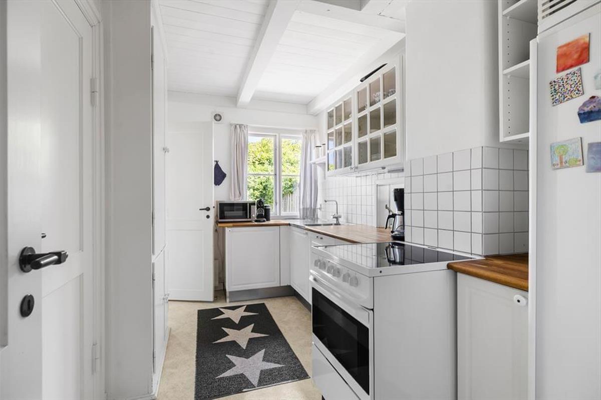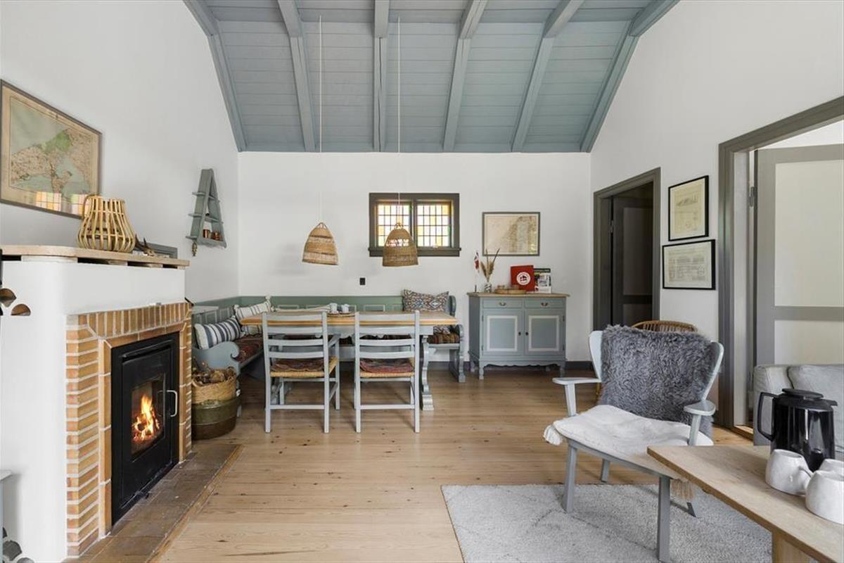 Sie betreten das Haus durch den Eingangsbereich. Von dort aus gelangen Sie in das Wohnzimmer mit Kaminofen, wo sich auch der Esstisch befindet. Die Küche verfügt über eine Durchreiche zum Esstisch. Ihnen zur Verfügung stehen zwei Schlafzimmer mit je einem Doppelbett sowie zwei weitere Zimmer mit Etagenbetten. Hinzu kommt ein modernes Badezimmer mit Duschkabine. Das Haus ist mit Sinn und Verstand gebaut und im hellen und freundlichen Sommerhaus-Stil eingerichtet. Dies hier ist ein Ferienhaus mit vielen schönen Details - und das ist es, was das Haus einzigartig macht.