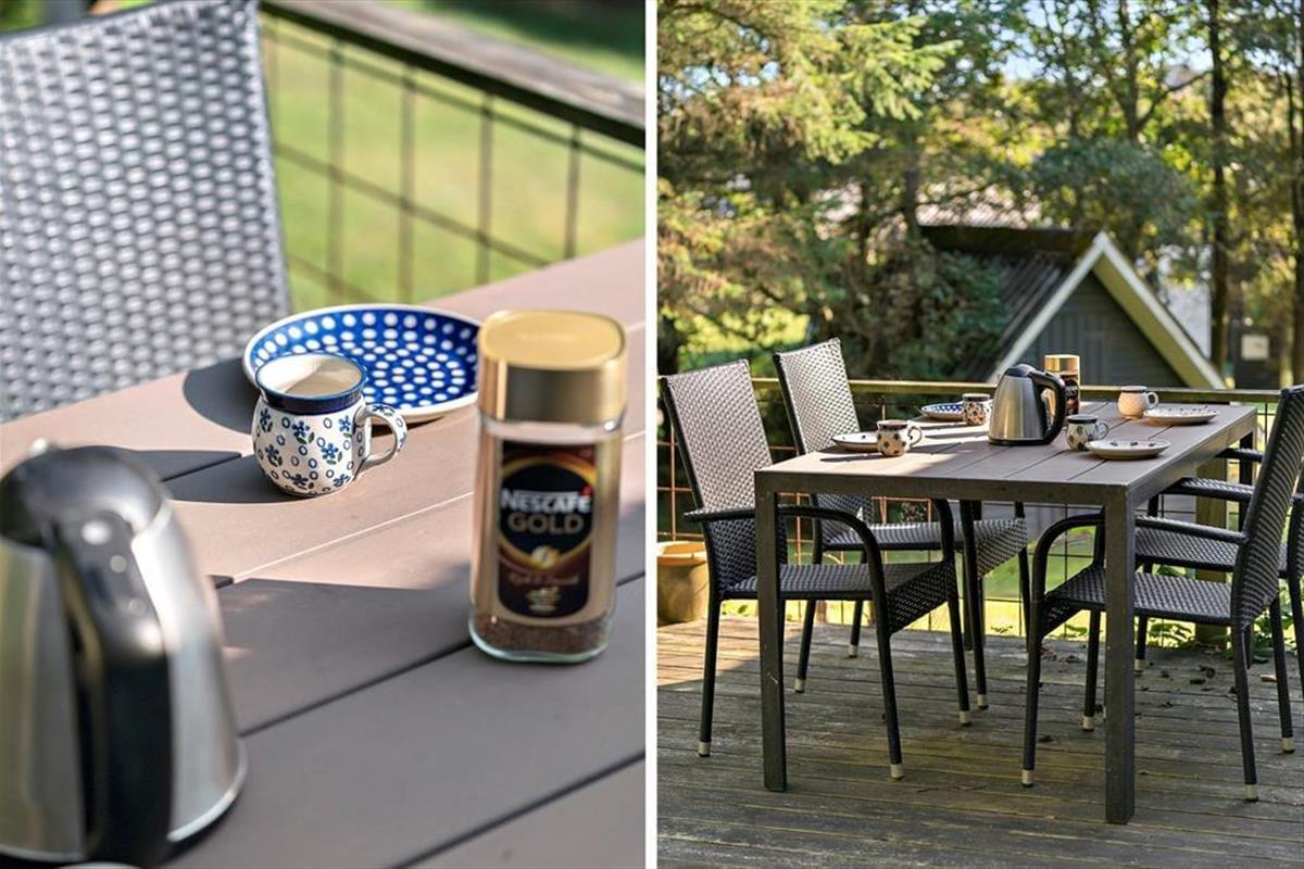 Das Ferienhausgrundstück grenzt an ein bewaldetes Areal. Die hohen Bäume, die das Haus umgeben, tragen maßgeblich zur friedvollen Atmosphäre bei. An der Ostseite des Hauses und an der Südwestseite erwarten Sie schöne Terrassen. Alternativ können Sie es sich in der Hängematte gemütlich machen oder in geselliger Runde am Lagerfeuer beisammensitzen.