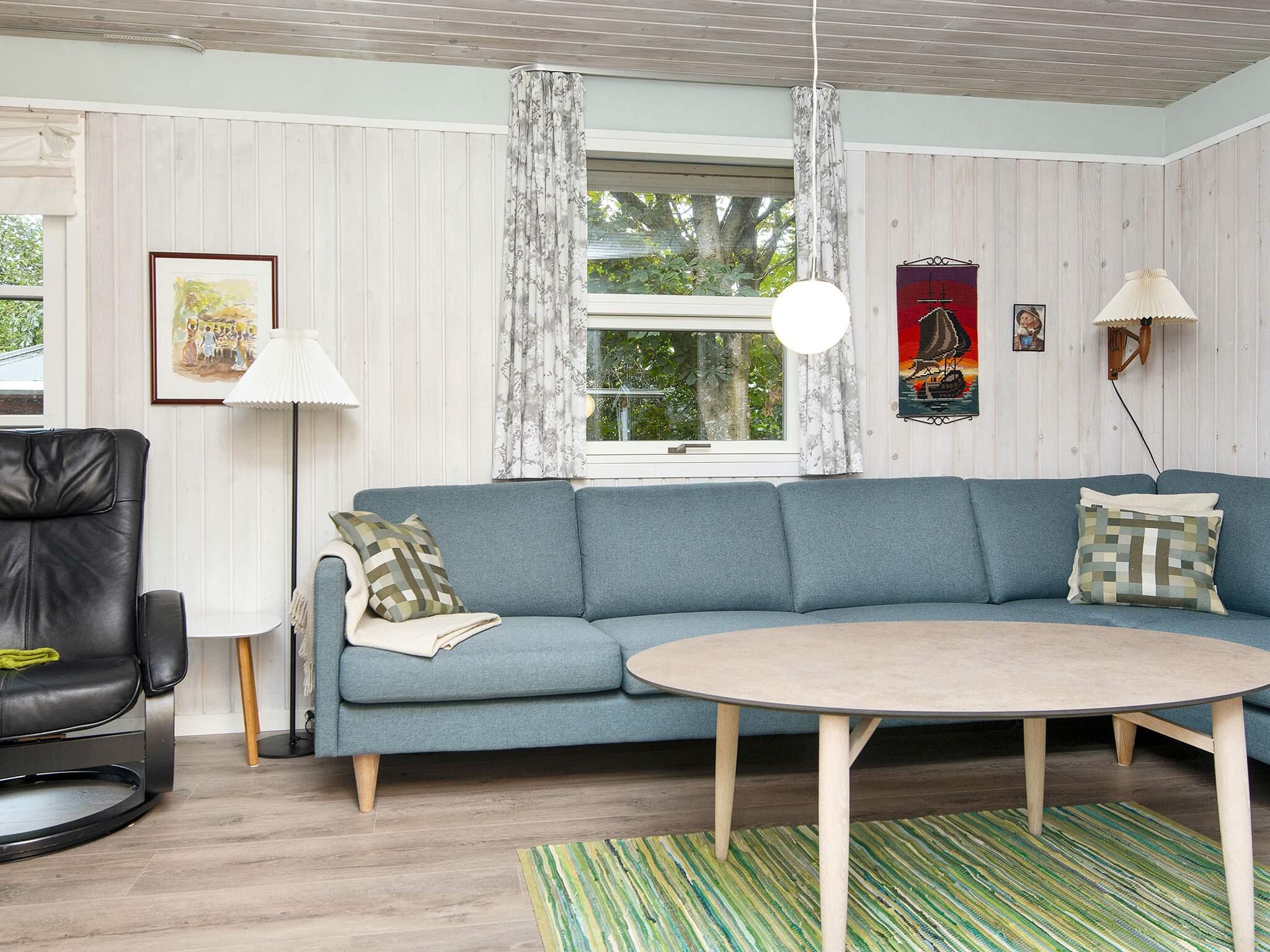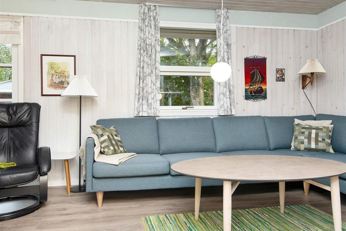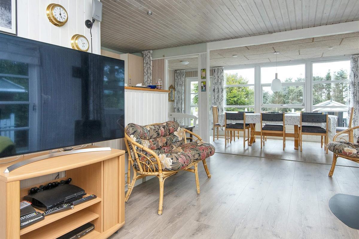 Das Ferienhaus ist hell und gemütlich eingerichtet und hat ein großes Wohnzimmer mit direktem Zugang zur Terrasse. An das Wohnzimmer schließt sich ein schöner, heller Wintergarten an, von dem aus man Panoramablick ins Grüne hat. Praktische Einrichtung und familienfreundliche Wohnküche im Haus. Die Küche ist u.a. ausgestattet mit Ceranfelder, Minibackofen, Mikrowelle und Geschirrspüler. Im Wohnzimmer gibt es bequeme Möbel, Flachbildfernseher mit freien dänischen Sendern und WLAN. Für kühlere Tage steht ein gemütlicher Holzofen bereit.