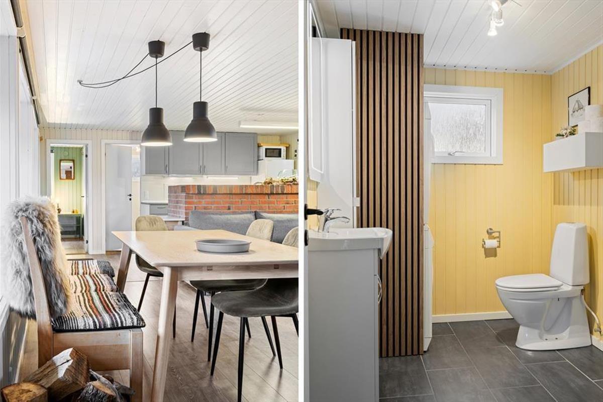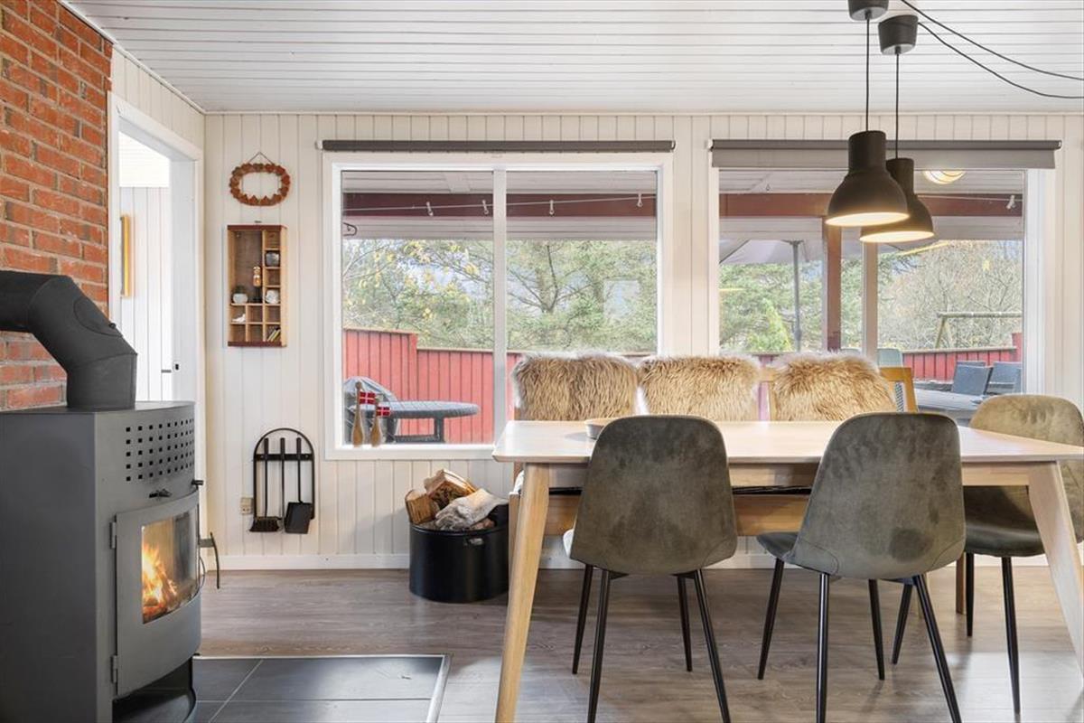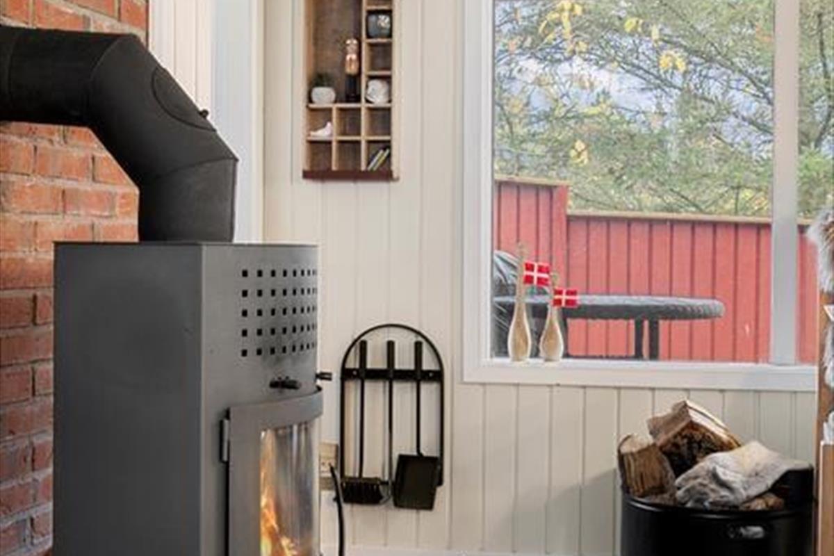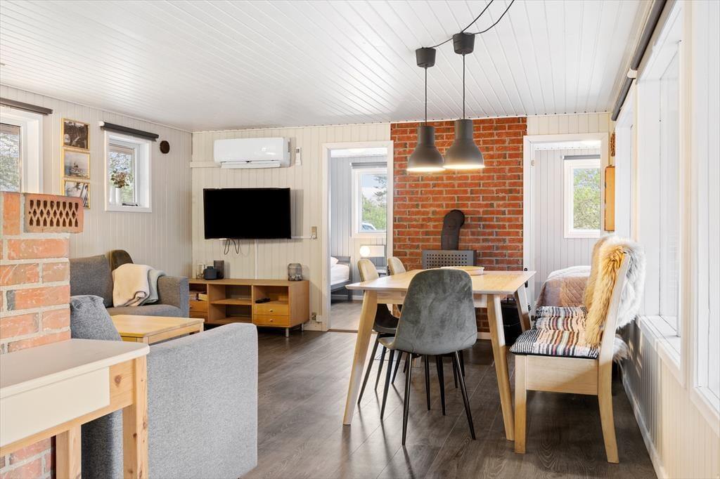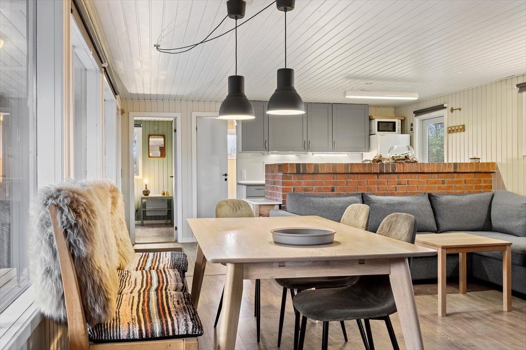 Hinter der rot gestrichenen Holzfassade erwartet dich eine gemütliche Einrichtung mit schönen Möbeln und warmen Farben, die für eine entspannte Urlaubsatmosphäre sorgen. Das Ferienhaus hat drei Schlafzimmer und ein Badezimmer. Der Mittelpunkt des Hauses ist der offene Wohnbereich, in dem Küche und Wohnzimmer miteinander verbunden sind. Hier kannst du mit deiner Familie oder deinen Freunden Brettspiele spielen, ein gutes Buch lesen, gemeinsam kochen oder einfach die Zeit zusammen genießen. An kühleren Tagen kannst du den Kamin anzünden und den Duft von selbst gebackenem Kuchen aus der Küche genießen. An warmen Sommertagen kannst du die Terrassentür offenlassen, damit drinnen und draußen ineinander übergehen.