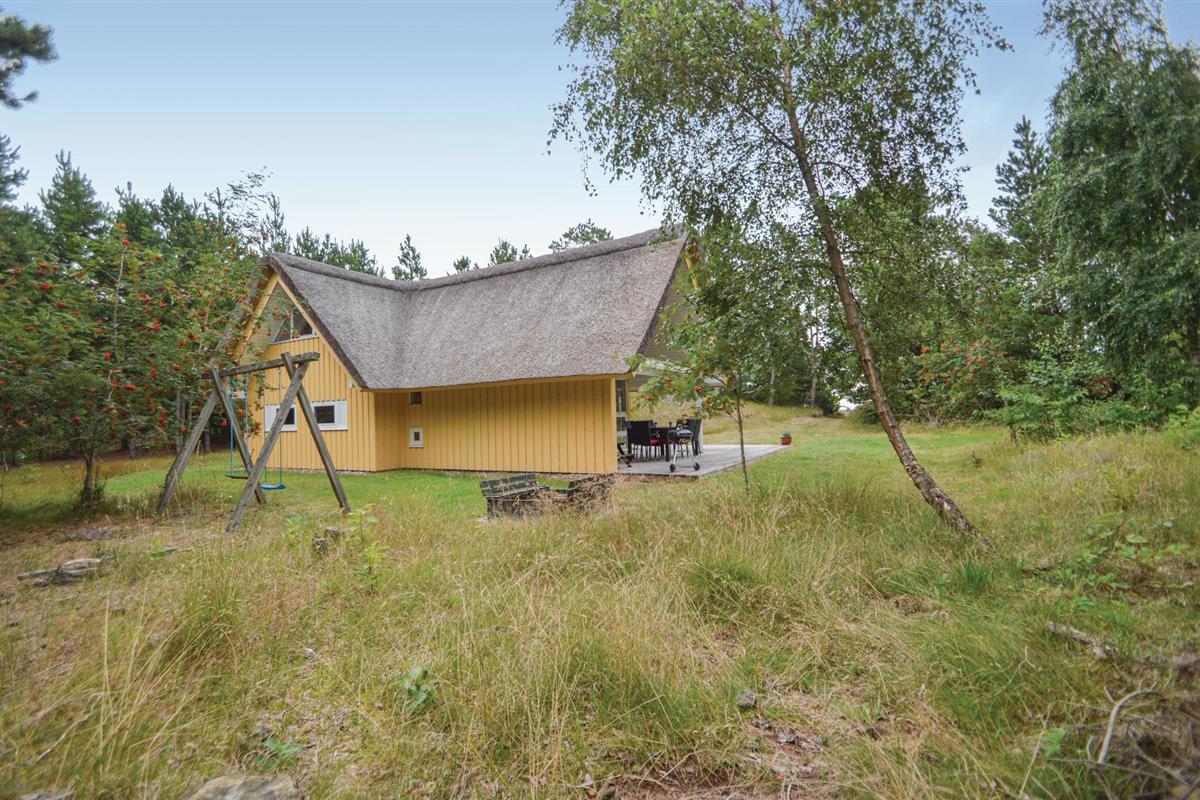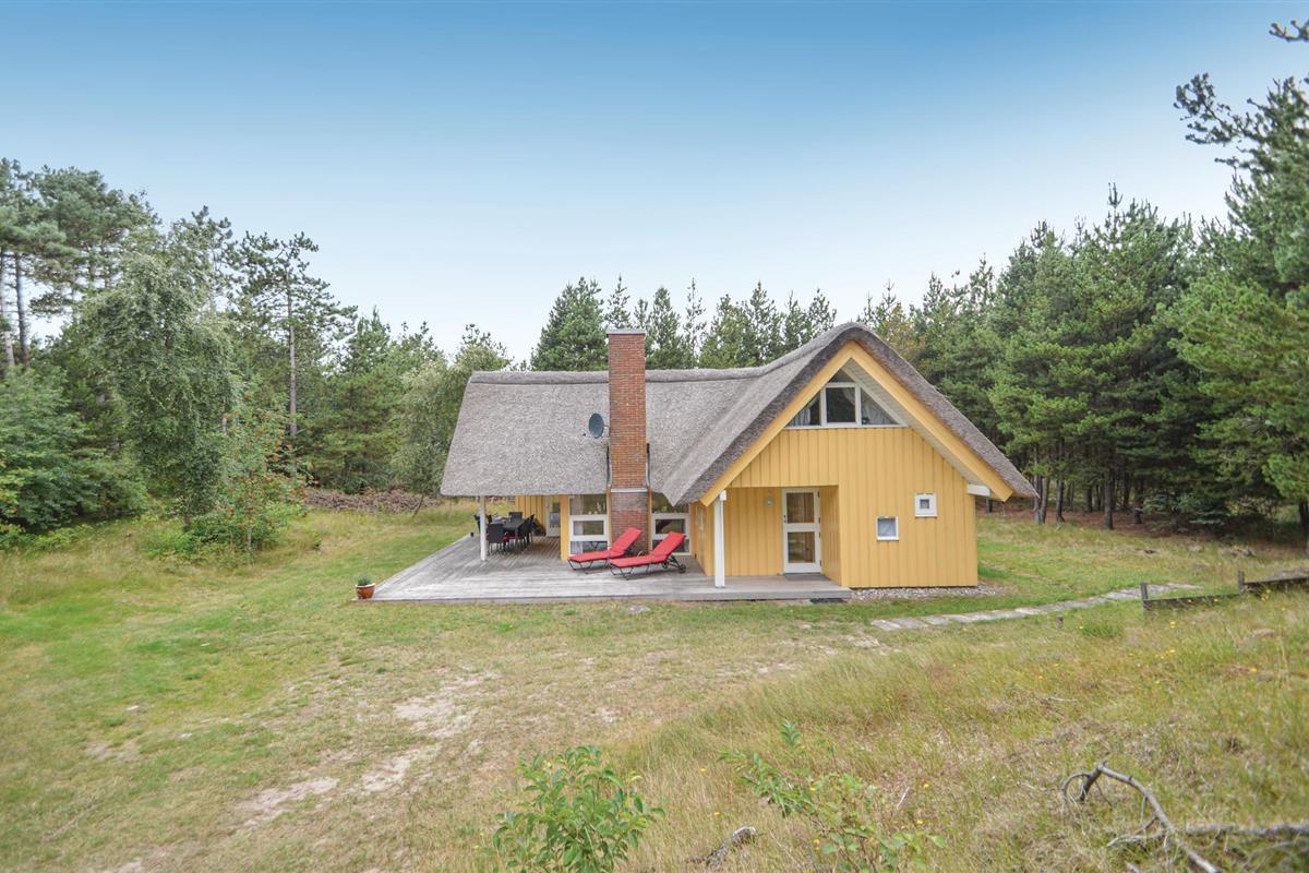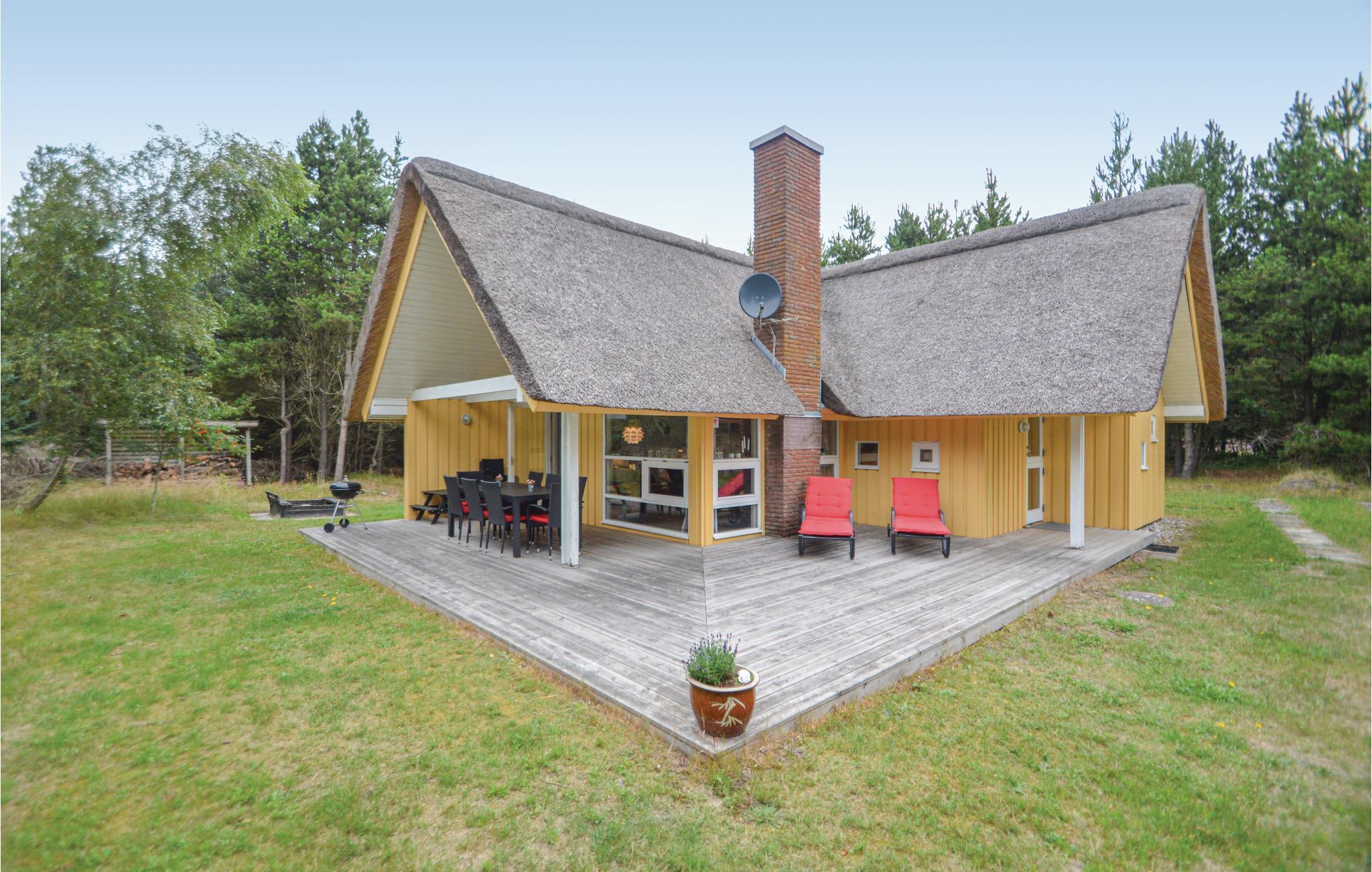 Mooi, rietgedekt vakantiehuis op een heuvelachtig perceel. De tuin is omringd door bomen en biedt daardoor zon en schaduw naar behoefte. Je leeft hier heel dicht bij de natuur en misschien zie je wel een hert in de tuin. Als het buiten koeler wordt, kun je lekker knus voor de houtkachel zitten. De keuken ligt in het midden van het huis en vanuit de hoekkamer stap je op het overdekte terras. Eén slaapkamer bevindt zich op de begane grond en heeft een tweepersoonsbed. De andere twee slaapkamers liggen op de bovenverdieping en hebben elk twee eenpersoonsbedden.