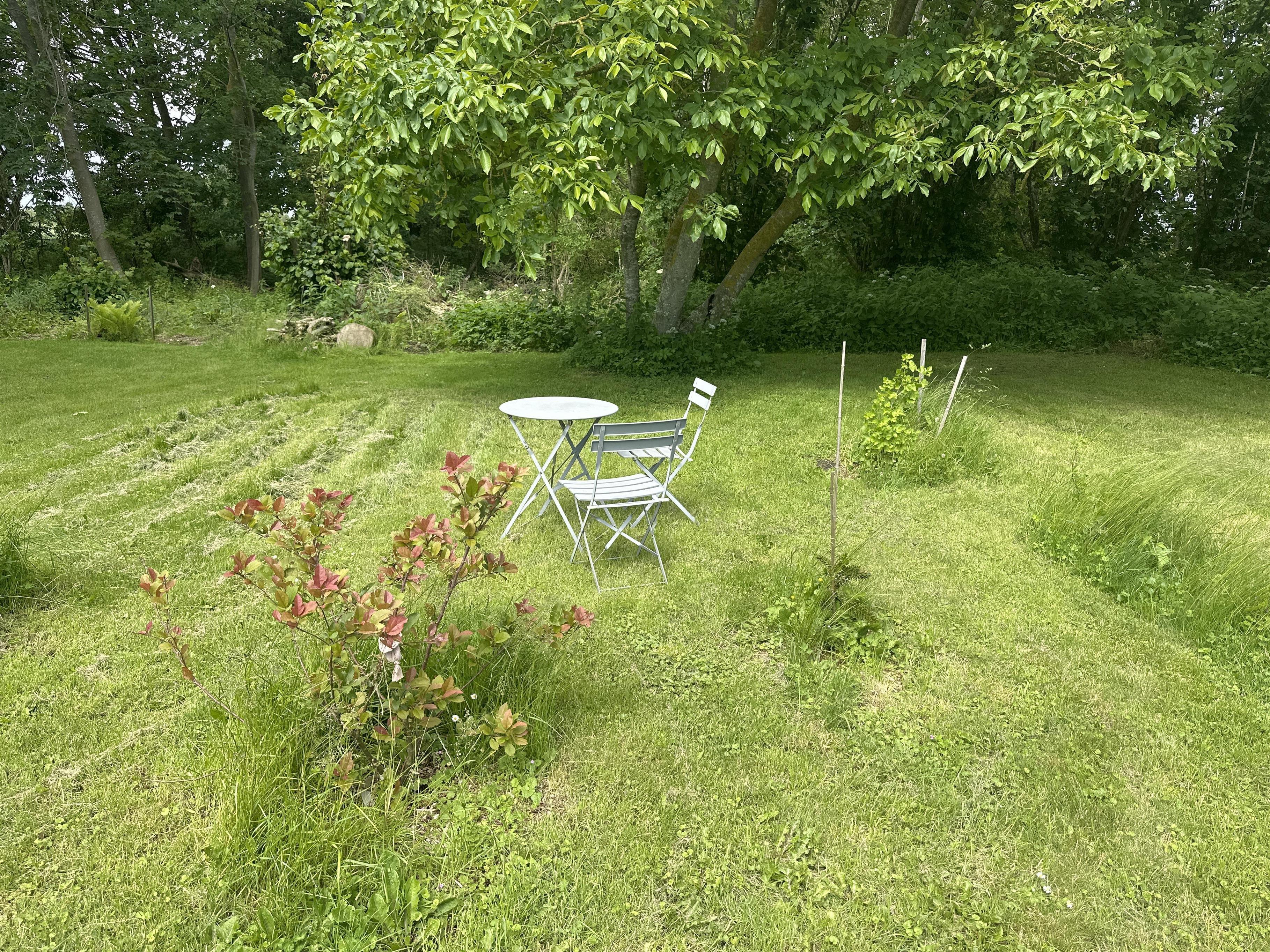 Outside, there is a small patio where you can enjoy your first cup of coffee of the day on the bench. To the east, you have access to a corner of the natural garden with a café table and chairs – a peaceful place to enjoy the sun, read a book or just relax.