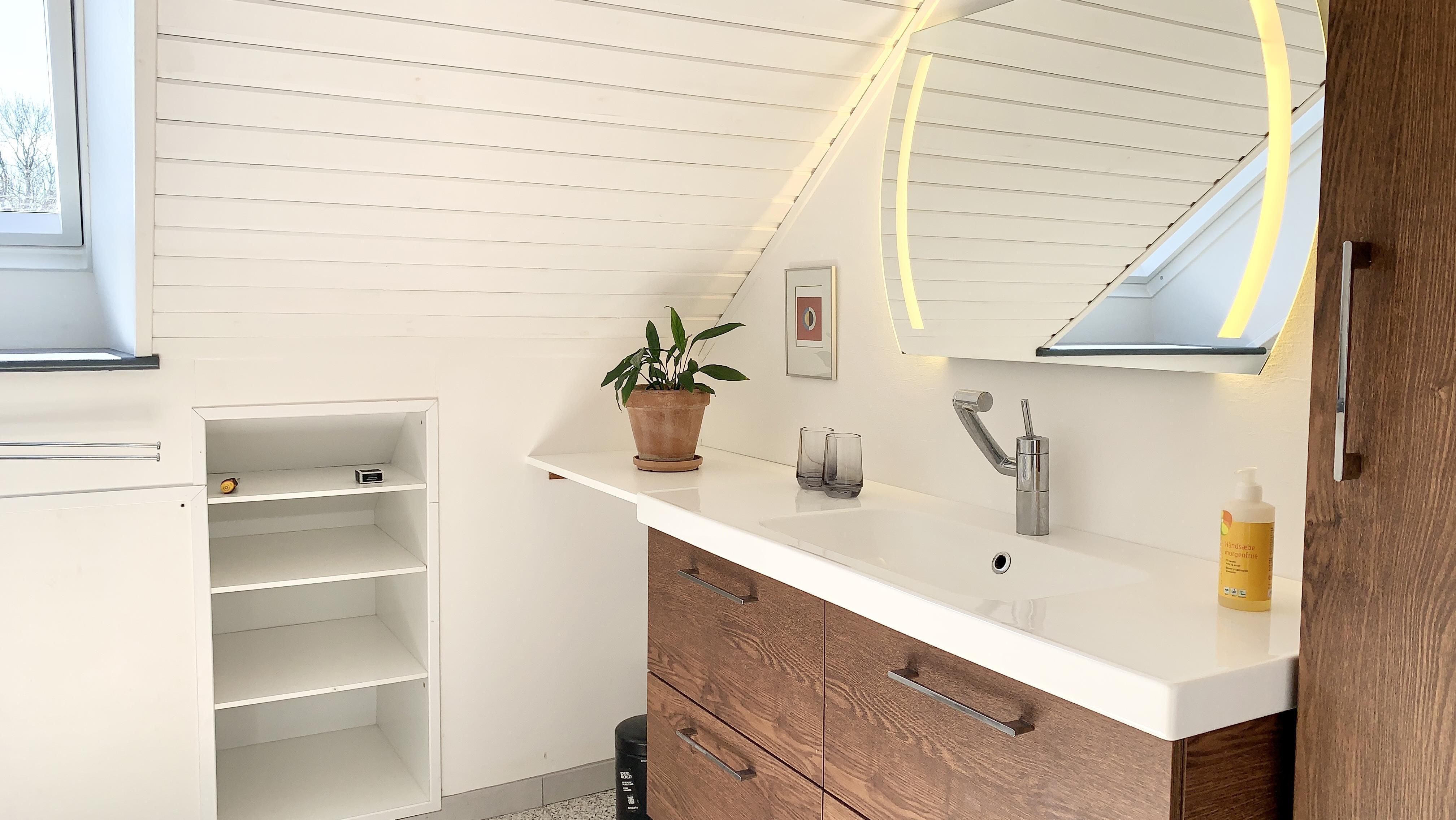 The large kitchen-living room invites you to relax – here you can prepare your meals, enjoy them at the dining table and then relax in the cosy sofa corner. The spacious bedroom with double bed ensures you a good night's sleep, and the modern bathroom completes the comfort of the accommodation.