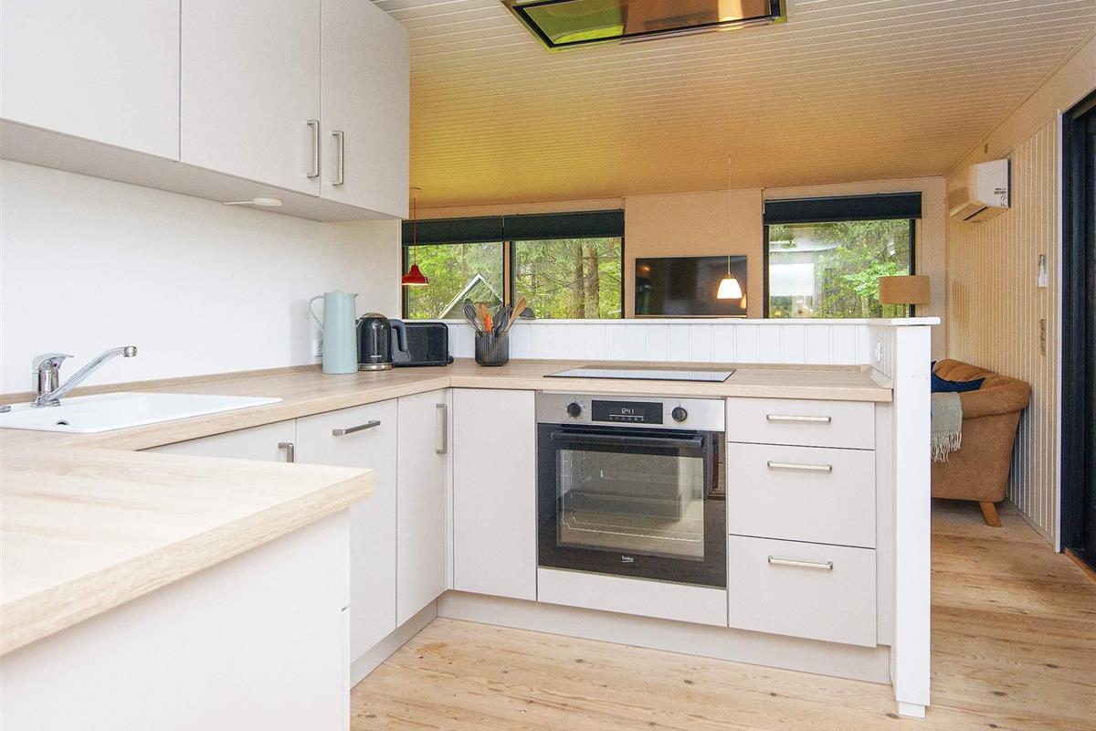 Die 15 m² große, überdachte Terrasse, die sich nahtlos in die Wohnküche einfügt, verfügt über einen Grill- und Essbereich. Das Haus liegt auf einem 2.700 m² großen, umzäunten Grundstück an einer ruhigen Waldstraße. Das Grundstück ist allseitig mit Büschen und hohen Bäumen bewachsen und wirkt wie ein echtes Naturgrundstück. Für Kinder gibt es viel Platz zum Spielen zwischen den Bäumen.