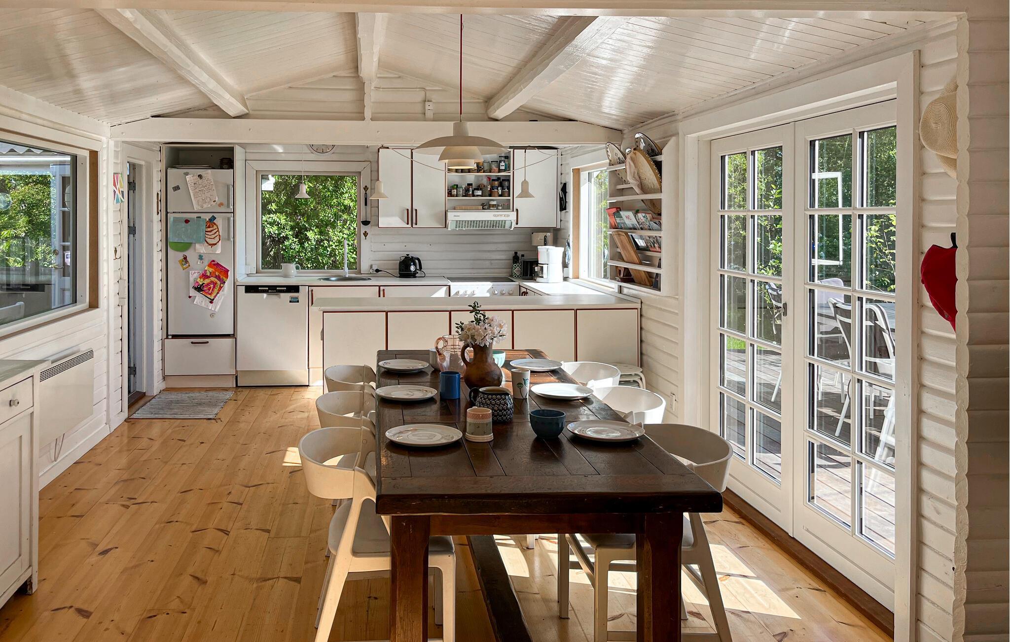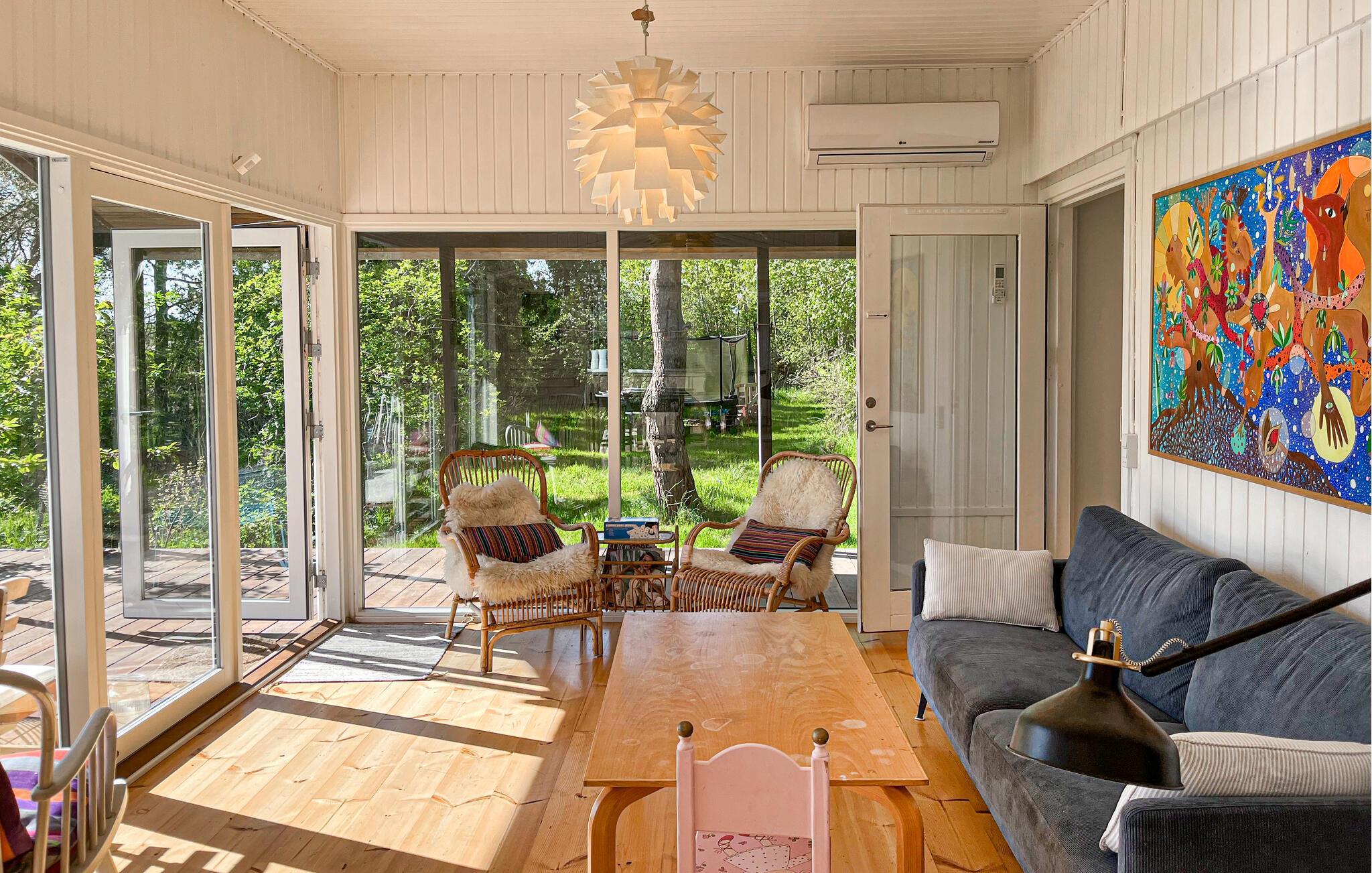 Dit uitnodigende vakantiehuis verwent je met een licht en gezellig ingericht interieur, waar je dankzij de ramen van vloer tot plafond kunt genieten van een prachtig uitzicht op de fjord en de idyllische tuin. Laat in de zomer de aangename bries door de kamers stromen terwijl je samen van je maaltijden geniet in de lichte woonkamer. In de winter zorgt een houtkachel voor extra gezelligheid voor ontspannen leessessies of gezellige spelletjesavonden.