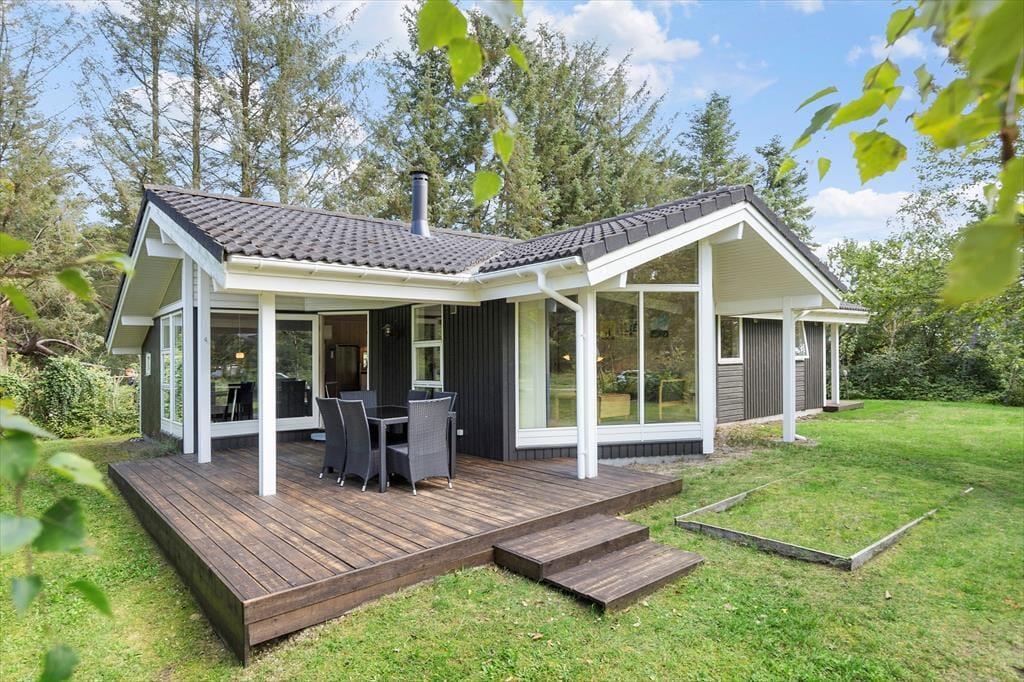 Dein helles, angenehm luftig wirkendes Ferienhaus ist ein schönes Urlaubsdomizil, in dem du dich in vollen Zügen entspannen und die Nähe deiner Familie genießen kannst. Das Haus begrüßt dich mit einem fantastischen Küchen-, Wohn- und Essbereich, der im Nu zum Sammelpunkt aller Familienmitglieder avancieren wird. Die moderne Küche schließt offen an den Wohnraum, sodass du selbst während der Zubereitung der täglichen Mahlzeiten viel Nähe und Gesellschaft genießt. Der im Wohnraum platzierte Kaminofen verwöhnt mit seiner behaglichen Wärme und seinem romantischen Knistern, das gemütliche Stunden im Kreise deiner Lieben wunderschön untermalt. Sicher werdet ihr gerne am Esstisch beisammensitzen und Gesellschaftsspiele spielen, euch auf dem Sofa entspannen, lesen oder gemeinsam einen spannenden Film anschauen. Platz hierfür ist reichlich vorhanden. Wenn du ein wenig frische Luft schnappen möchtest, kannst du hinaus auf die attraktive Holzterrasse treten, die zum Genießen eines frischen Kaffees am Morgen und zu geselligen Grillabenden einlädt - untermalt vom fröhlichen Vogelgezwitscher. Das Badezimmer präsentiert sich angenehm geräumig und lädt mit seinem Whirlpool zu traumhaft erholsamen Momenten voller Wellnessflair ein. Zu den praktischen Annehmlichkeiten zählen eine Waschmaschine und ein Wickelplatz für die Kleinen. Erholsame Nächte versprechen die drei Schlafräume, von denen einer mit einem großen Doppelbett eingerichtet ist. In den anderen beiden Schlafräumen stehen jeweils zwei Einzelbetten bereit.