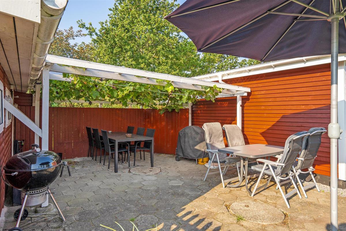 Ontspan op het gedeeltelijk overdekte terras in comfortabel tuinmeubilair, geniet van de lange zomeravonden en het buitenleven.