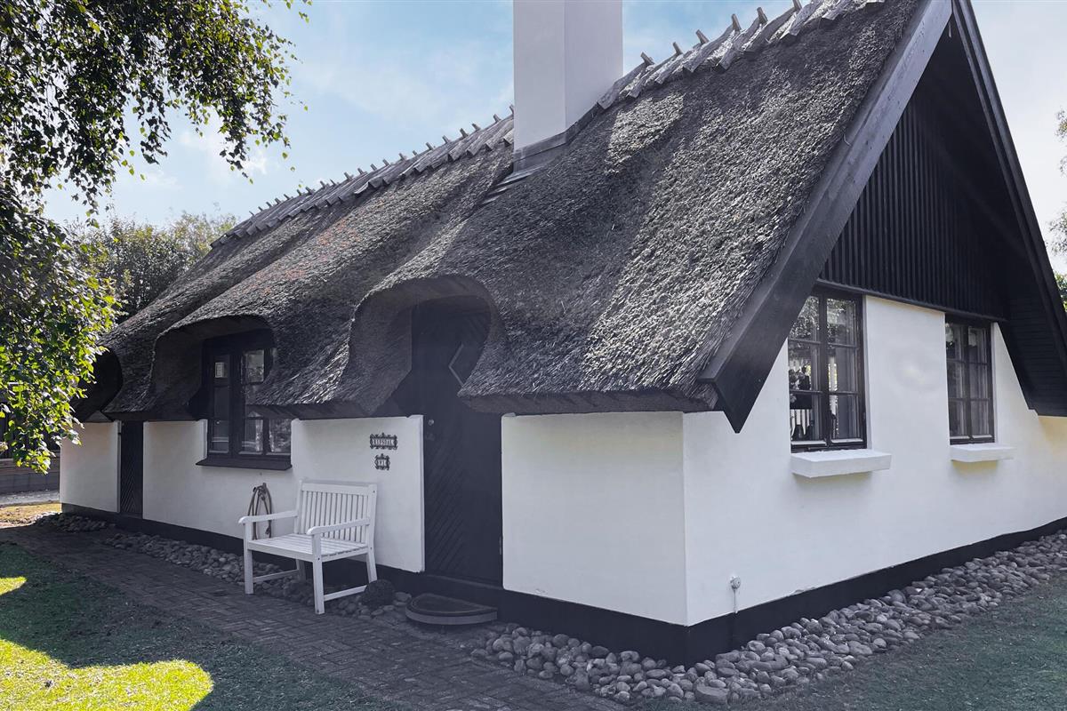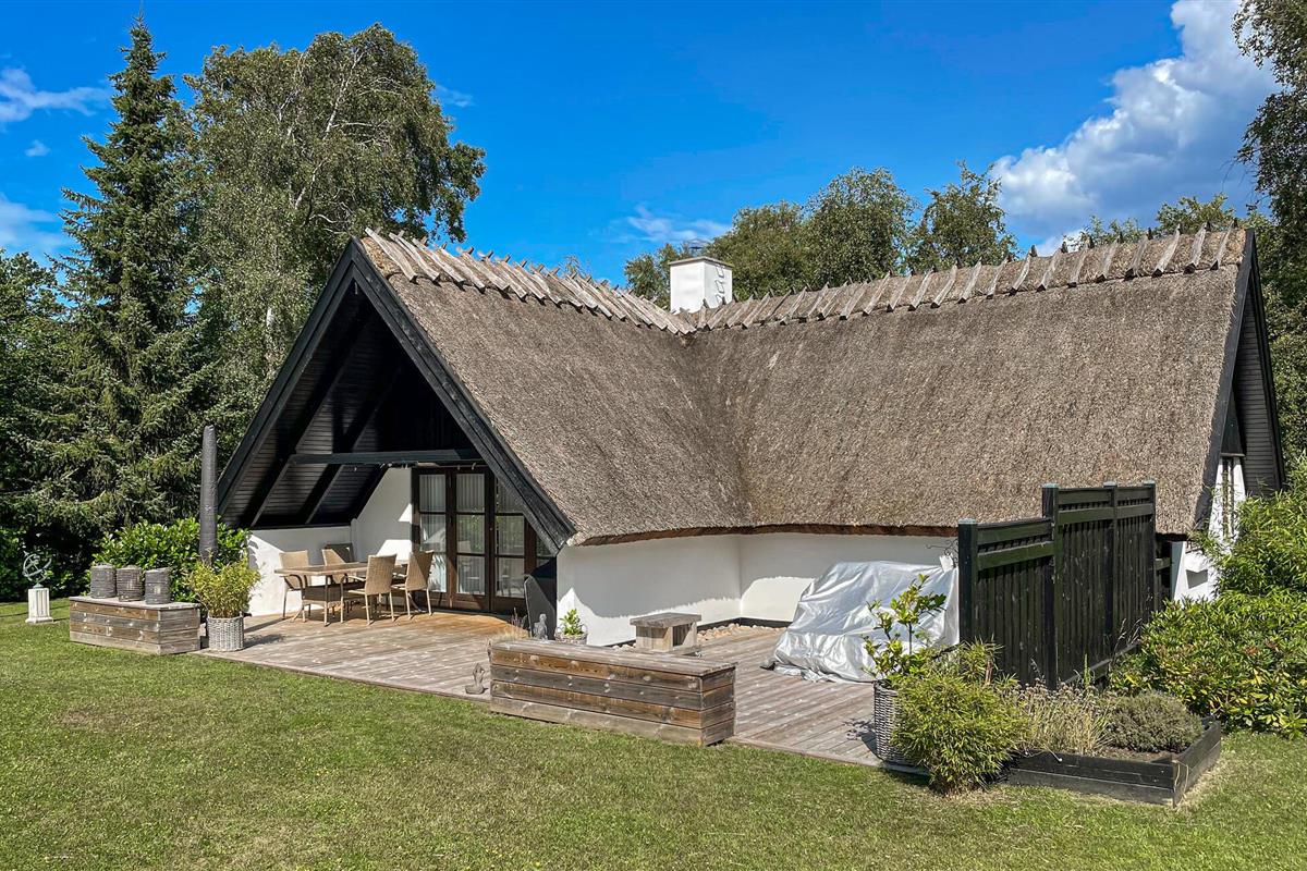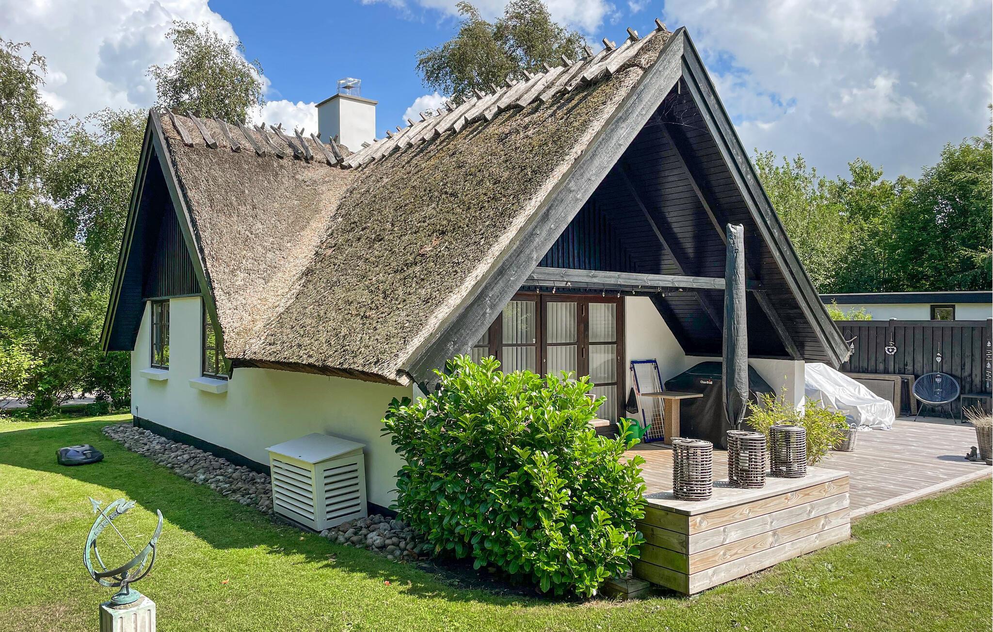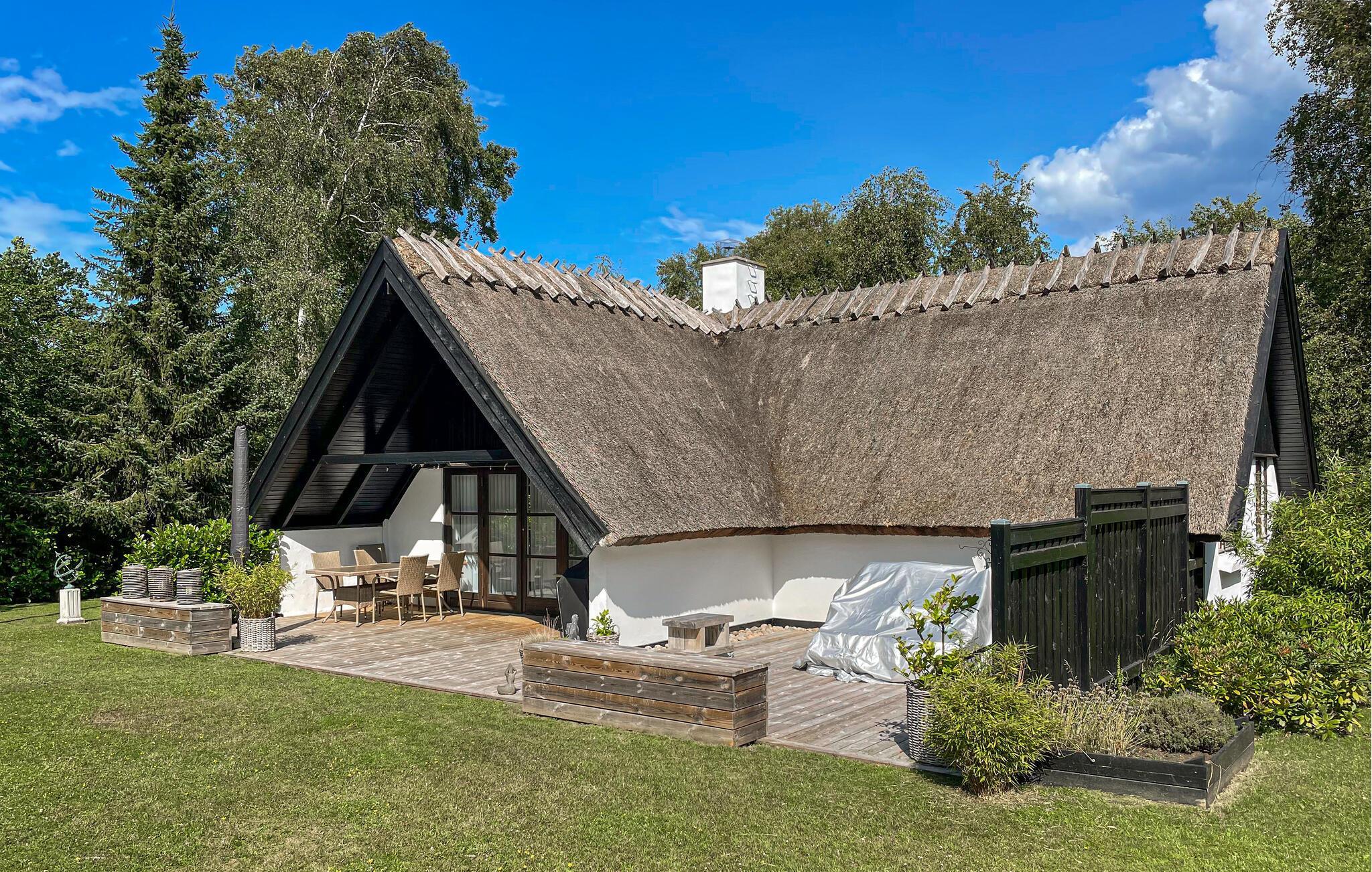Ontdek dit charmante vakantiehuis met rieten dak en open haard nabij Udsholt Strand, perfect voor een gezellige familievakantie.