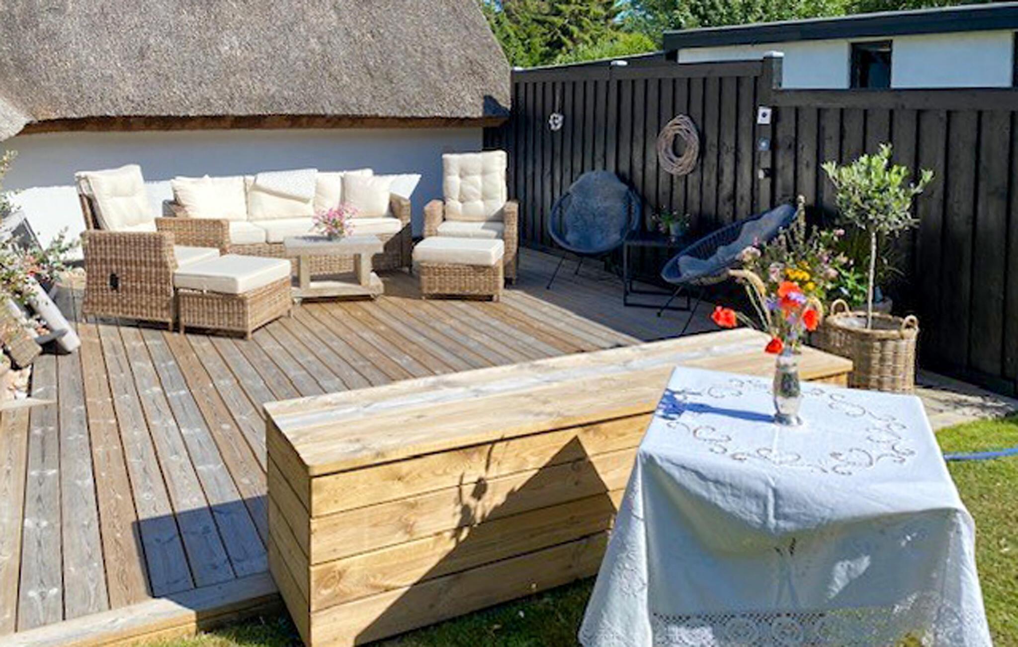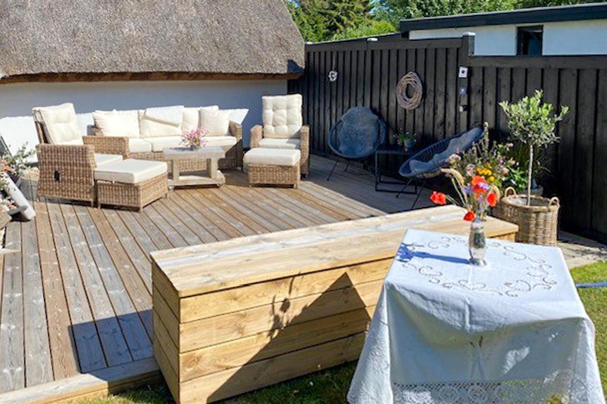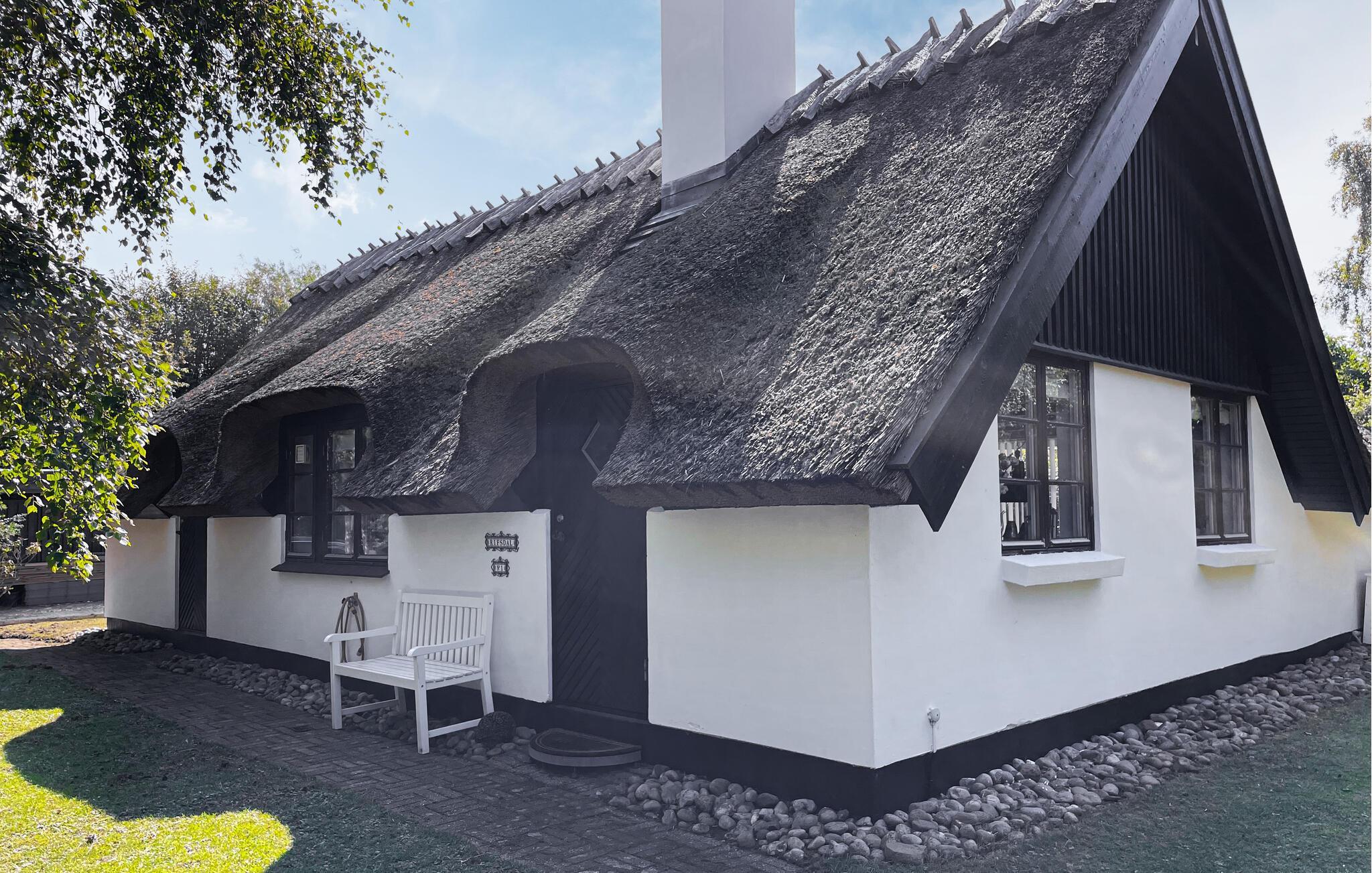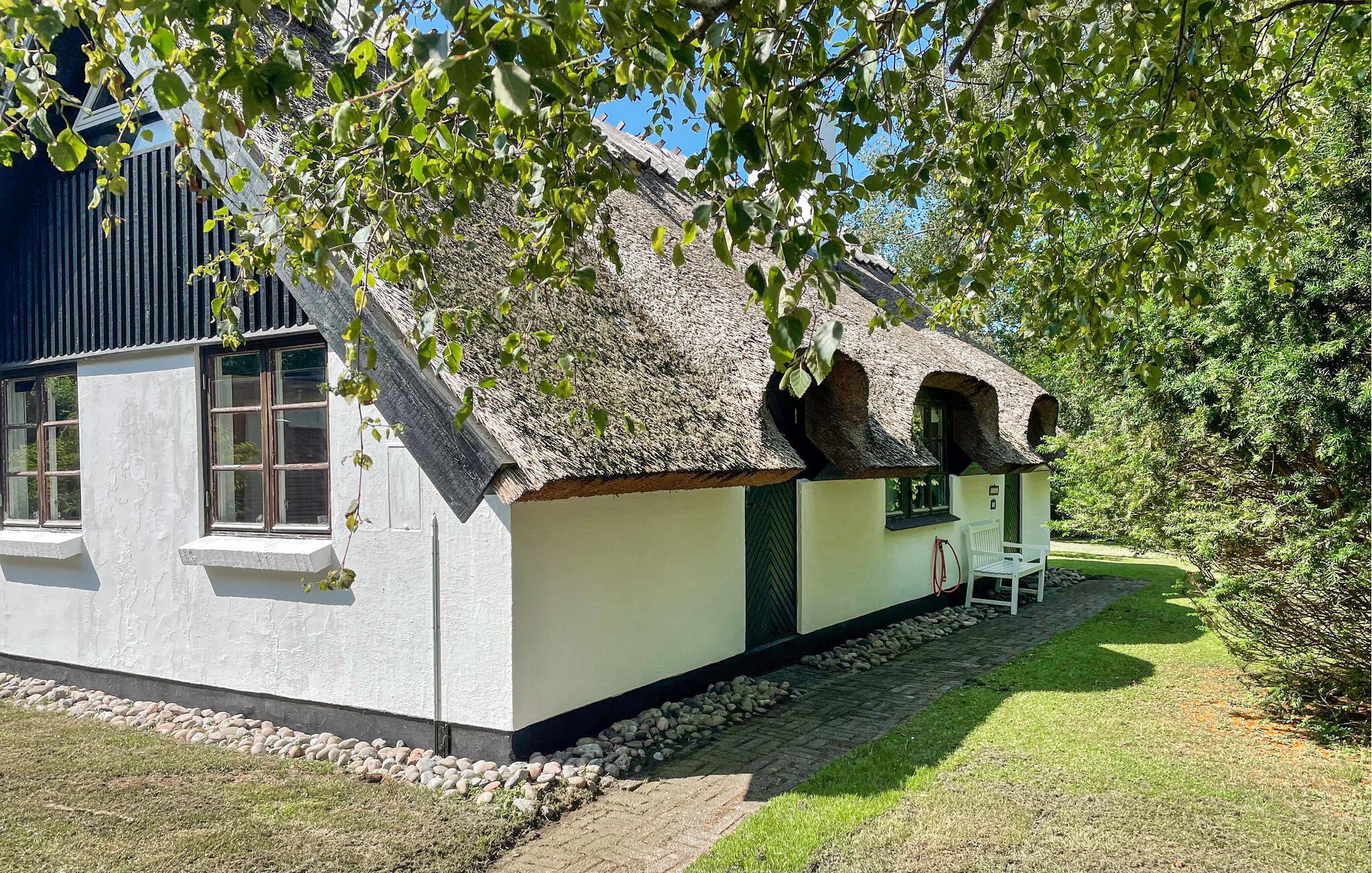 Ontdek dit charmante vakantiehuis met rieten dak en open haard nabij Udsholt Strand, perfect voor een gezellige familievakantie.