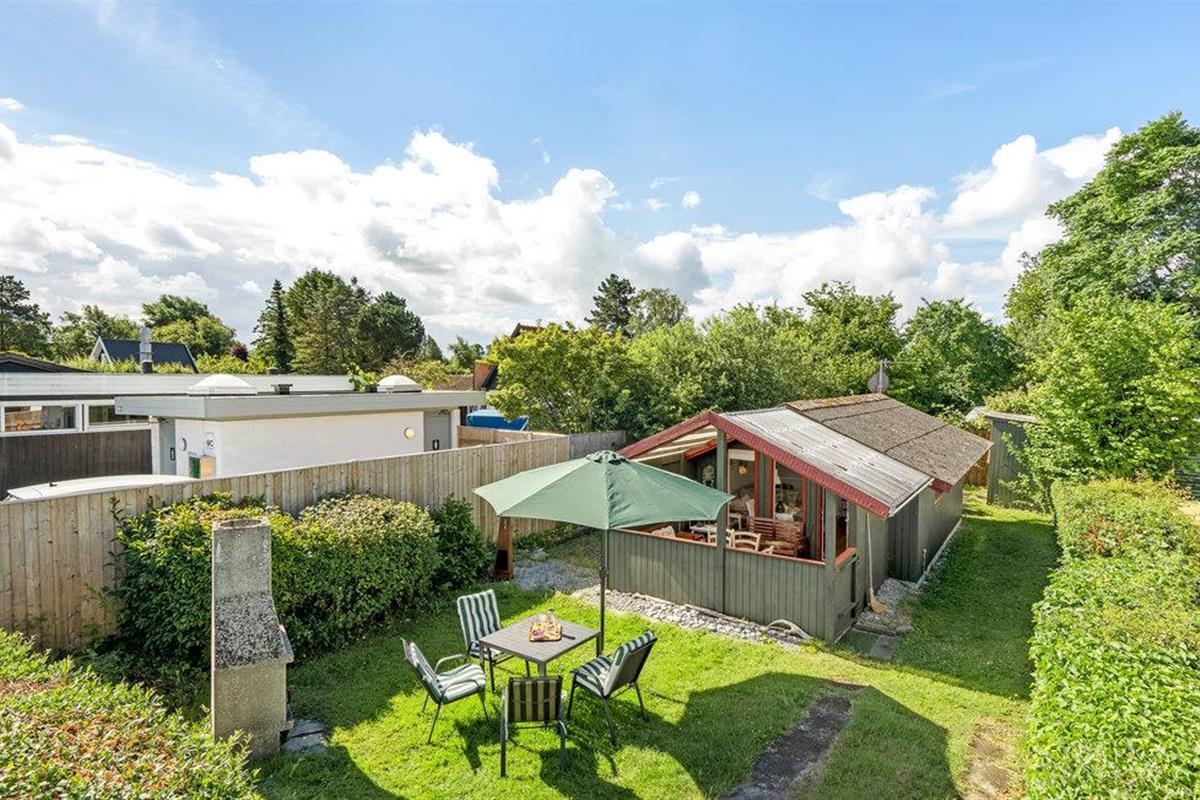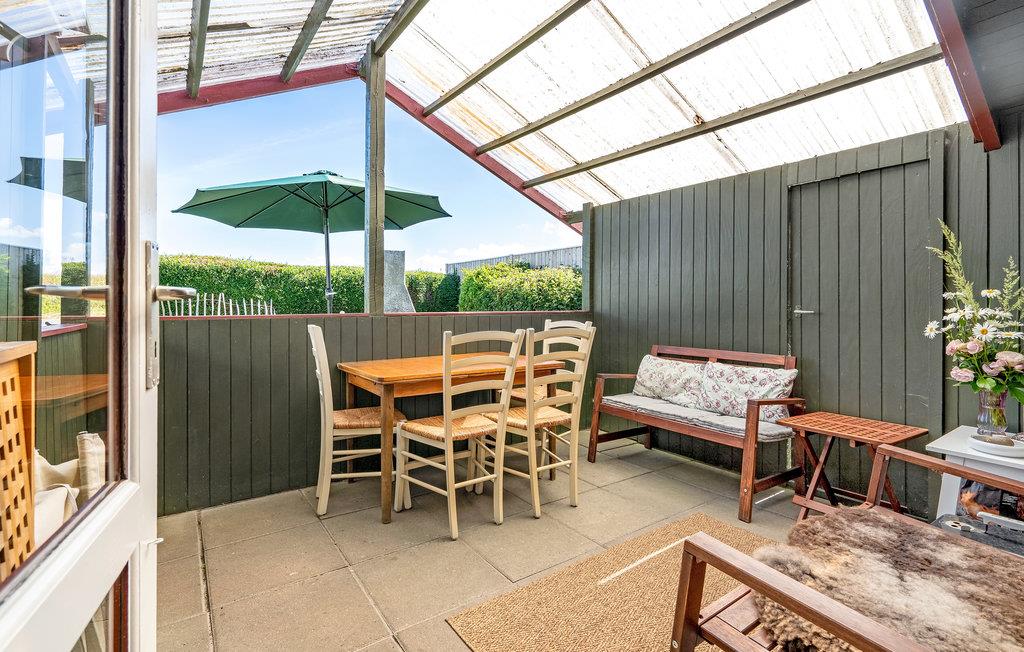 Knus vakantiehuis aan het Ulvshale strand met overdekt terras en buitenhaard, ideaal voor ontspannen en genieten van natuur en zee.