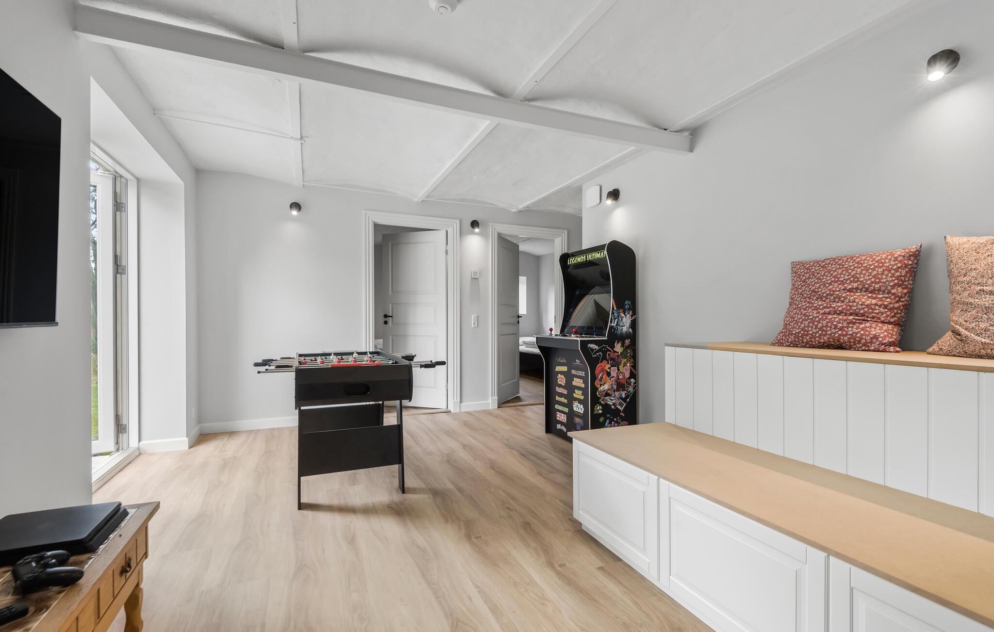 Welkom in dit grote vakantiehuis waar comfort en luxe samenkomen. Ervaar pure ontspanning in de lichtovergoten woonkamer en moderne keuken. Het zorgvuldig geselecteerde ontwerp en de liefdevol ingerichte kamers creëren de perfecte oase van welzijn op twee verdiepingen, waar je kunt ontspannen en genieten van tijd samen met je familie en vrienden. De activiteitenruimte met speelautomaat, tafelvoetbal en tv biedt extra vermaak voor het hele gezin.
