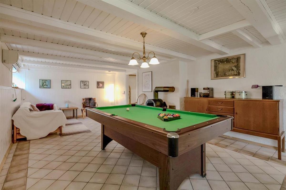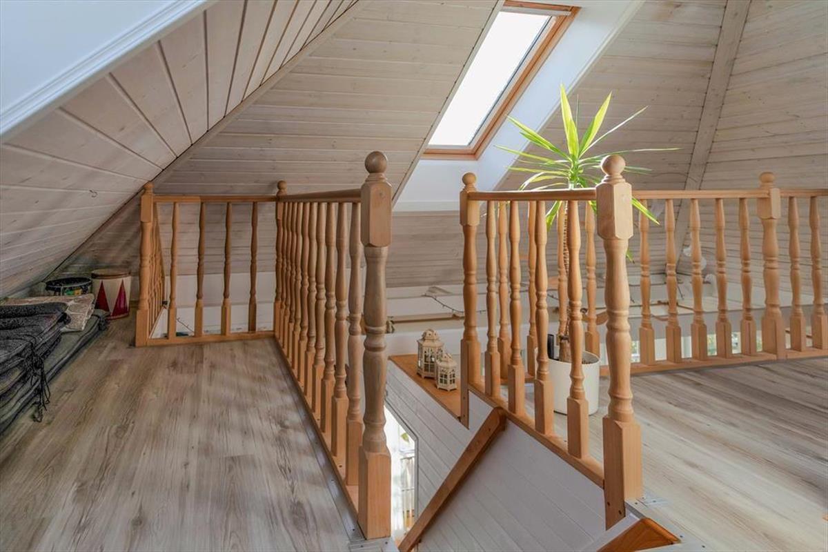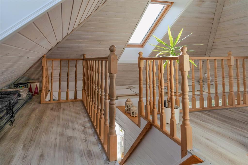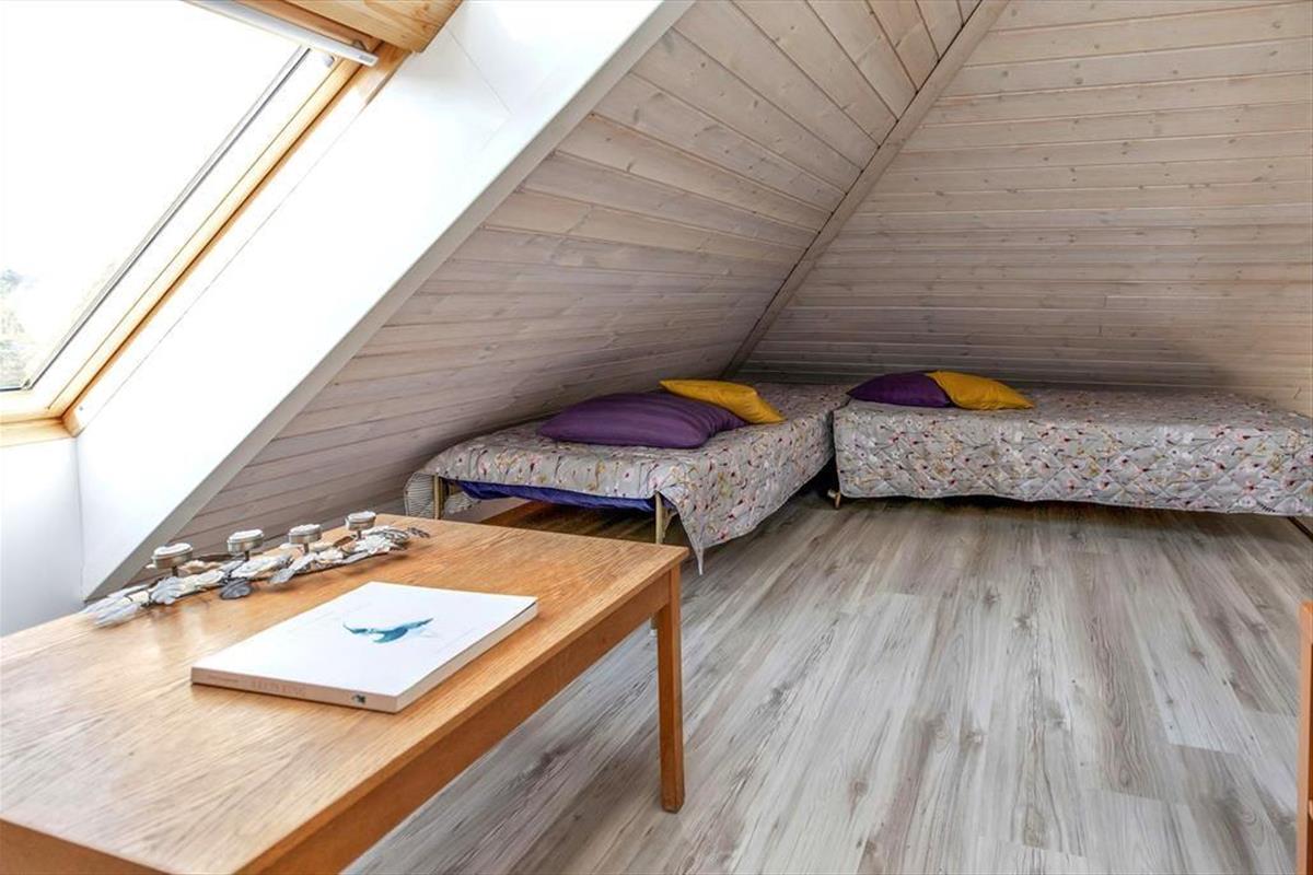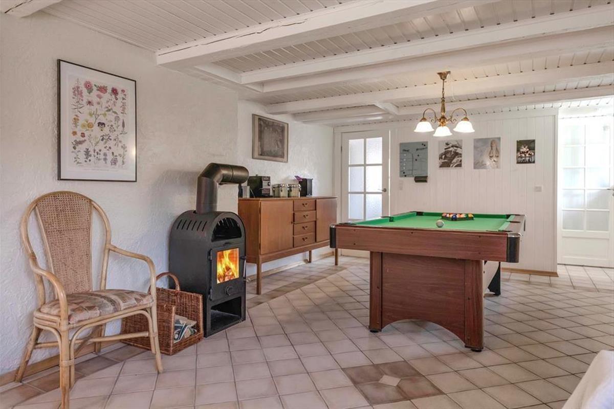 Dein Ferienhaus glänzt mit einer gemütlichen Wohnatmosphäre. Dies spürst du unmittelbar nach dem ersten Betreten - wenn der Alltagsstress von deinen Schultern abfällt und einer entspannten Urlaubsstimmung weicht. Gemeinsame Stunden verbringst du mit deinen Mitreisenden gern in der offenen Küche, in der ihr zusammen die großen und kleinen Mahlzeiten des Tages zubereitet. Die Küche schließt direkt an den Wohn- und Essbereich. Das Essen kannst du an schönen Tagen sehr gut auf der Westterrasse servieren, die direkt von der Küche aus zugänglich ist. Im Kellergeschoss lädt ein Billardtisch zu vergnügten Abenden ein, die vom behaglich knisternden Feuer des Kaminofens gemütlich untermalt werden. Im ersten Stockwerk, das du über eine recht steile Treppe erreichst, kannst du dich in aller Ruhe mit einem spannenden Buch niederlassen und dabei den attraktiven Tageslichteinfall der großen Fenster genießen.