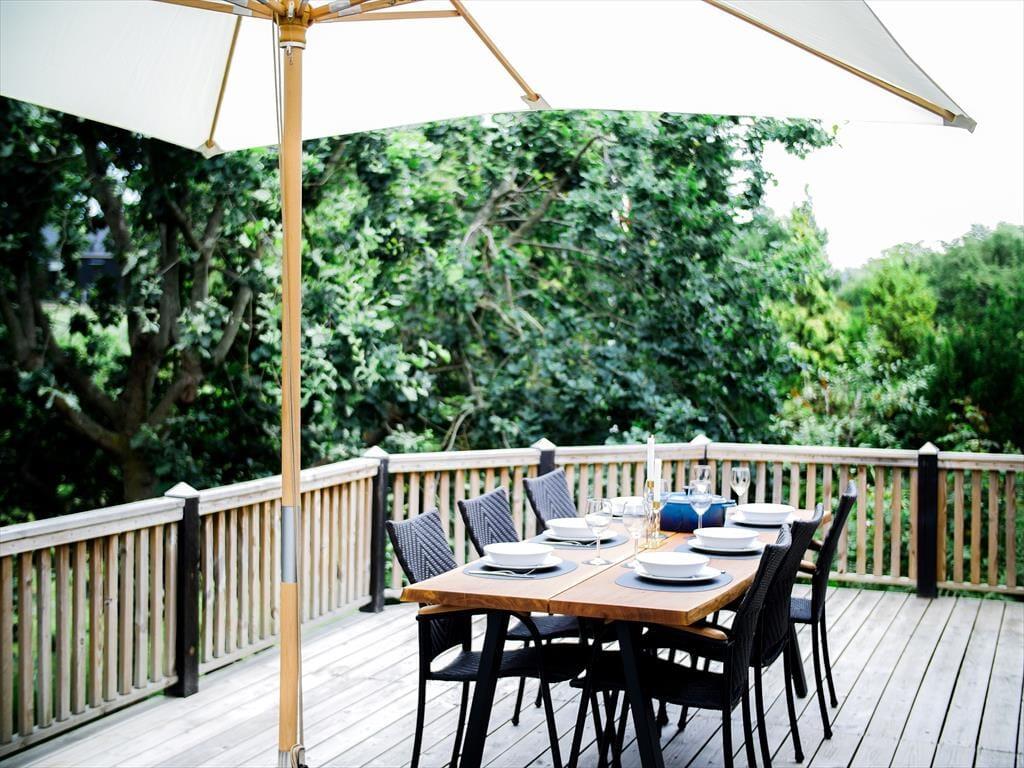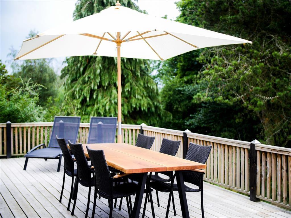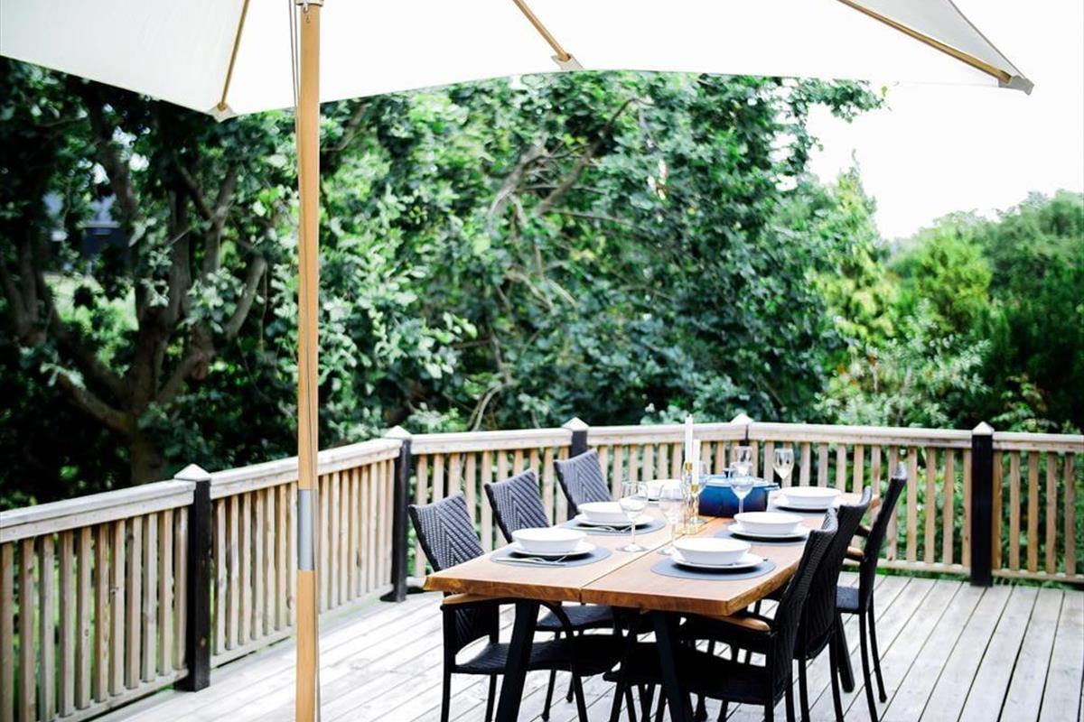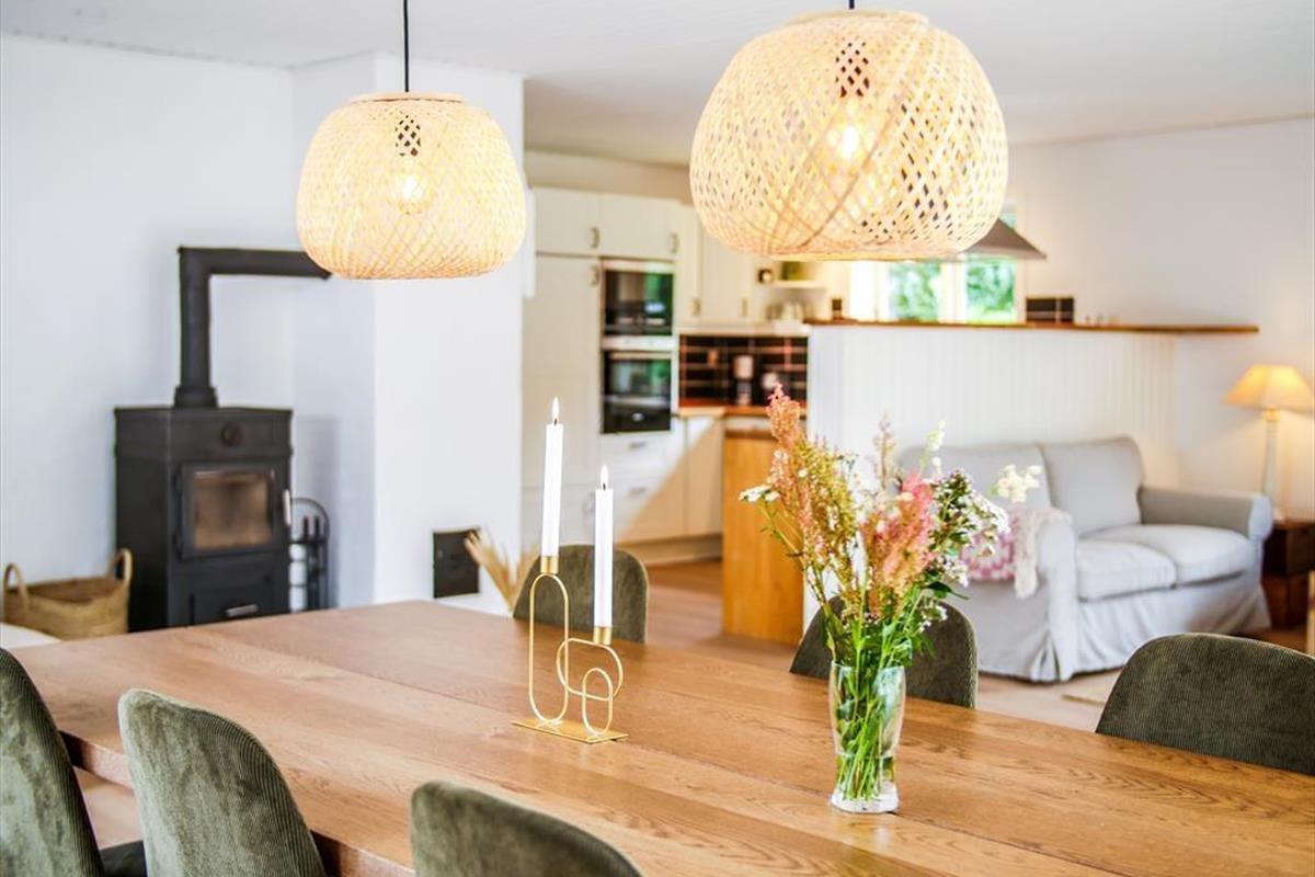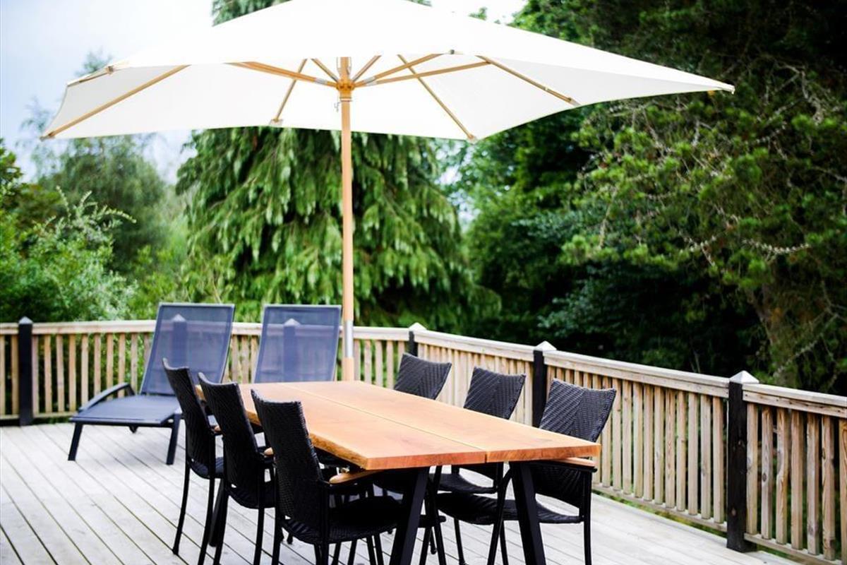 Toller Wohnraum mit Bettcouch, wo Sie sich mit einem guten Buch niederlassen können oder ein Spiel Karten mit den Kindern machen. In Verbindung mit dem Wohnraum gibt es eine schöne offene Küche, wo Sie sich alle damit helfen können, eine leckere Mahlzeit zu vorbereiten. Sie haben auch 3 gute Schlafzimmer, Zwei mit Doppelbetten, das dritte mit zwei Einzelbetten. Sowie ein Badezimmer mit Dusche. Nicht vergessen, die schöne Terrasse zu benutzen, die in mehrere Sektionen aufgeteilt ist. Hier können Sie ein paar gute Steaks auf den Grill hinlegen, Champagner in die Gläser gießen oder in das Wildnis Spa herein gehen und ganz einfach die Sonne und den Blick über dem schönen Grundstück genießen. Alles hier steht hell und einladend.