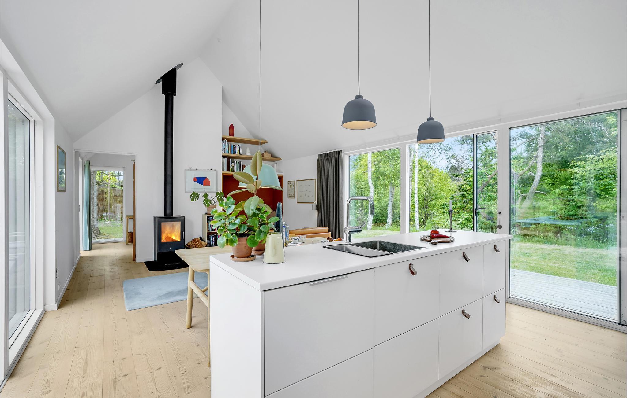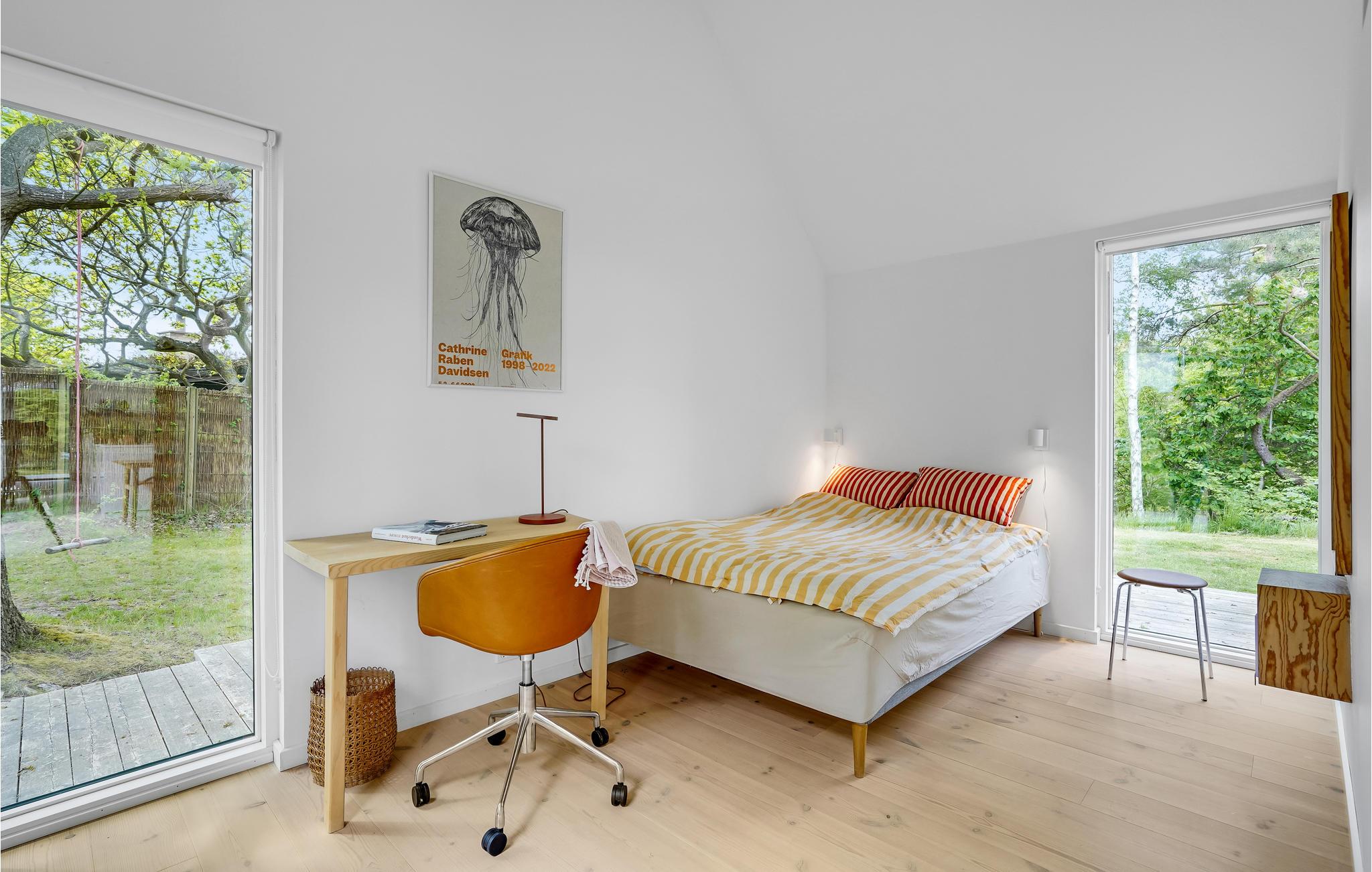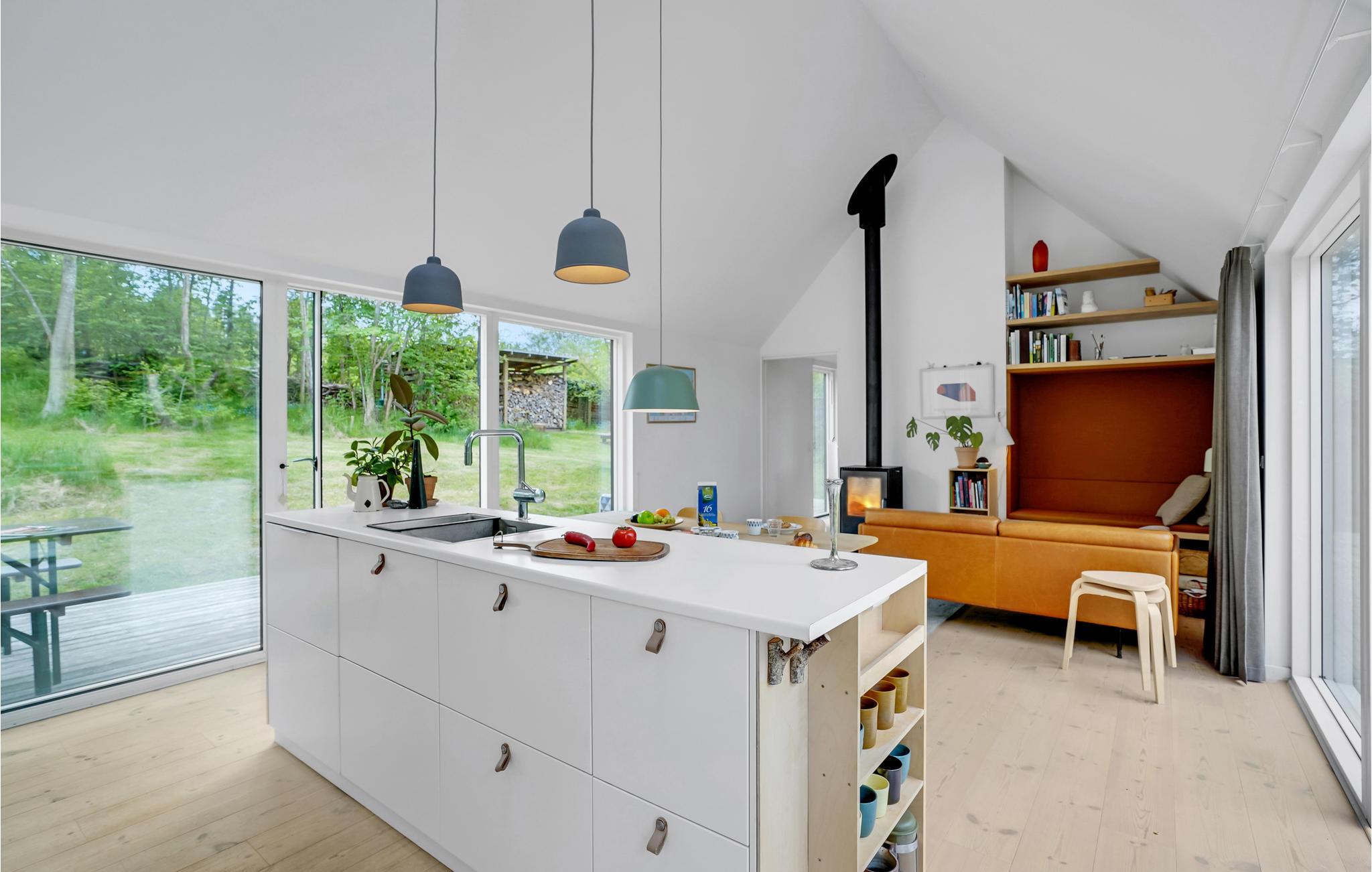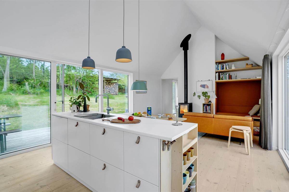 Gezellig en energiezuinig houten vakantiehuis nabij het strand in het heuvelachtige Veddinge Bakker, Denemarken.