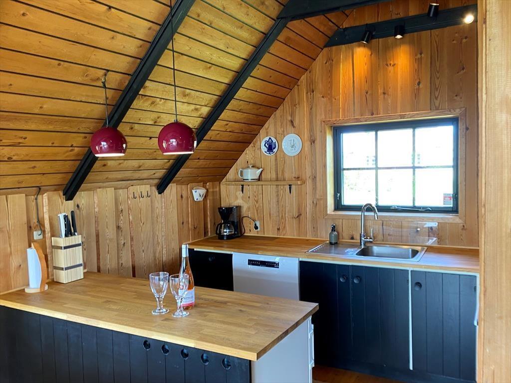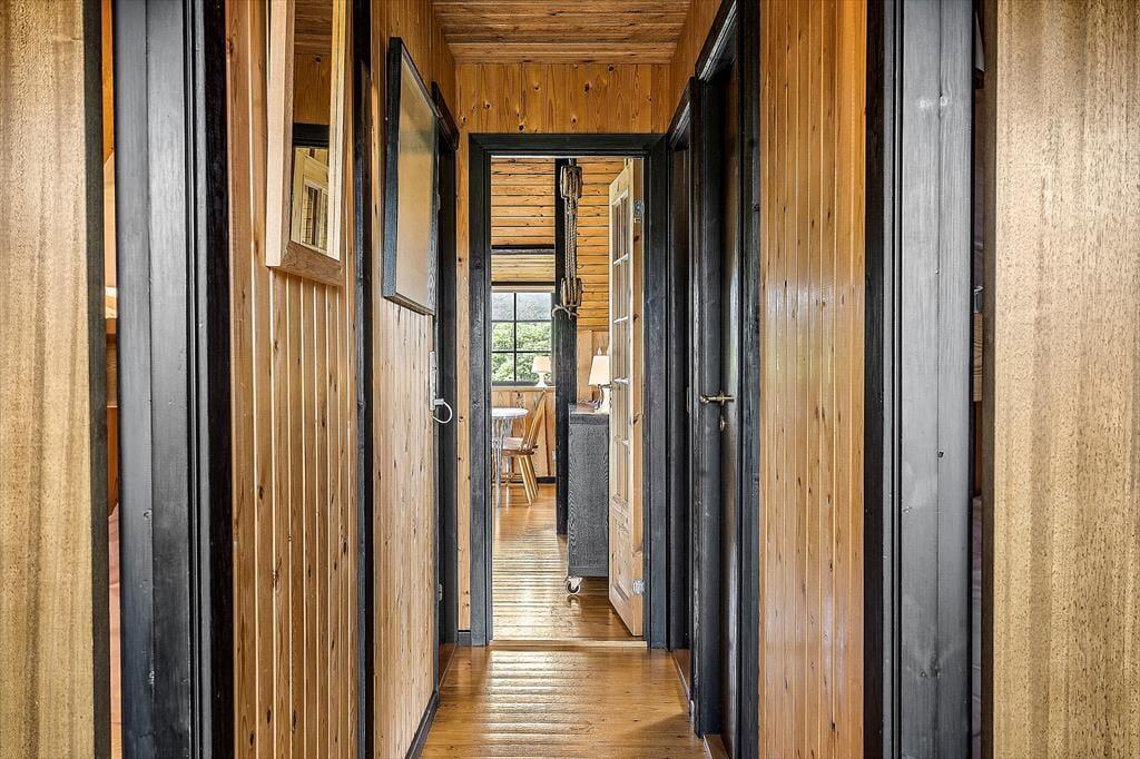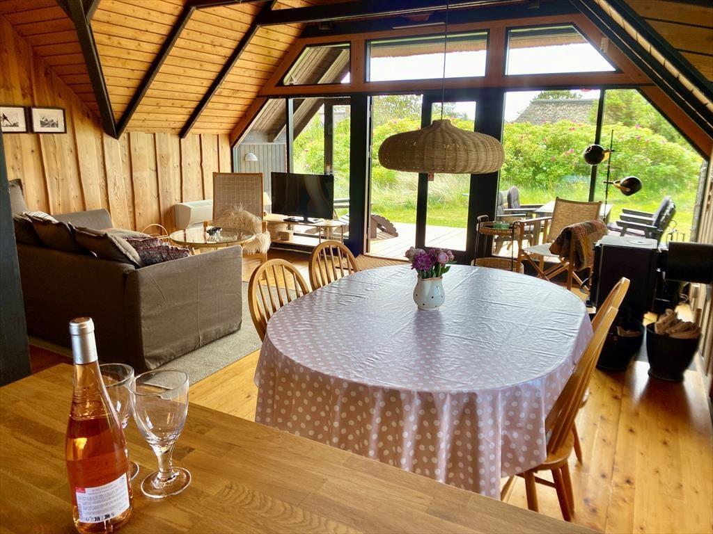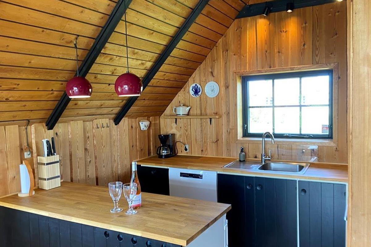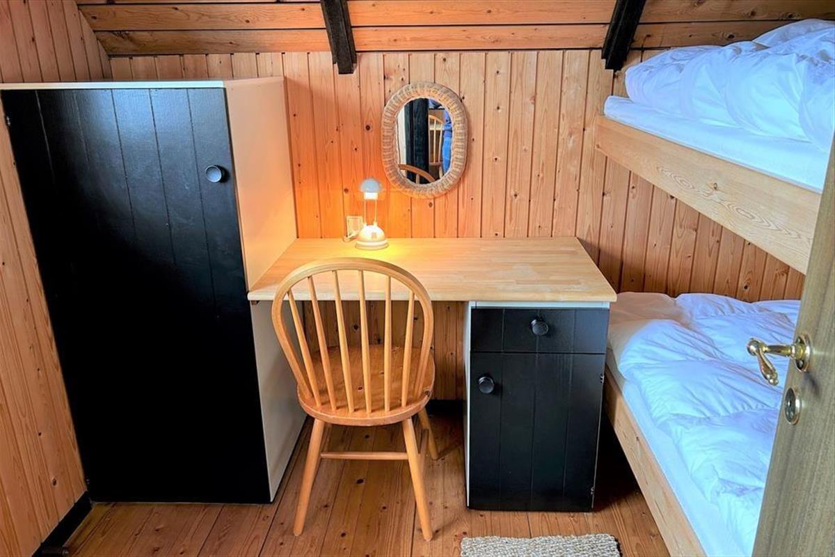 Hinter dem Eingangsbereich dieses Reetdachferienhauses erwartet Sie der Küchen- und Essbereich, der sich offen in den gemütlichen Aufenthaltsraum einfügt. Letzterer besticht mit hohen Decken, einer offenen Balkenlage, einem Dielenboden, einem Kaminofen und einem Ausgang auf die schöne Holzterrasse. Während gemeinsamer Mahlzeiten am Esstisch blicken Sie auf die hinten am Horizont schimmernden Dünen. Der Rest der Wohnfläche ist einem Schlafzimmer, zwei Schlafräumen mit je einem Etagenbett und einem kleinen Schreibtisch sowie dem Badezimmer mit Duschnische gewidmet.