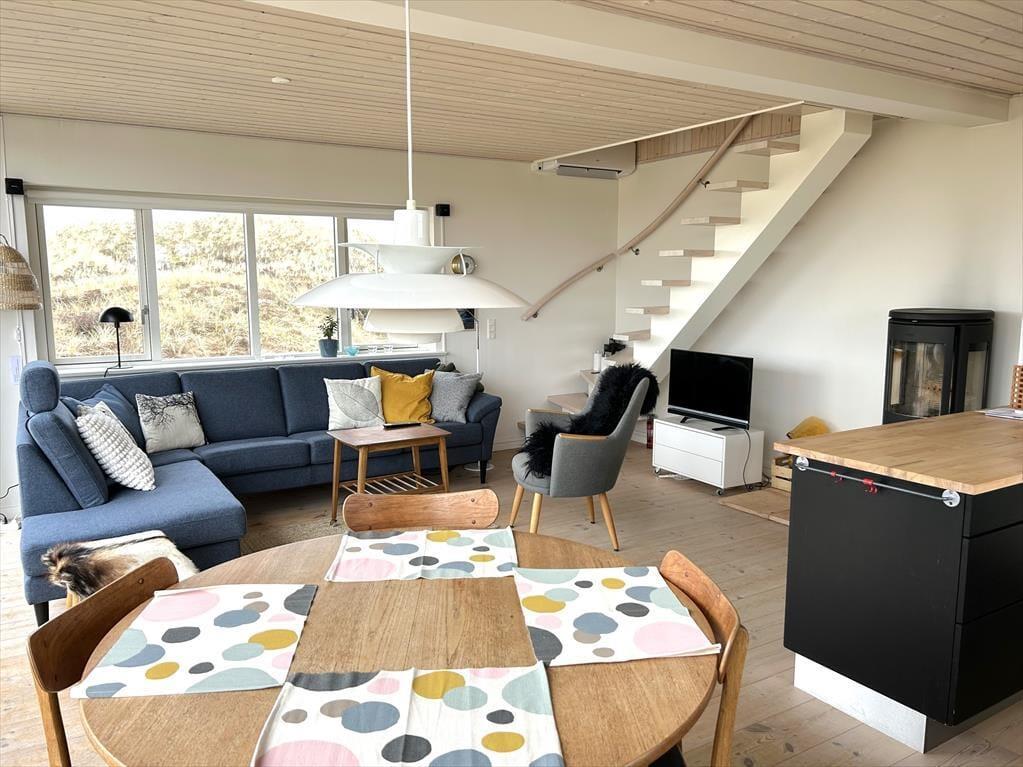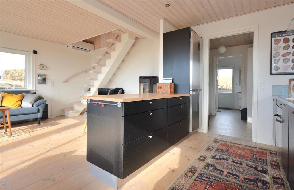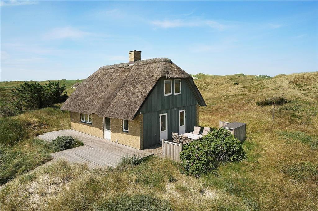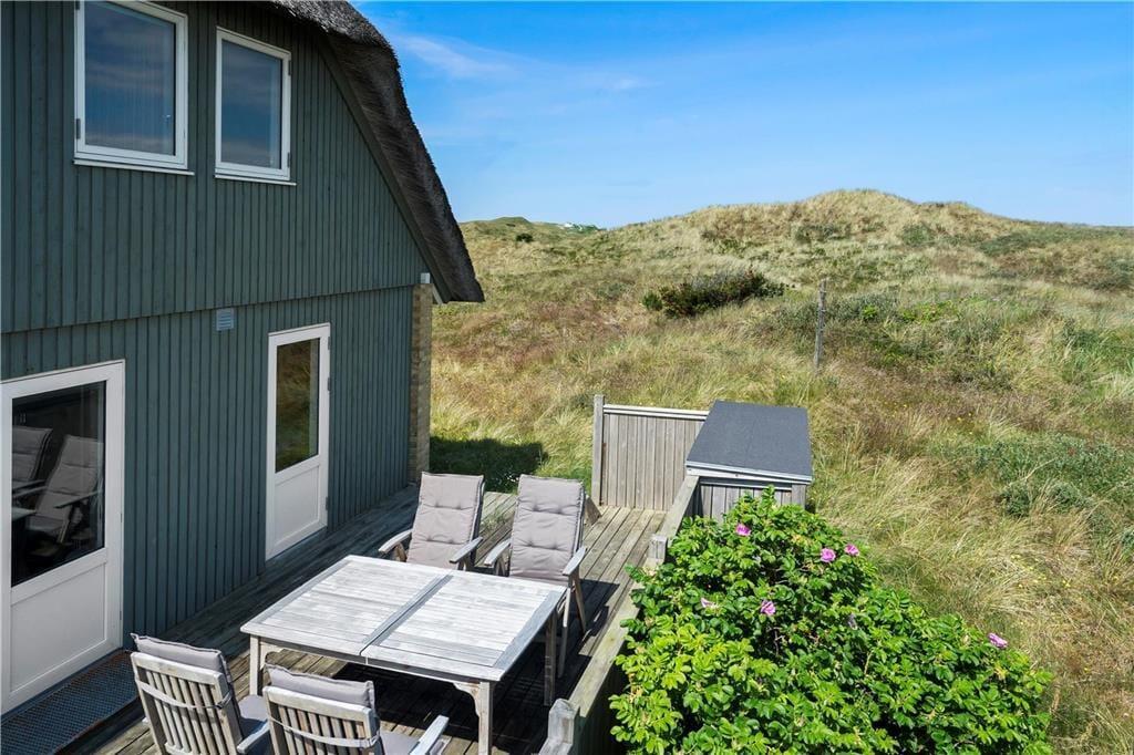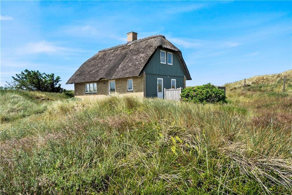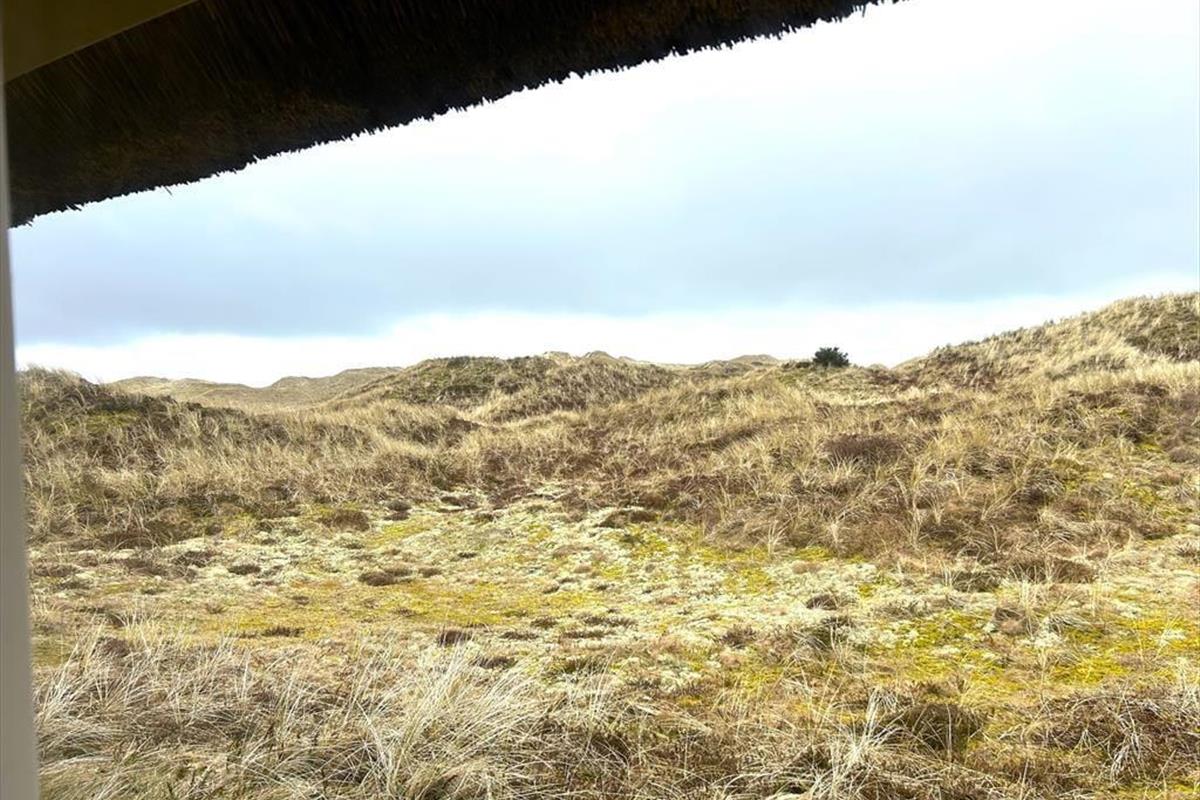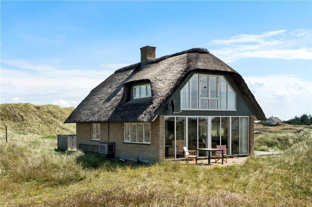Dieses zweigeschossige, geräumige Reetdachferienhaus besticht mit einer schönen Aussicht auf die Dünenlandschaft Westjütlands. Das Erdgeschoss umfasst einen Flur, ein Badezimmer, einen Schlafraum und einen Küchen-, Wohn- und Essbereich. Der Schlafraum und das Badezimmer bieten einen direkten Ausgang auf eine kleine, nach Osten gerichtete Terrasse. Die Küche in modern-rustikalem Design mit einer Aluminiumarbeitsplatte ermöglicht eine gute Nutzung und Zubereitung Ihrer Urlaubsmahlzeiten. Dank der offenen Wohnlösung verfolgen Sie selbst in der Küche das Familiengeschehen im Wohnraum. Vom Wohnraum können Sie hinaus auf eine etwas größere Westterrasse treten. Die großen Fenster gen Westen sorgen für einen guten Tageslichteinfall und offenbaren einen Blick über die Dünen - soweit das Auge reicht. Der Kaminofen verleiht dem Wohnraum eine gemütliche Atmosphäre. Im Obergeschoss erwarten Sie ein schöner Aufenthaltsraum und zwei Schlafzimmer, die sich gut für Kinder eignen.
