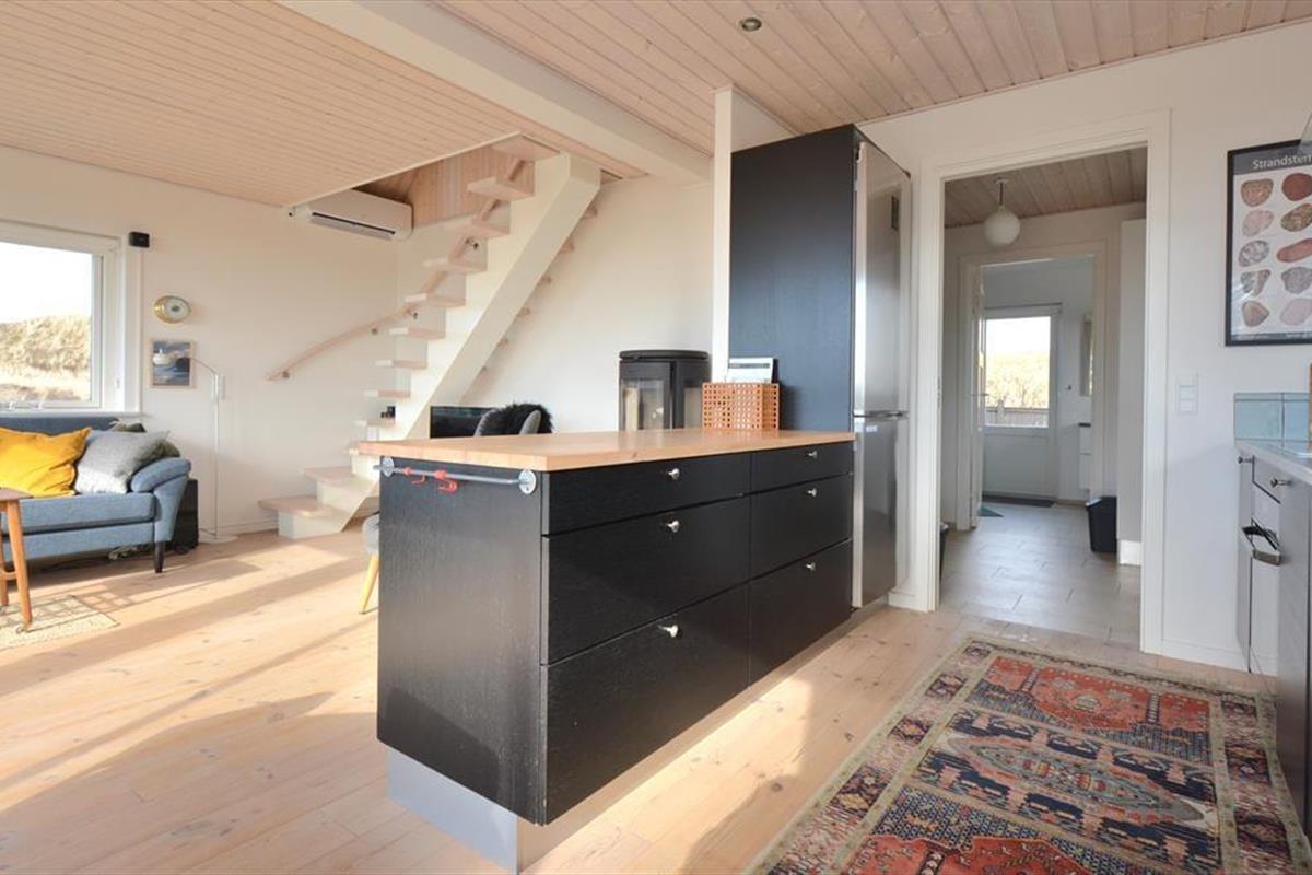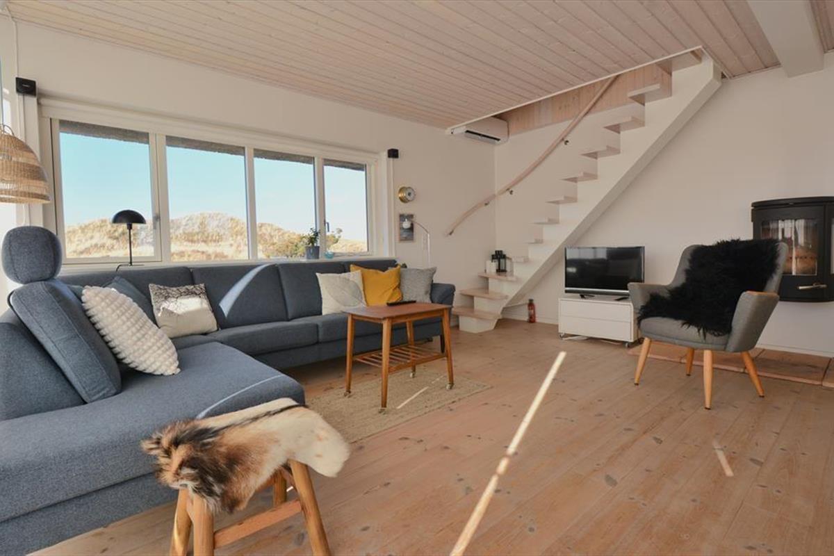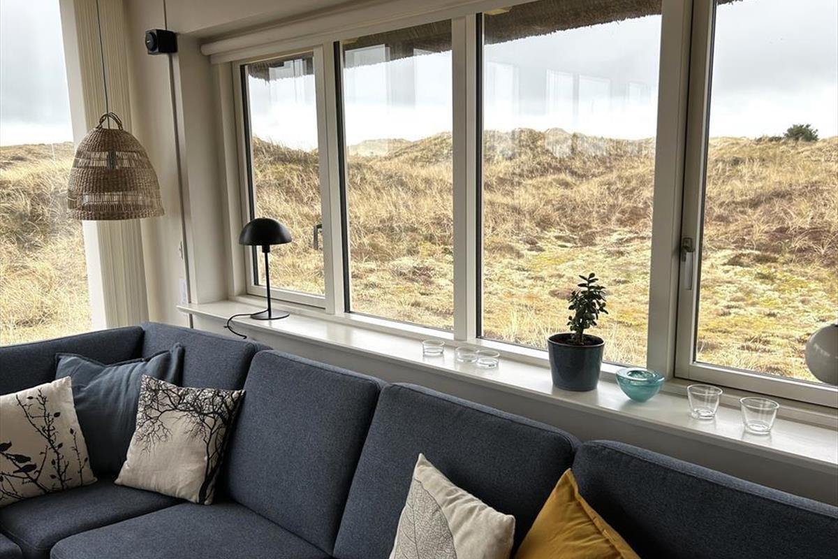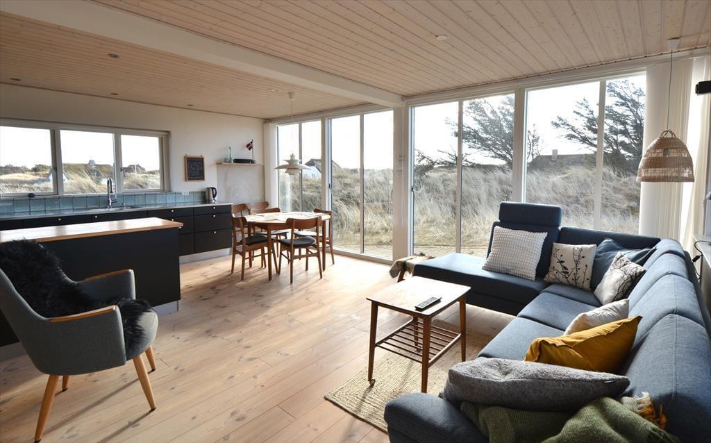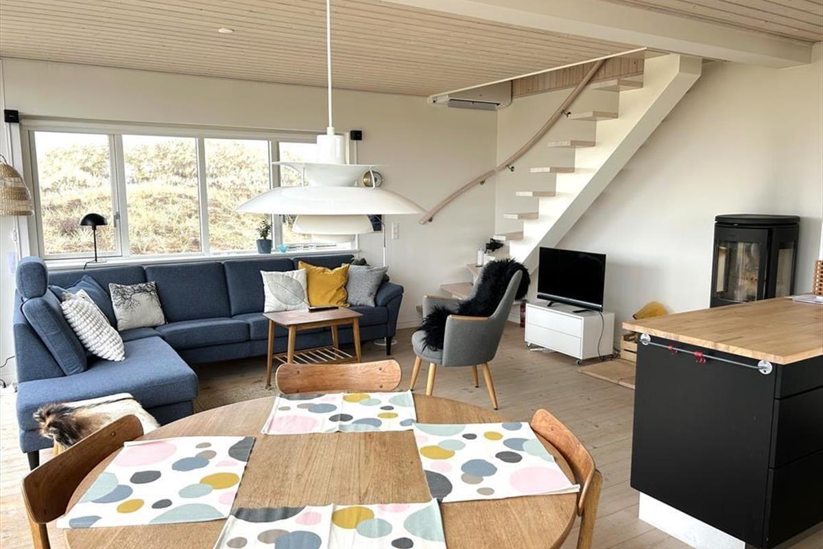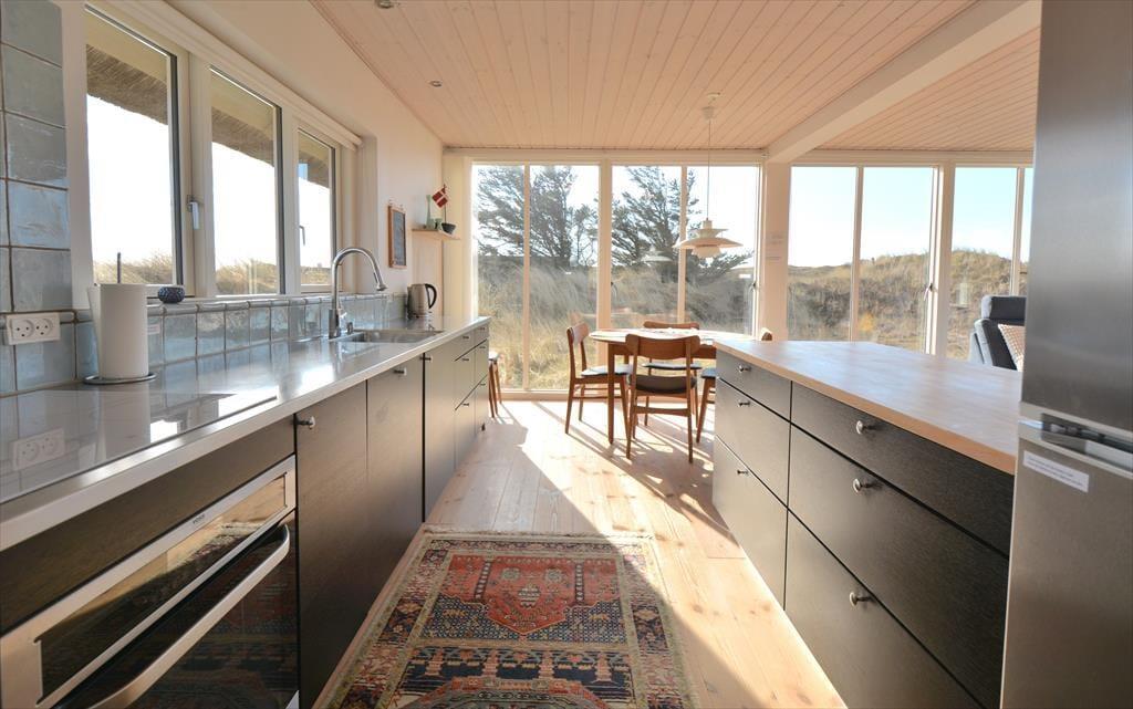 Dieses zweigeschossige, geräumige Reetdachferienhaus besticht mit einer schönen Aussicht auf die Dünenlandschaft Westjütlands. Das Erdgeschoss umfasst einen Flur, ein Badezimmer, einen Schlafraum und einen Küchen-, Wohn- und Essbereich. Der Schlafraum und das Badezimmer bieten einen direkten Ausgang auf eine kleine, nach Osten gerichtete Terrasse. Die Küche in modern-rustikalem Design mit einer Aluminiumarbeitsplatte ermöglicht eine gute Nutzung und Zubereitung Ihrer Urlaubsmahlzeiten. Dank der offenen Wohnlösung verfolgen Sie selbst in der Küche das Familiengeschehen im Wohnraum. Vom Wohnraum können Sie hinaus auf eine etwas größere Westterrasse treten. Die großen Fenster gen Westen sorgen für einen guten Tageslichteinfall und offenbaren einen Blick über die Dünen - soweit das Auge reicht. Der Kaminofen verleiht dem Wohnraum eine gemütliche Atmosphäre. Im Obergeschoss erwarten Sie ein schöner Aufenthaltsraum und zwei Schlafzimmer, die sich gut für Kinder eignen.