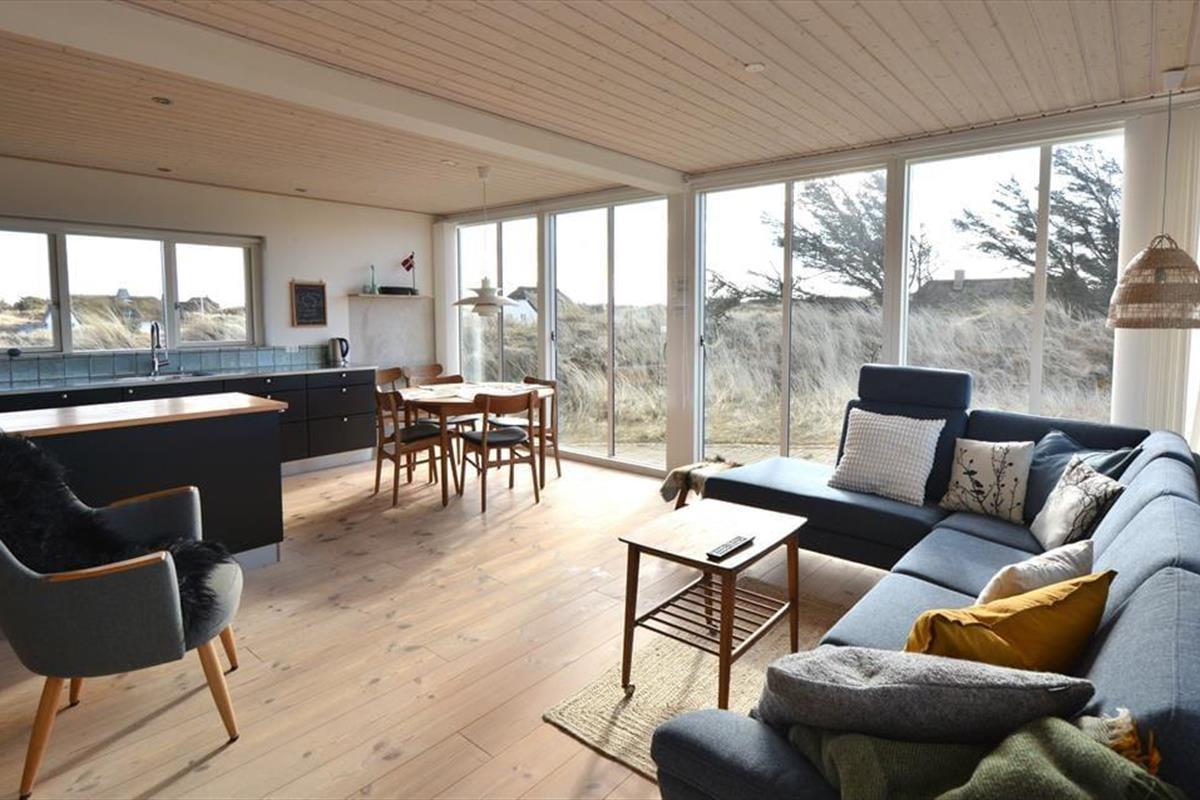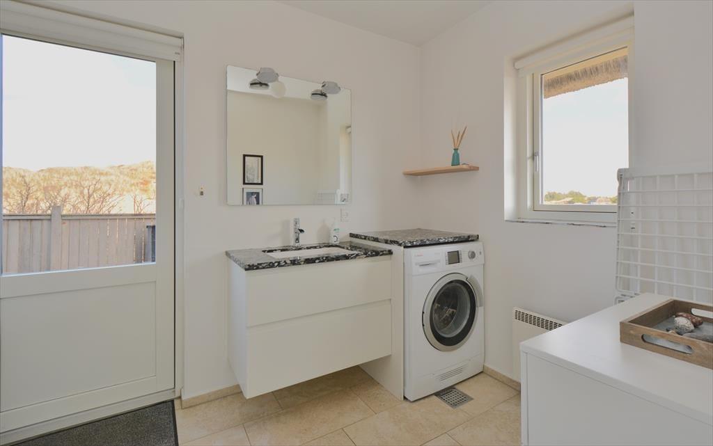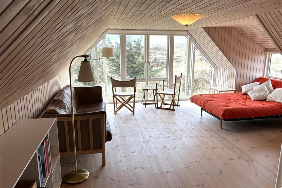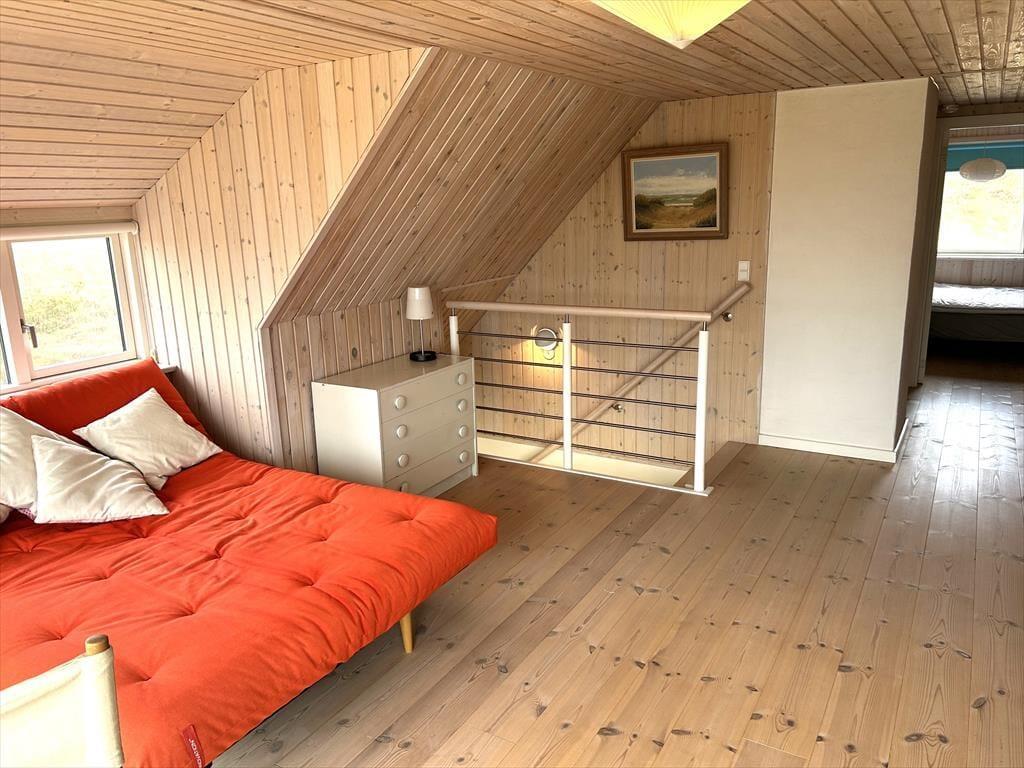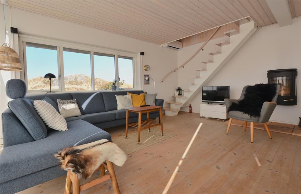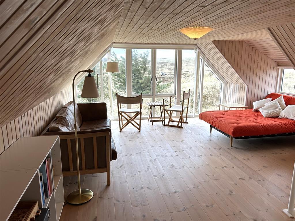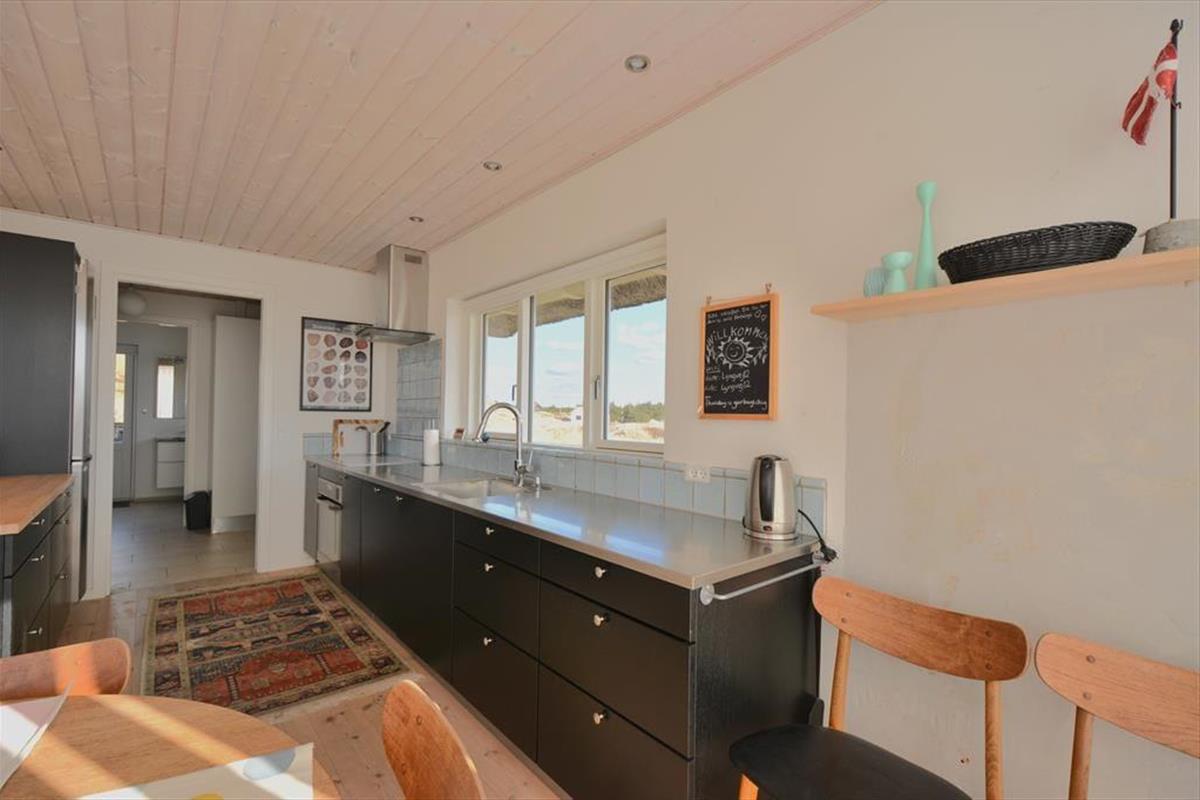 Dieses zweigeschossige, geräumige Reetdachferienhaus besticht mit einer schönen Aussicht auf die Dünenlandschaft Westjütlands. Das Erdgeschoss umfasst einen Flur, ein Badezimmer, einen Schlafraum und einen Küchen-, Wohn- und Essbereich. Der Schlafraum und das Badezimmer bieten einen direkten Ausgang auf eine kleine, nach Osten gerichtete Terrasse. Die Küche in modern-rustikalem Design mit einer Aluminiumarbeitsplatte ermöglicht eine gute Nutzung und Zubereitung Ihrer Urlaubsmahlzeiten. Dank der offenen Wohnlösung verfolgen Sie selbst in der Küche das Familiengeschehen im Wohnraum. Vom Wohnraum können Sie hinaus auf eine etwas größere Westterrasse treten. Die großen Fenster gen Westen sorgen für einen guten Tageslichteinfall und offenbaren einen Blick über die Dünen - soweit das Auge reicht. Der Kaminofen verleiht dem Wohnraum eine gemütliche Atmosphäre. Im Obergeschoss erwarten Sie ein schöner Aufenthaltsraum und zwei Schlafzimmer, die sich gut für Kinder eignen.