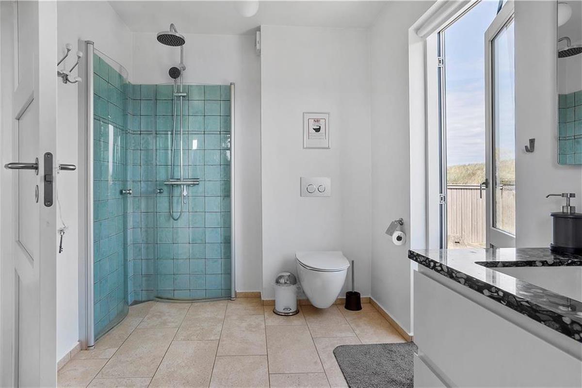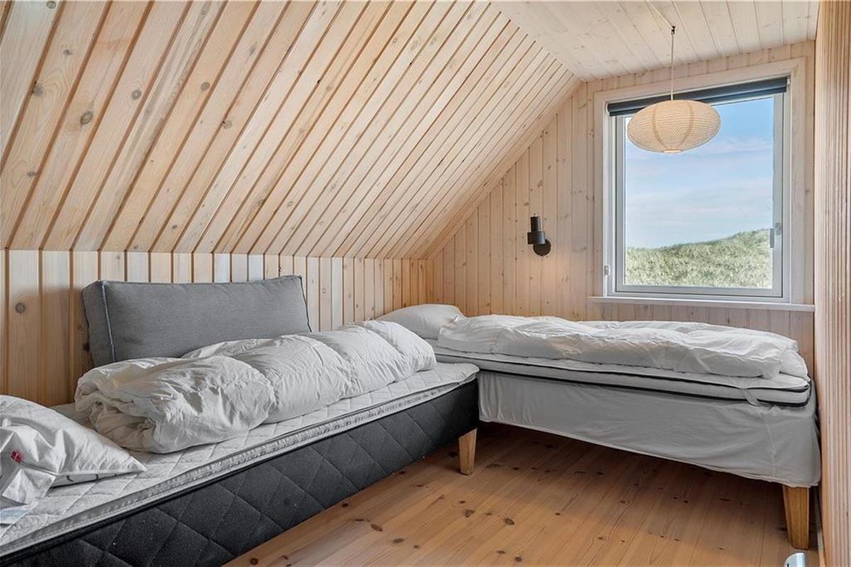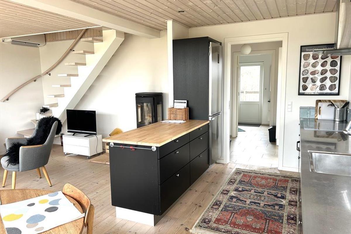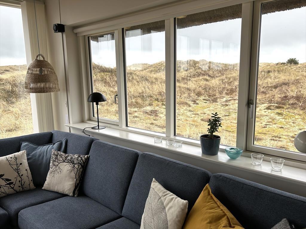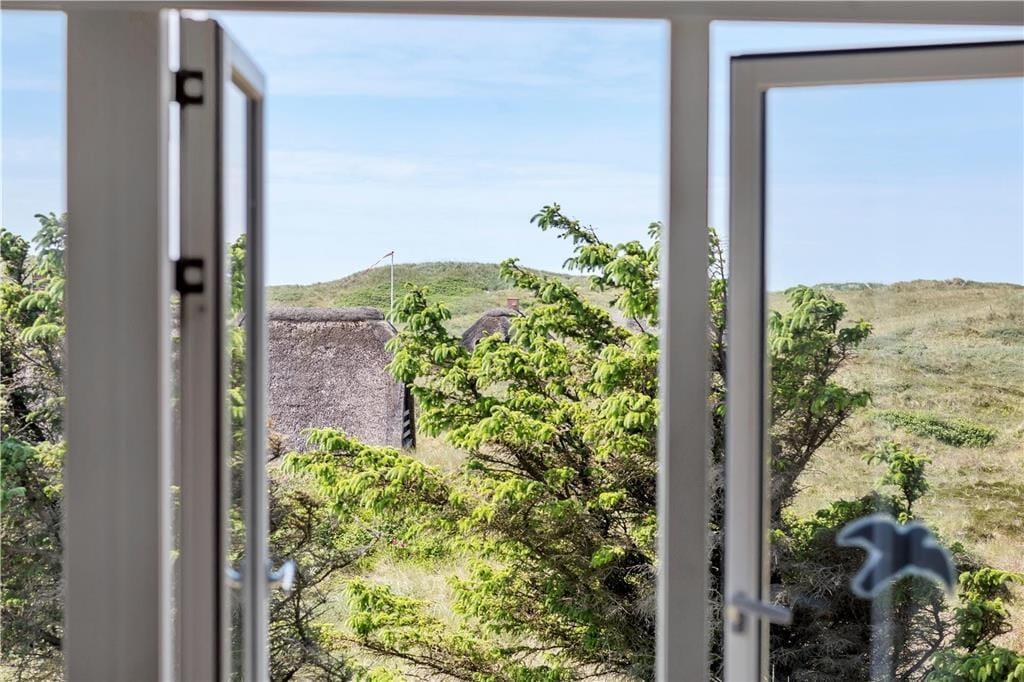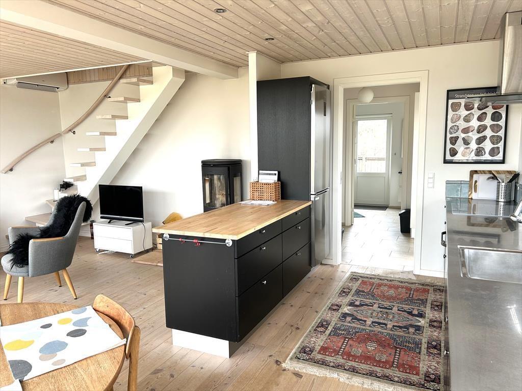 Dieses zweigeschossige, geräumige Reetdachferienhaus besticht mit einer schönen Aussicht auf die Dünenlandschaft Westjütlands. Das Erdgeschoss umfasst einen Flur, ein Badezimmer, einen Schlafraum und einen Küchen-, Wohn- und Essbereich. Der Schlafraum und das Badezimmer bieten einen direkten Ausgang auf eine kleine, nach Osten gerichtete Terrasse. Die Küche in modern-rustikalem Design mit einer Aluminiumarbeitsplatte ermöglicht eine gute Nutzung und Zubereitung Ihrer Urlaubsmahlzeiten. Dank der offenen Wohnlösung verfolgen Sie selbst in der Küche das Familiengeschehen im Wohnraum. Vom Wohnraum können Sie hinaus auf eine etwas größere Westterrasse treten. Die großen Fenster gen Westen sorgen für einen guten Tageslichteinfall und offenbaren einen Blick über die Dünen - soweit das Auge reicht. Der Kaminofen verleiht dem Wohnraum eine gemütliche Atmosphäre. Im Obergeschoss erwarten Sie ein schöner Aufenthaltsraum und zwei Schlafzimmer, die sich gut für Kinder eignen.