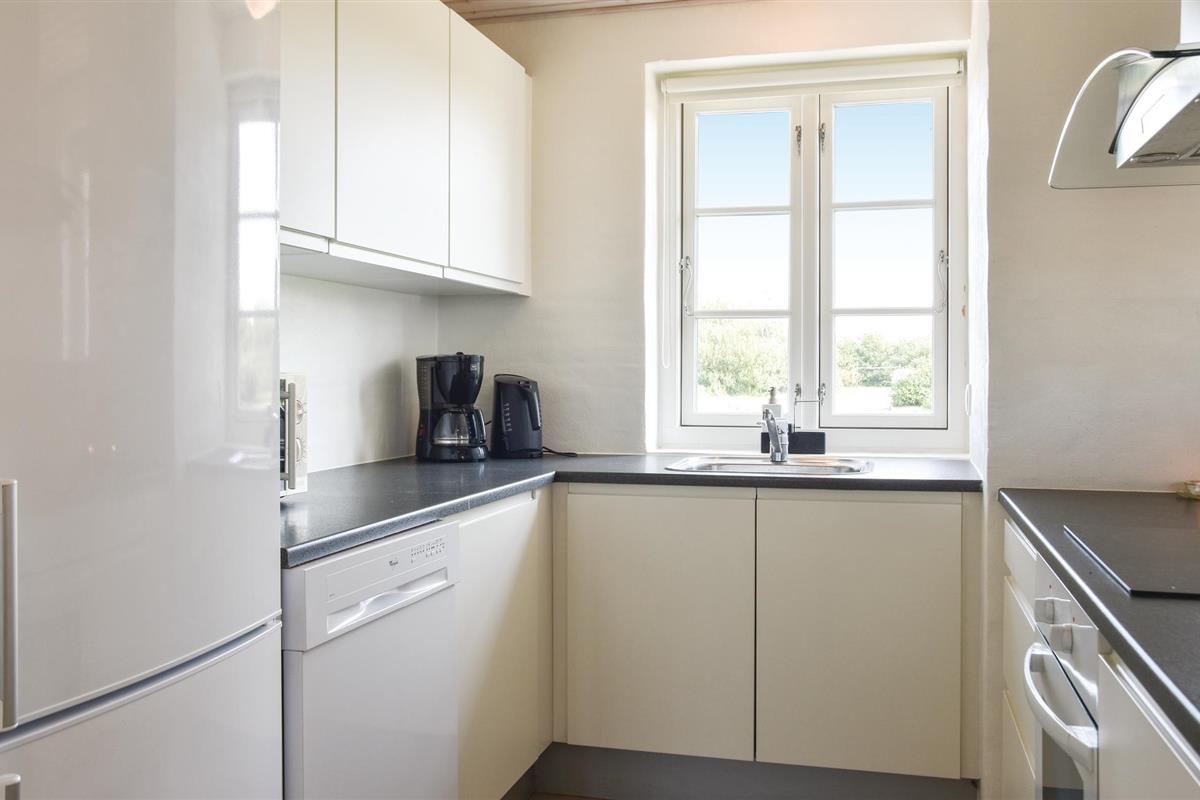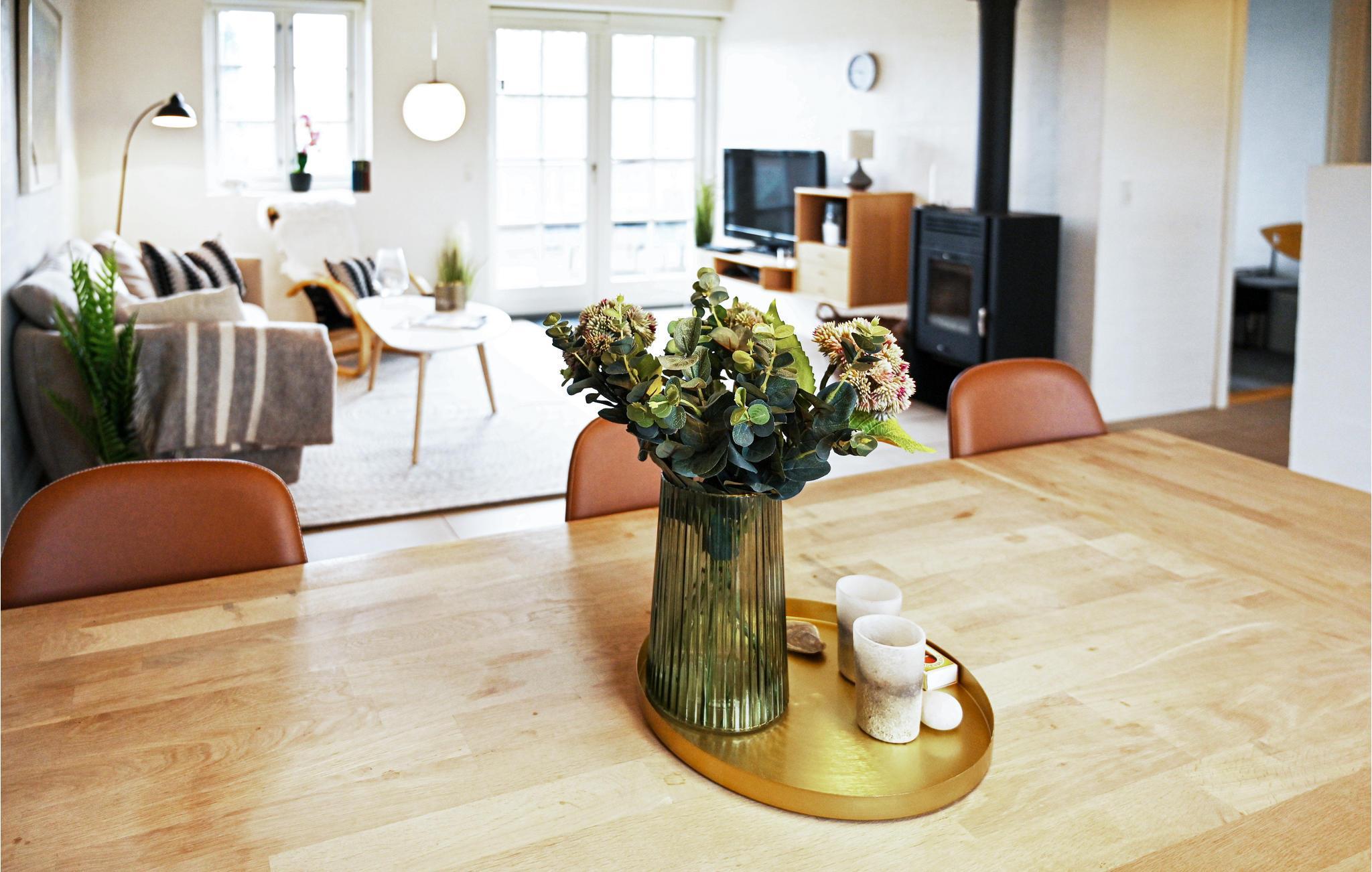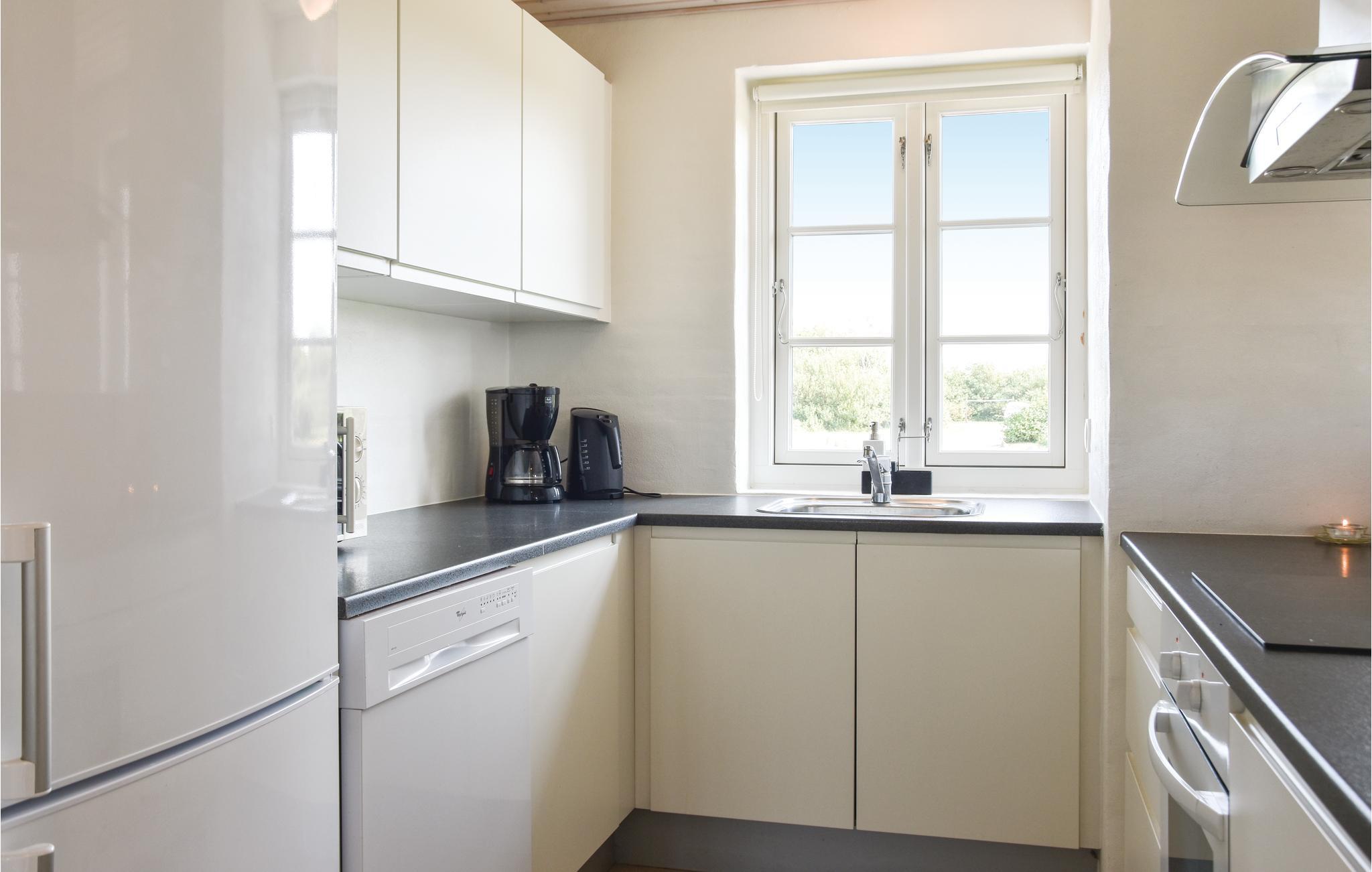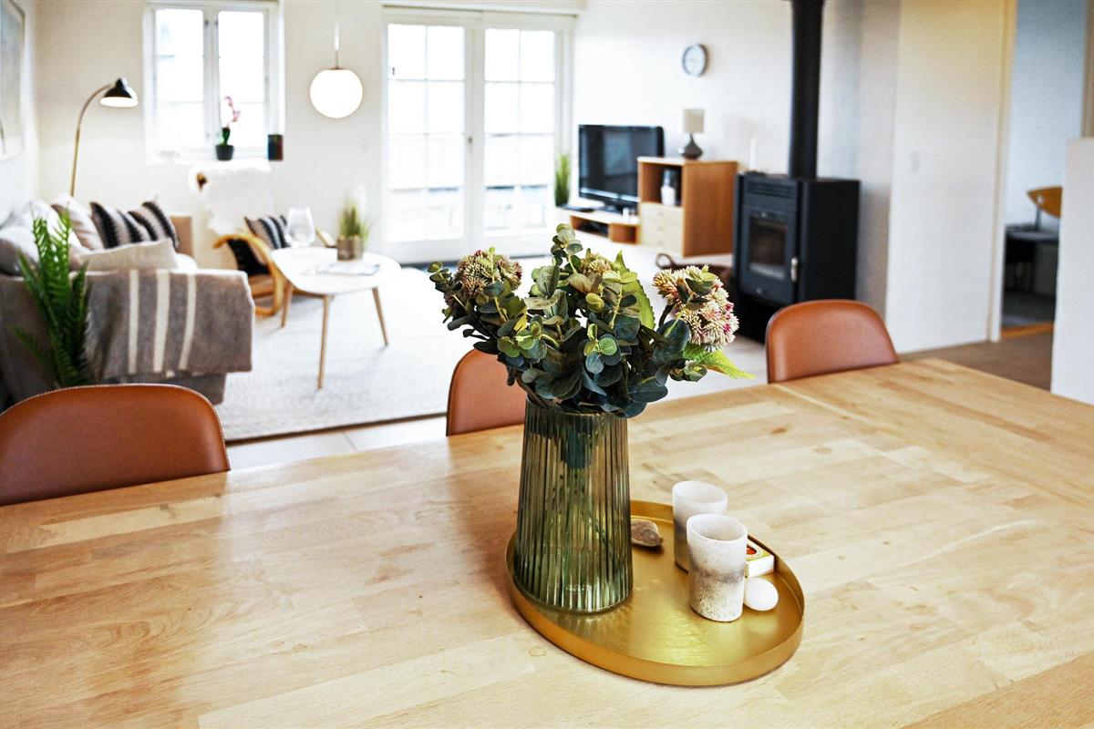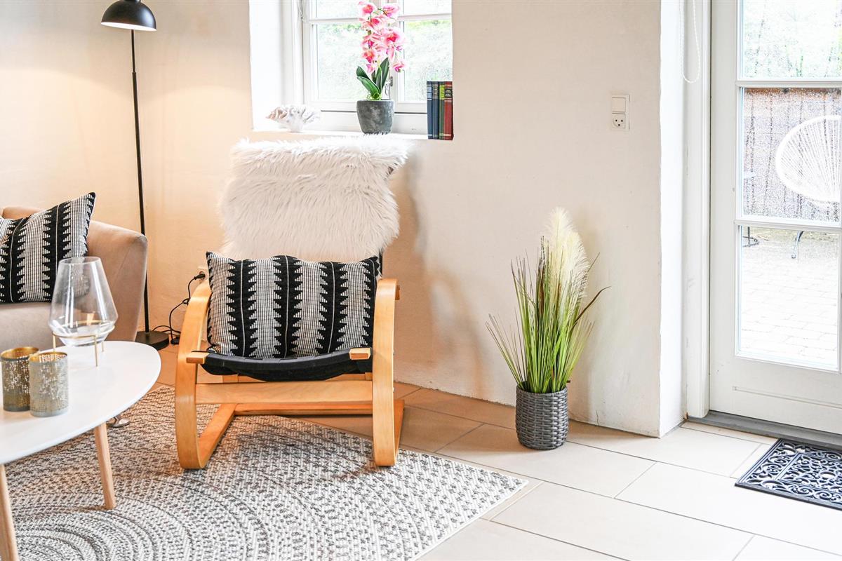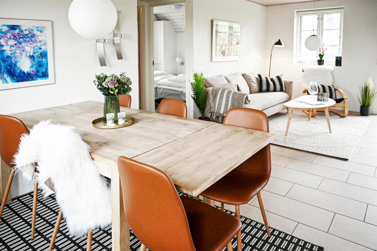 Het hart van het huis is de woonkeuken, die het huis in tweeën deelt. Het huis heeft een moderne keuken die alles heeft voor een geslaagde vakantie. Door de open verbinding met de woonkamer bent u altijd samen, ook als het eten wordt bereid. De kamer heeft vloerverwarming en een houtkachel. Vanuit de woonkamer heeft u toegang tot een groot, afgesloten terras op het zuidwesten, waar u heerlijk kunt dineren en zonnen. Als u ooit uit eten wilt, is er een restaurant, een winkel, een buitenzwembad en minigolf op slechts 5 m van het huis.