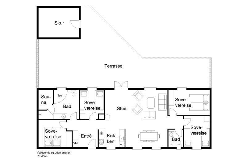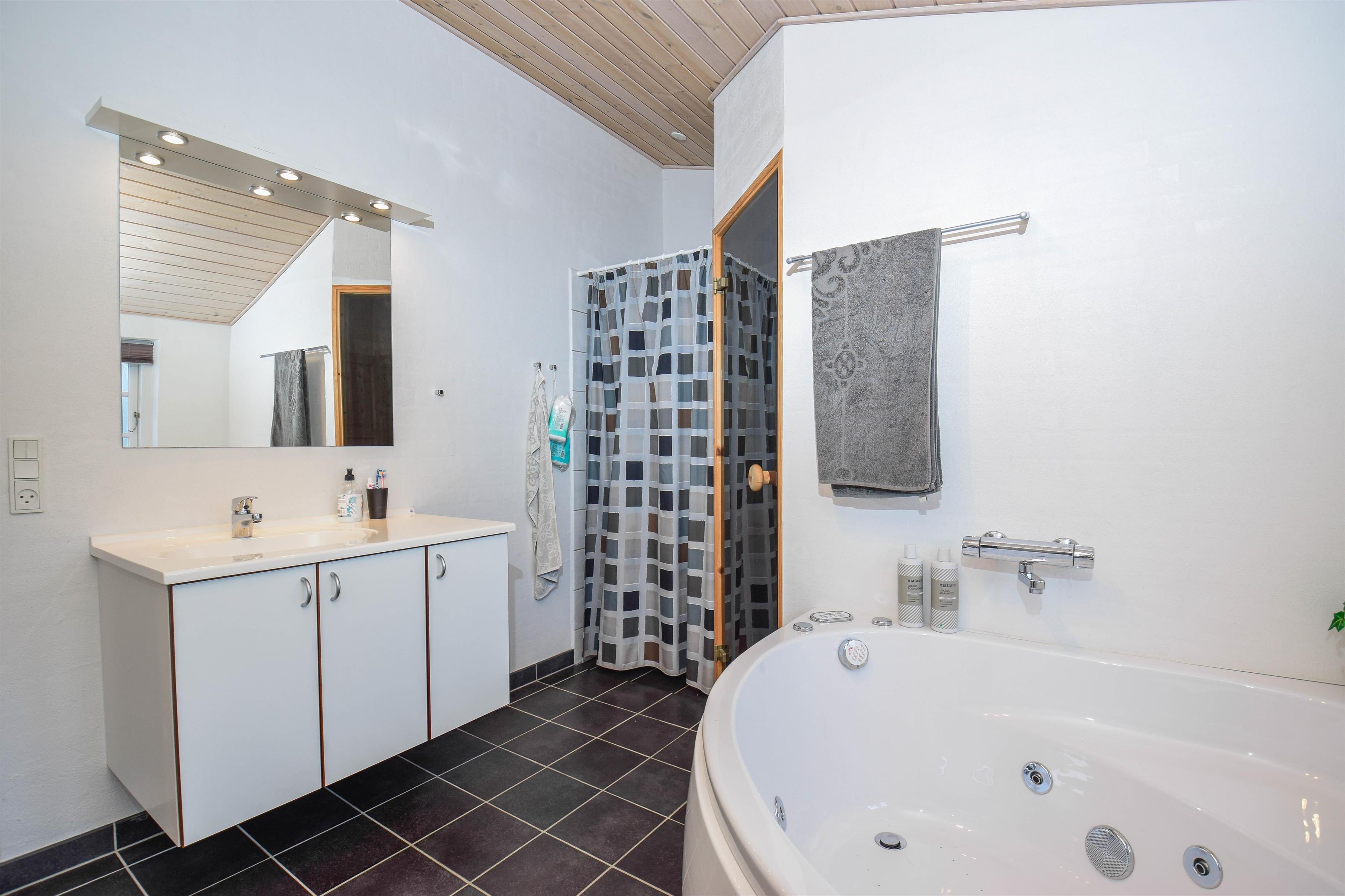 Layout: Entrance hallway. Beautiful living room with easy-care tiled floor, good wood-burning stove and underfloor heating. Open-plan kitchen and dining table for 6 people. A total of 4 bedrooms. Practical: in each wing of the house there is a bedroom with a double bed and one with 2 single beds. This layout also makes the house ideal for 2 couples, as you have your own wing and a bathroom. The bedrooms are carpeted. There are 2 bathrooms, a large one with sauna, whirlpool and shower cubicle and a smaller one, also with shower cubicle.