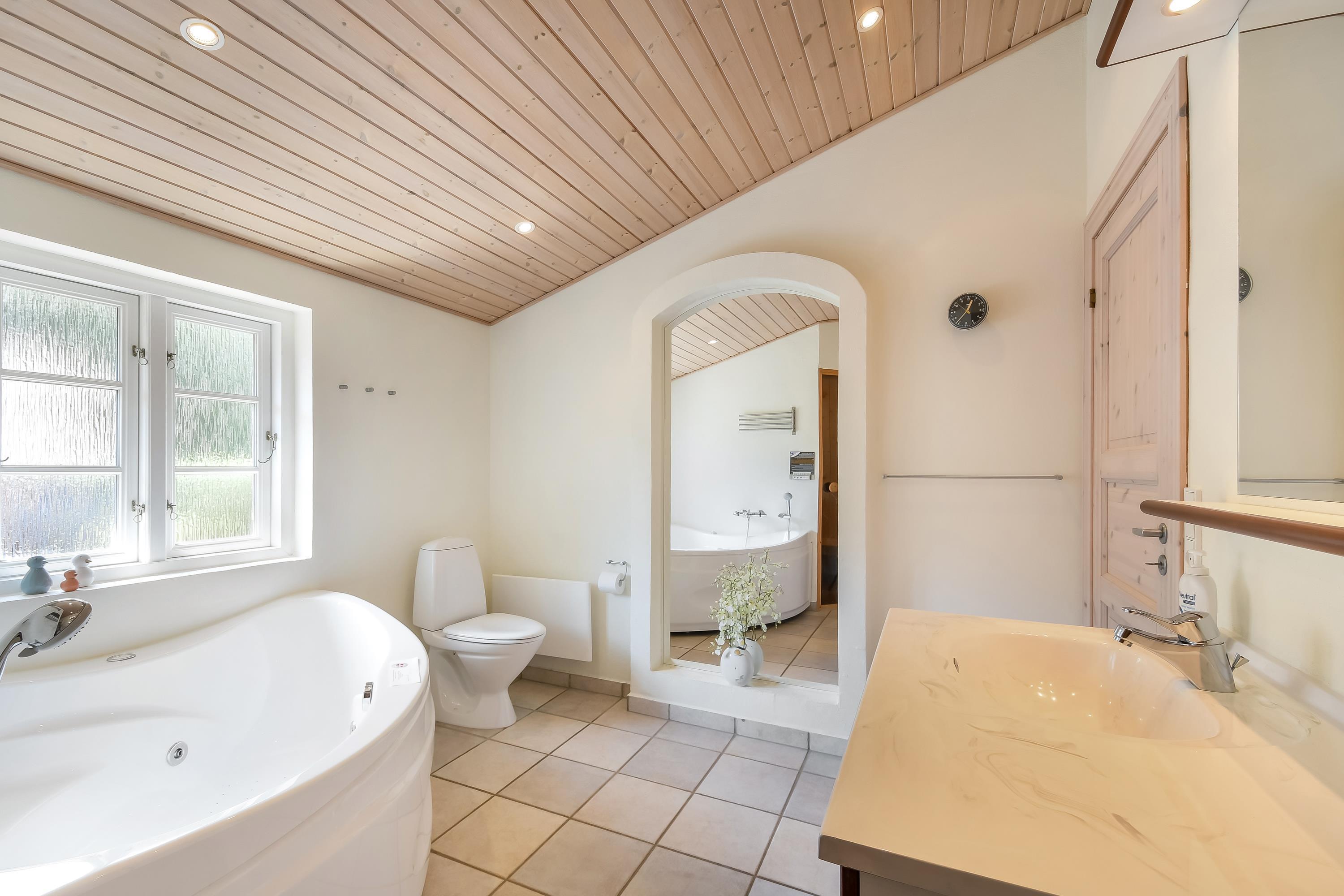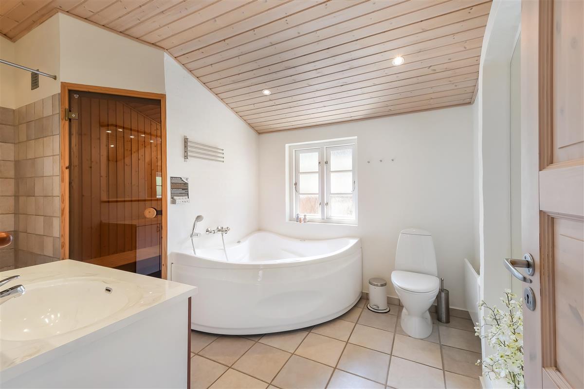 There are 2 bathrooms, one in each wing, one of which is equipped with whirlpool and sauna.