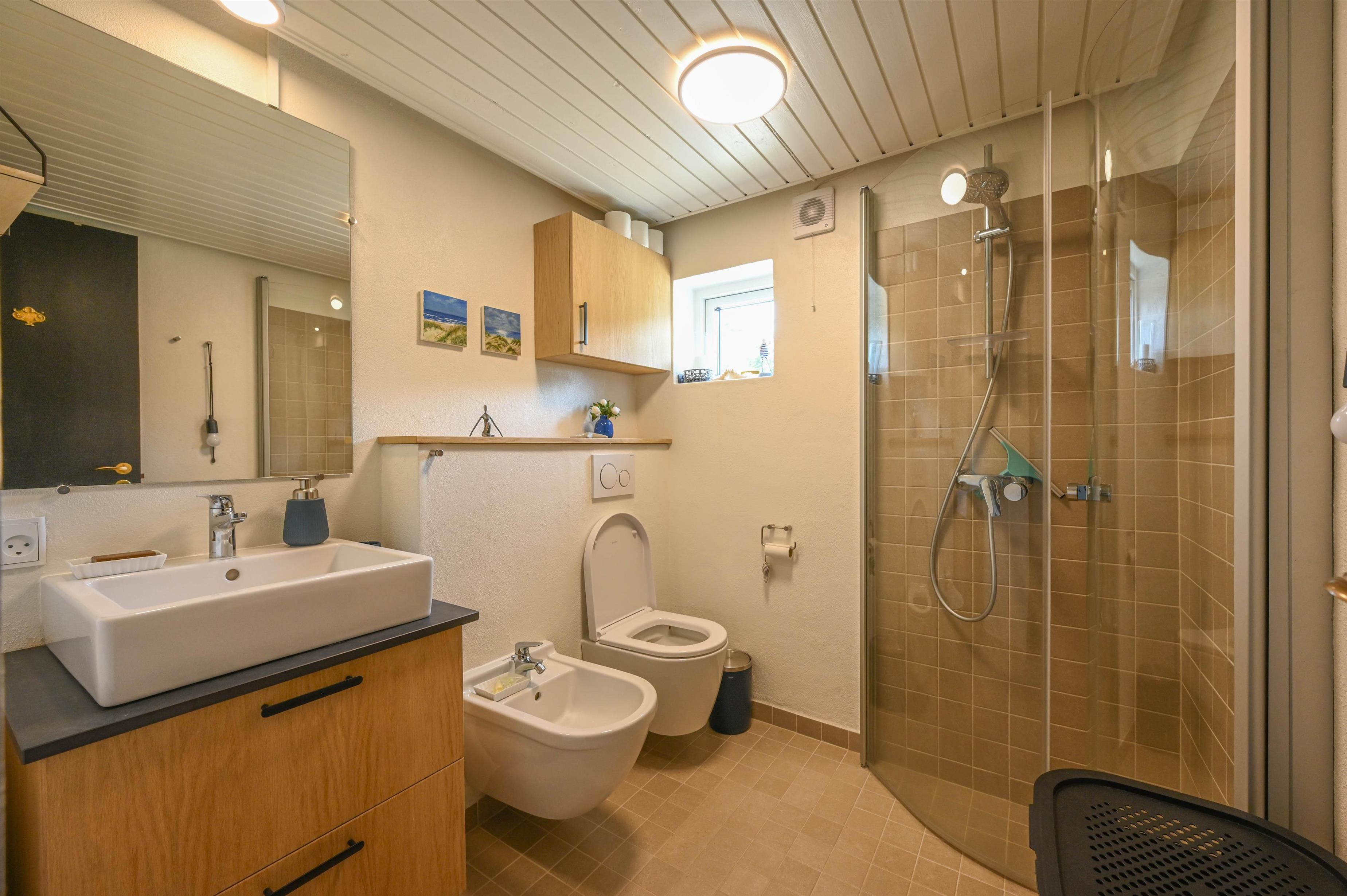 On the upper floor, there are two bedrooms: One with a double bed that has electric adjustment and one with two single beds - ideal for children or guests.