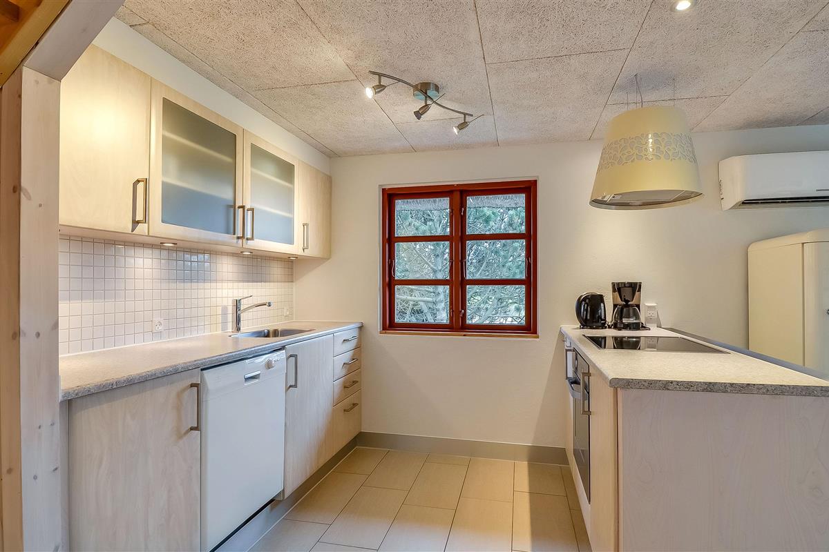 The bright and modern kitchen is open to the living area, where a dining table and a cosy sofa corner with a wood-burning stove invite you to relax. From here, you have direct access to the sunny south-facing terrace – the perfect place for your first coffee of the day, to relax in the sun or for a lovely barbecue evening.
