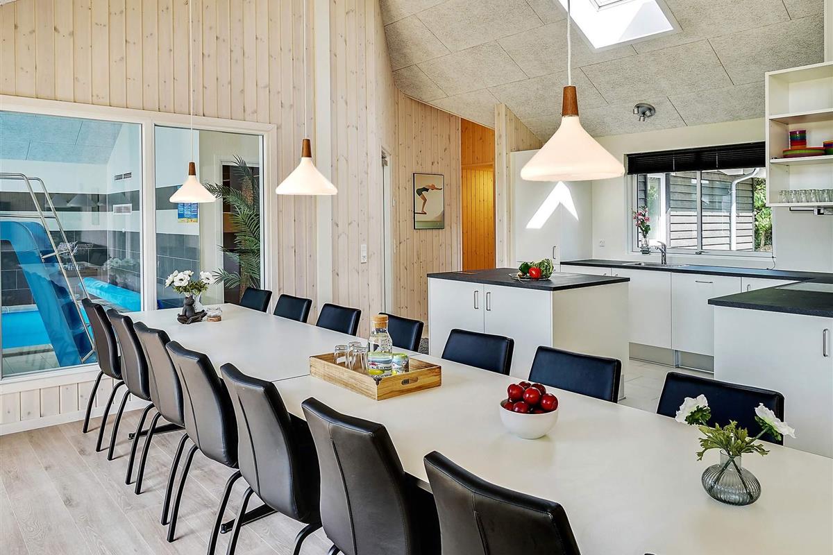 Das Haus ist sehr geräumig und hat eine gute Raumaufteilung, mit zwei Schlafbereichen, zu denen je ein Bad gehört. Das dritte Bad befindet sich im Poolbereich. Eines der Bäder ist zudem sehr familienfreundlich, indem eine Kindertoilette installiert ist. Alle 6 Schlafzimmer und der Hems haben Boxspringmatratzen. Fußbodenheizung im gesamten Haus. Im Wohnzimmer können Sie es sich auf dem Sofa gemütlich machen, während der Holzofen wohlige Wärme verbreitet. Für die kleinsten Gäste gibt es einen Kinderhochstuhl für den Esstisch und draußen sind Schaukel, Spielturm und Sandkasten vorhanden. Genießen Sie die Sommertage auf der teilweise überdachten Terrassenfläche. Für größere Kinder gibt es ein Trampolin (Nutzung auf eigene Gefahr).