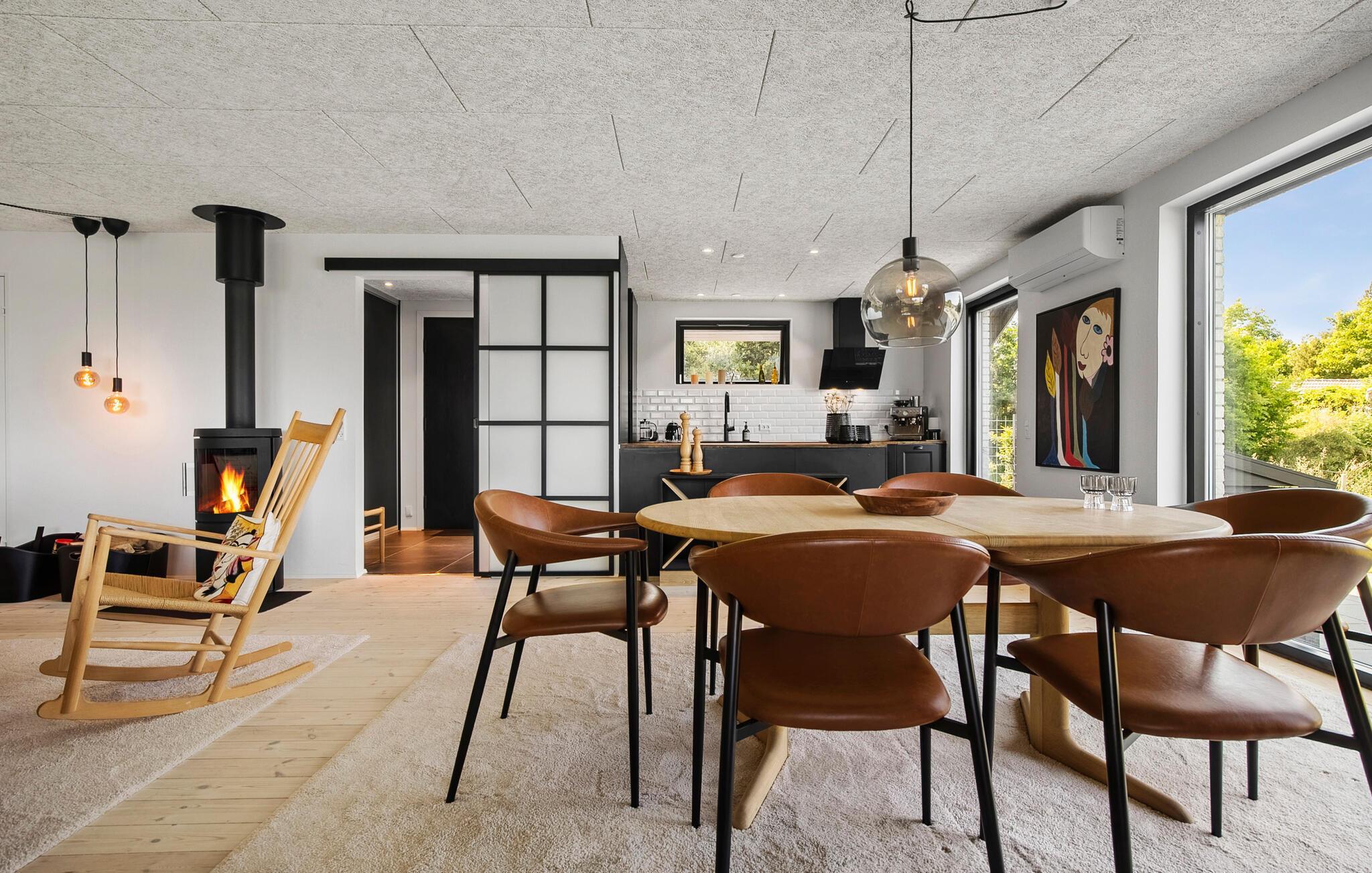 Je vakantiehuis combineert hedendaagse architectuur met landelijke charme. Stap binnen en geniet van de lichte en open sfeer van de woonkamer met zijn grote panoramische ramen. Ontspan bij de houtkachel, lees een boek in de schommelstoel of geniet van gezellige avonden aan de eettafel met uitzicht op het glooiende landschap. Het stijlvolle interieur met designmeubels, warme kleuren en smaakvolle details creëert een gezellige sfeer. Je vakantiemaaltijden bereiden gaat moeiteloos in de moderne keuken.
