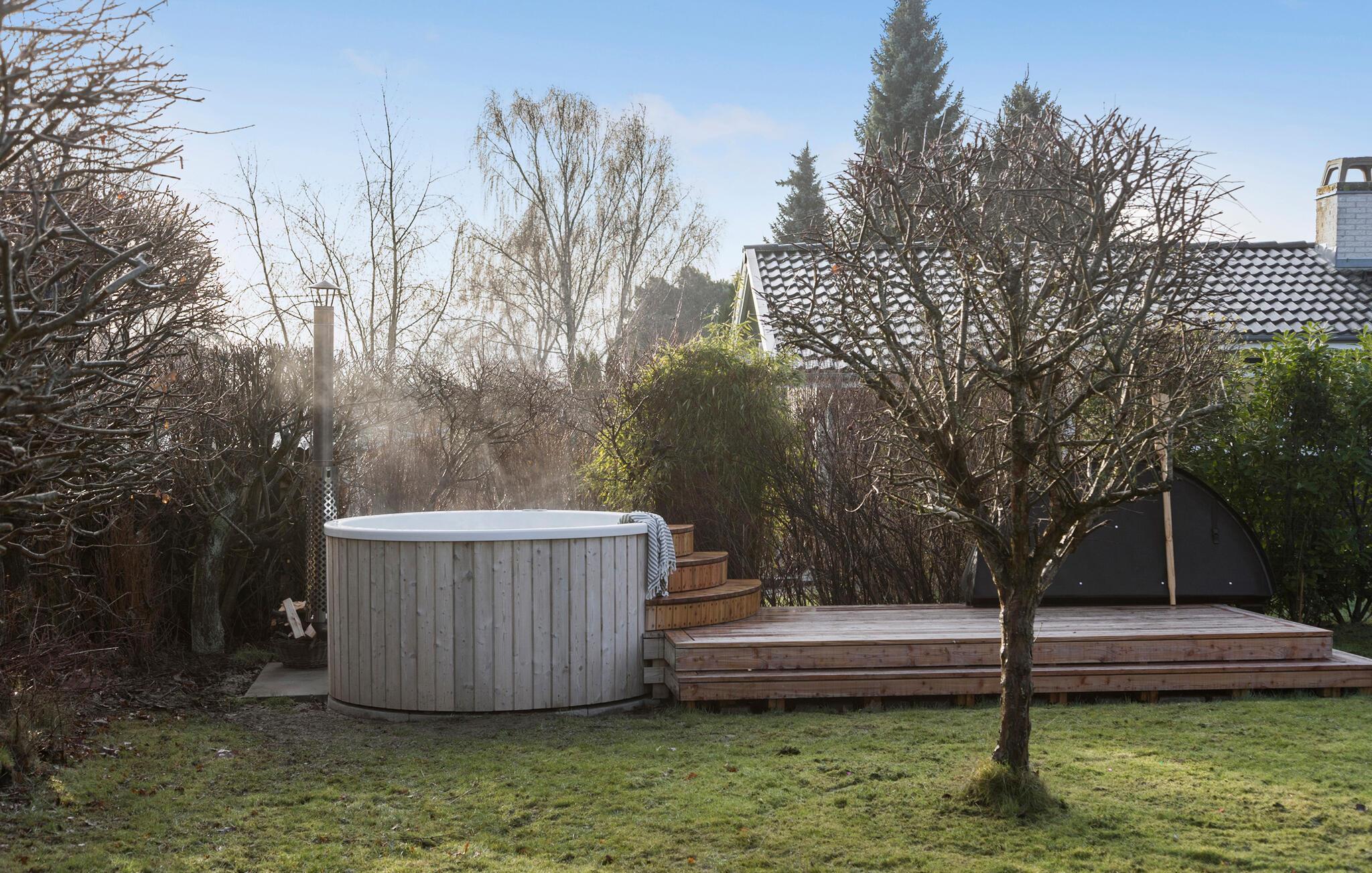 Dit charmante vakantiehuis in Vejby Strand ligt op slechts een korte wandeling van de zee. Grote ramen zorgen voor veel licht in de liefdevol ingerichte kamers en creëren een uitnodigende sfeer. Kook in de keuken en geniet van je maaltijden in de eethoek, die overloopt in de gezellige woonkamer met open haard, ideaal om te socializen. Je kunt genieten van zowel schaduw als zon op het gedeeltelijk overdekte terras, terwijl de kinderen zich vermaken op de speeltoestellen in de tuin. Een bijzonder hoogtepunt: het Finse houten bad, waar je kunt ontspannen na een lange dag in de frisse lucht.