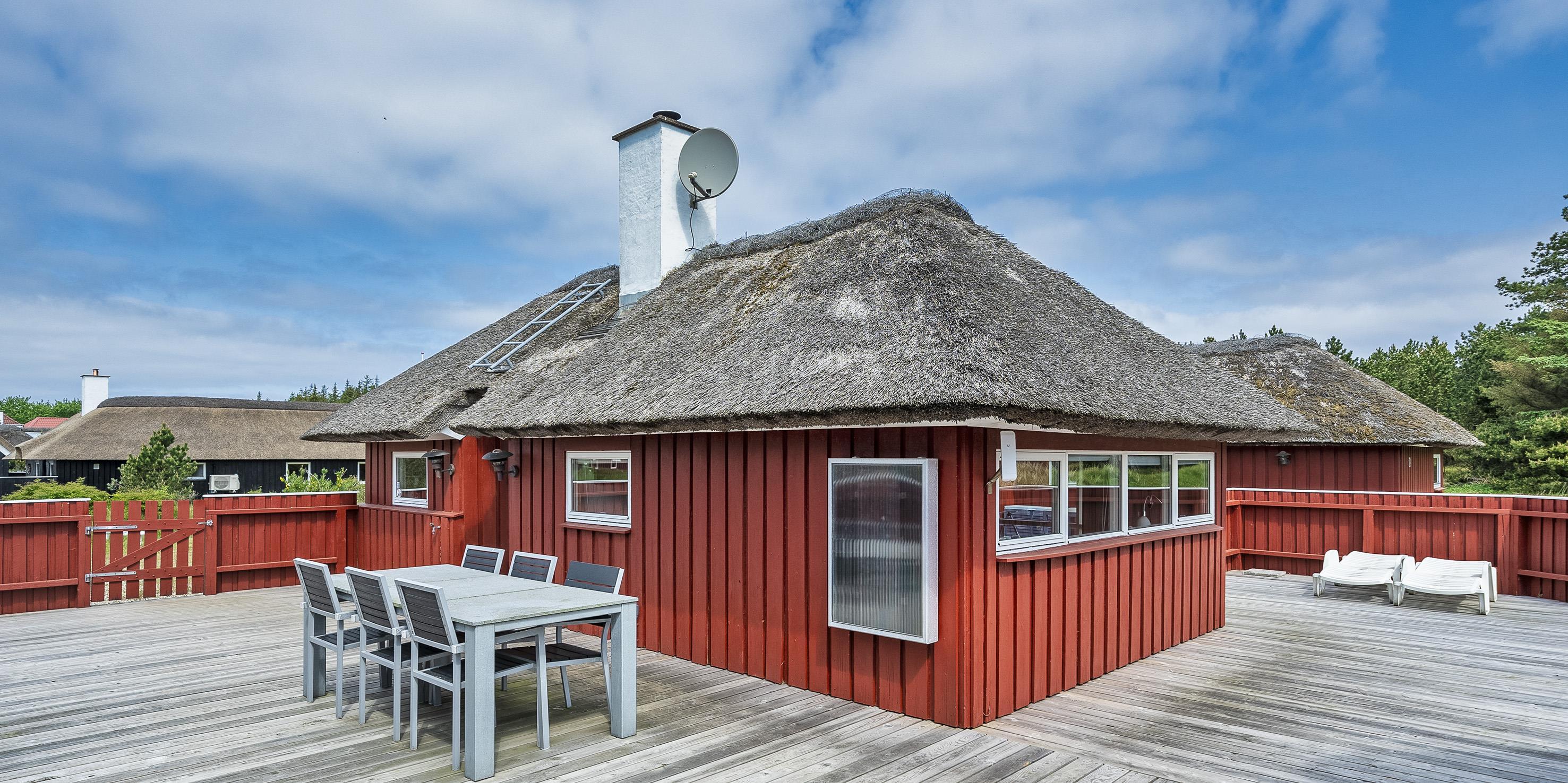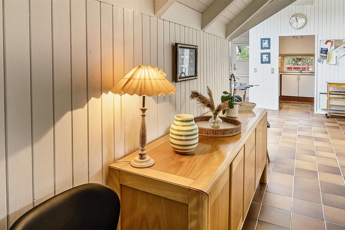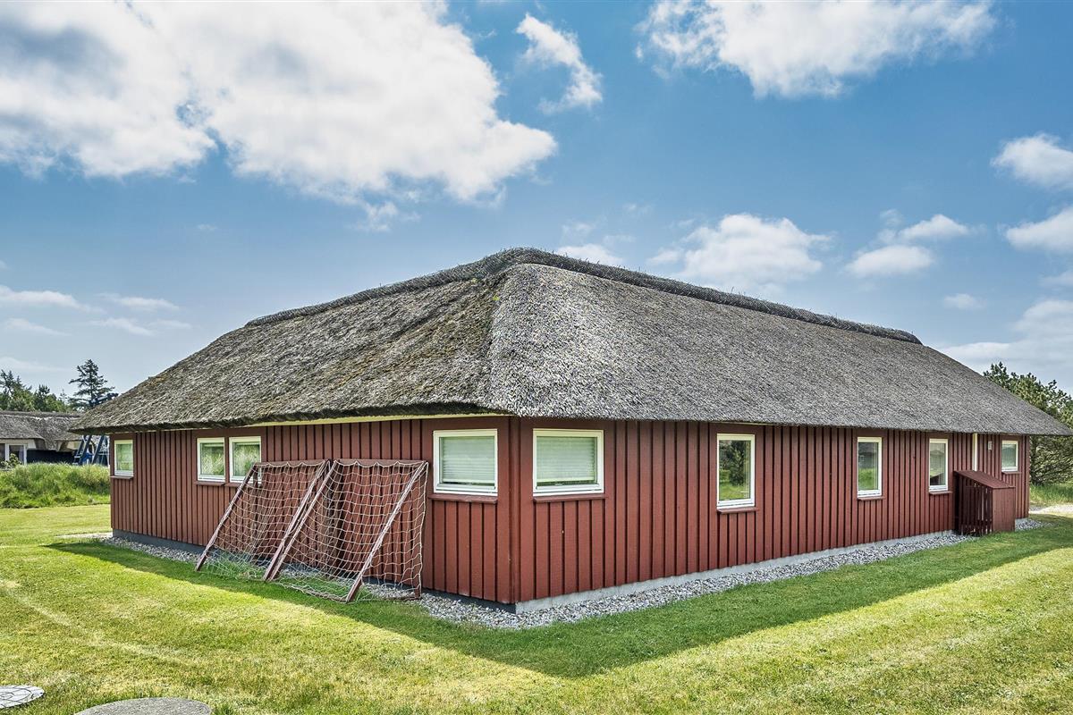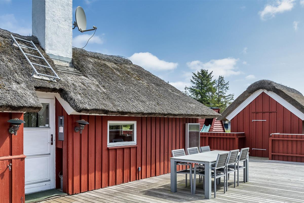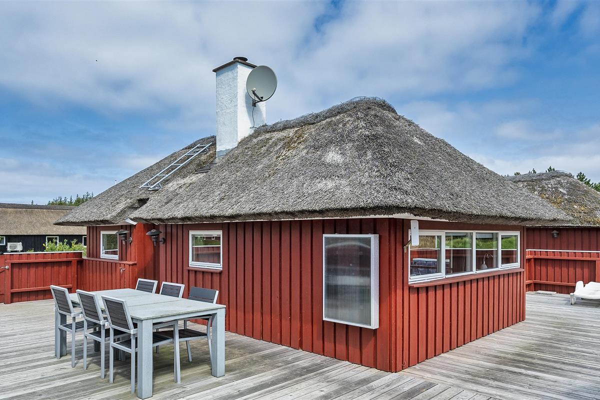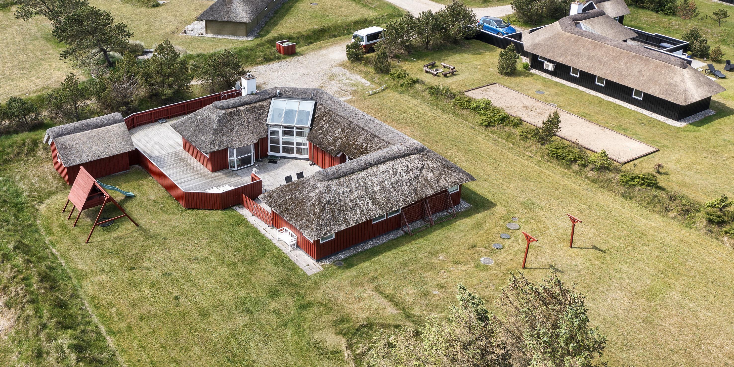 Tasteful summer house for 9 people, located on a natural plot approx. 1,500 meters from the beach. The house contains: Living room with wood-burning stove, television, Chromecast and satellite dish (no Danish programmes). Docking station for I-phone with built-in music. Kitchen with dishwasher and microwave. Large dining area with games room. Bathroom with shower/wc and spa. Washing machine and dryer. Guest toilet with shower. 4 bedrooms: DB + DB + DB + 3B. The house is partially heated by solar energy. Heat pump (air to air). Large, partially enclosed terrace with garden furniture. Play tower with swing for children. 1 dog ist allowed. Wi-Fi. Rying is not allowed! Year of construction 1988, renovated 2005.