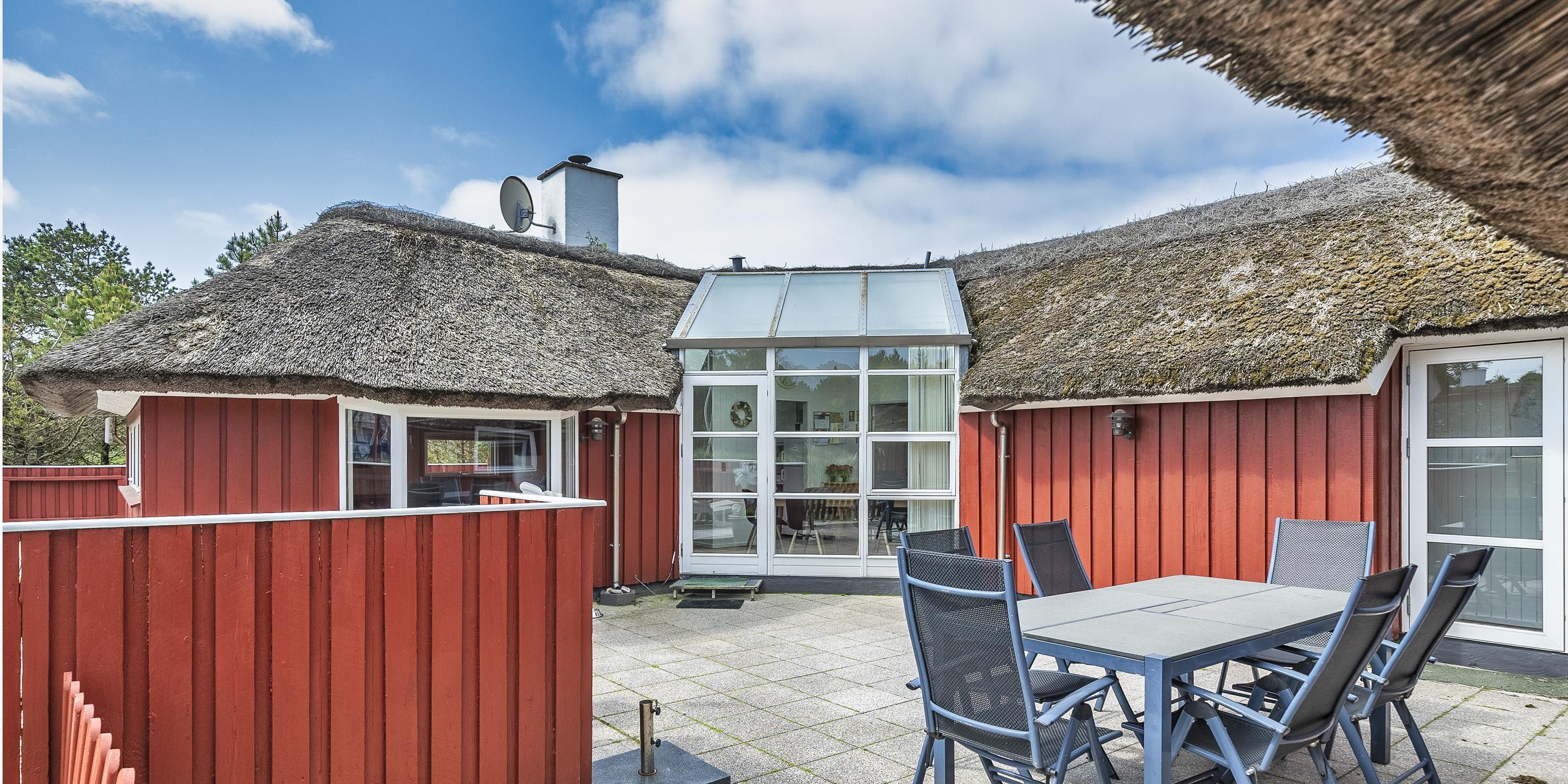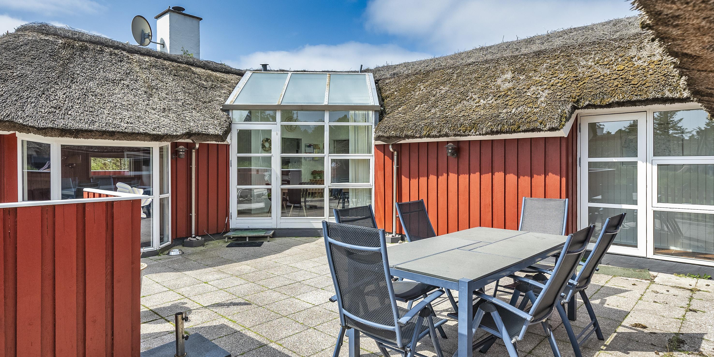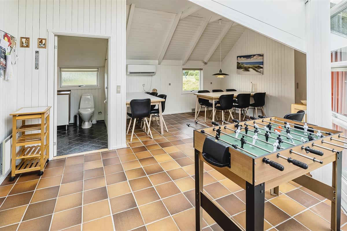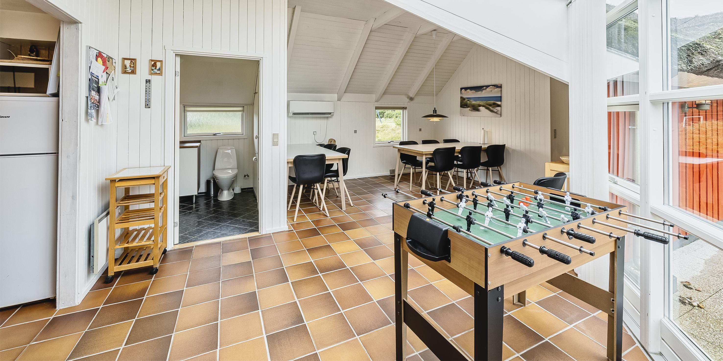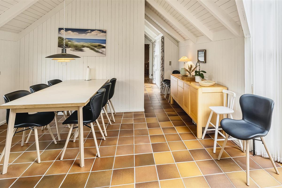 Tasteful summer house for 9 people, located on a natural plot approx. 1,500 meters from the beach. The house contains: Living room with wood-burning stove, television, Chromecast and satellite dish (no Danish programmes). Docking station for I-phone with built-in music. Kitchen with dishwasher and microwave. Large dining area with games room. Bathroom with shower/wc and spa. Washing machine and dryer. Guest toilet with shower. 4 bedrooms: DB + DB + DB + 3B. The house is partially heated by solar energy. Heat pump (air to air). Large, partially enclosed terrace with garden furniture. Play tower with swing for children. 1 dog ist allowed. Wi-Fi. Rying is not allowed! Year of construction 1988, renovated 2005.