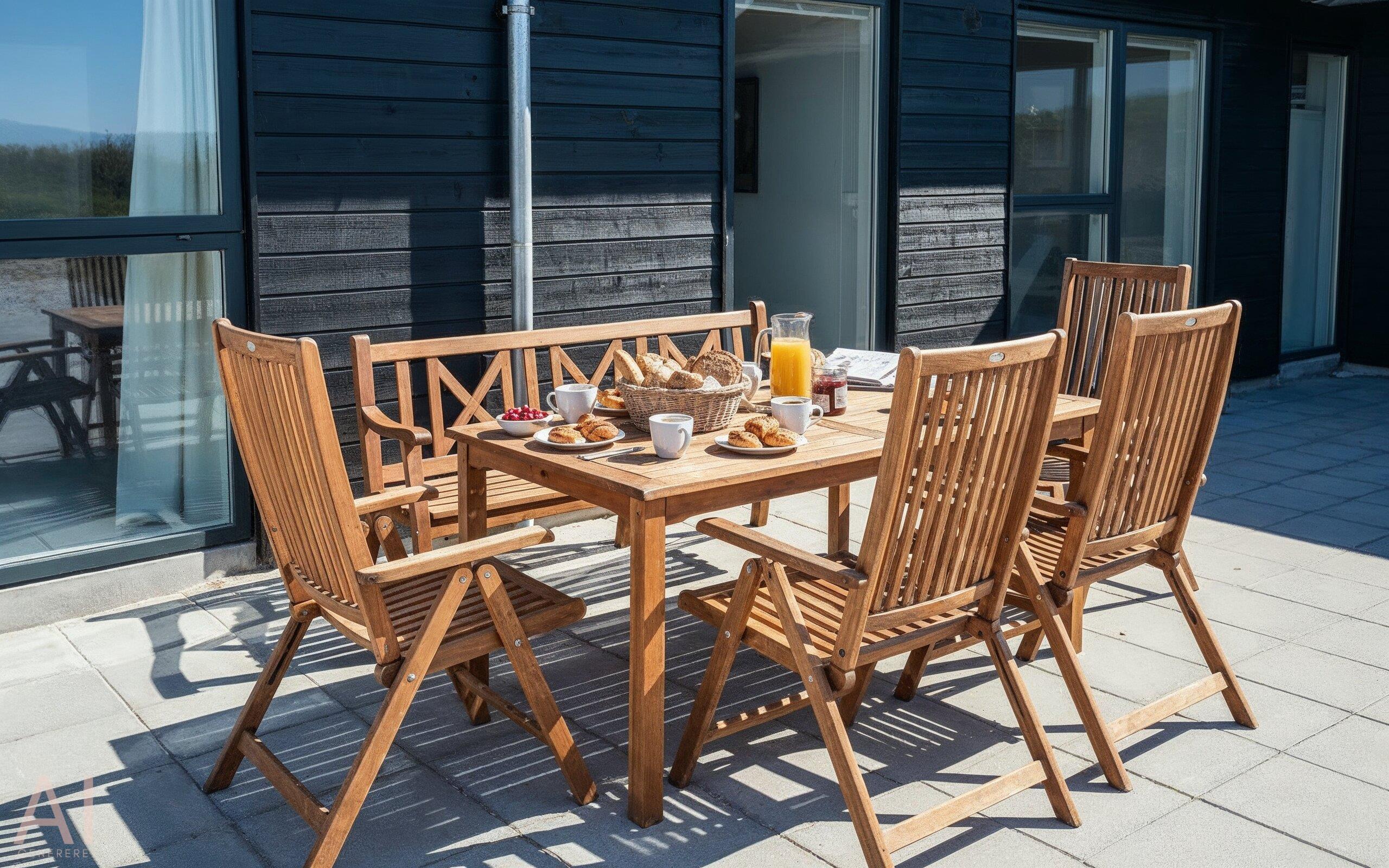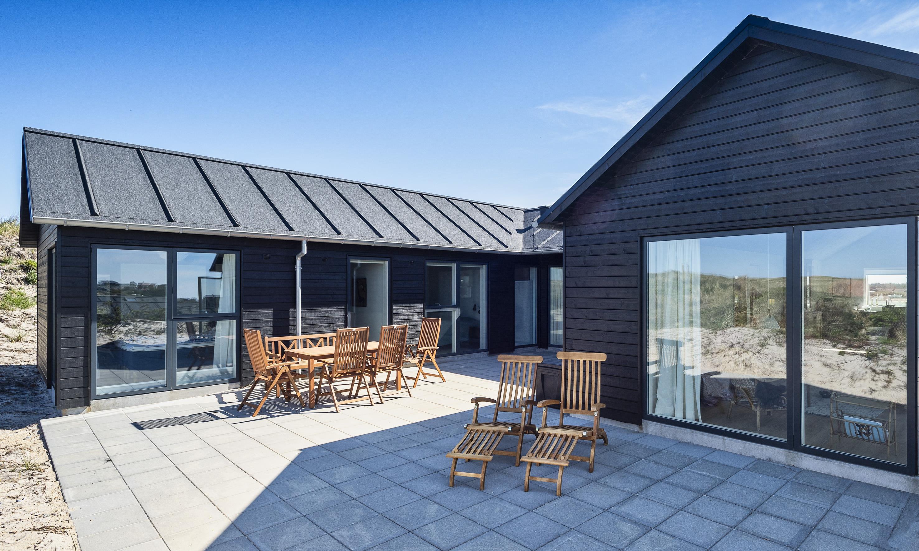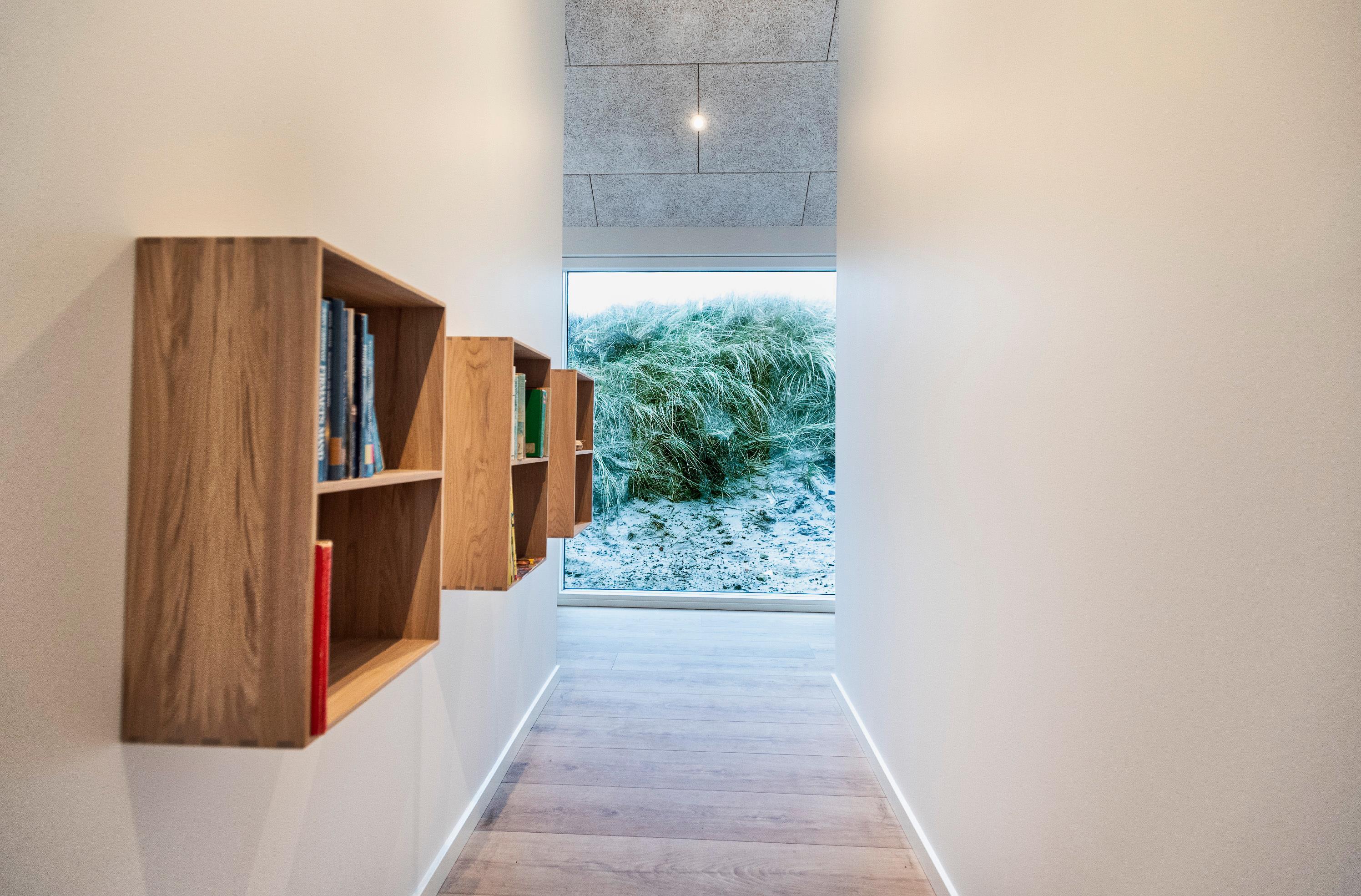 The house is built around the entrance area, which is the heart of the house, a spacious hall with several functions, such as entrance, garden room, cozy room and with access to the house's fantastic terrace to the west. From the hall you come across the large kitchen-dining room and the living room. The kitchen is built on the east-facing side of the house. From here there is a view of the cottage area behind, garden doors to the north and south, where you can easily operate the house's terraces and it is also open to the family room and living room. The kitchen features black handle-free elements with dishwasher, easy-to-use oven at working height, fridge/freezer combination and ceramic hobs. The kitchen is bounded by a half-wall towards a lovely dining area with a large window to the south. The living room appears with a floating sofa and retro rattan chairs. From here the view over the dunes can be enjoyed and the evening can be enjoyed with the comfort of a movie from the house's TV, board games or a good book on the sofa. The house has a Bio Fireplace where only Bio Ethanol may be used. A new bottle can be purchased for DKK 40.