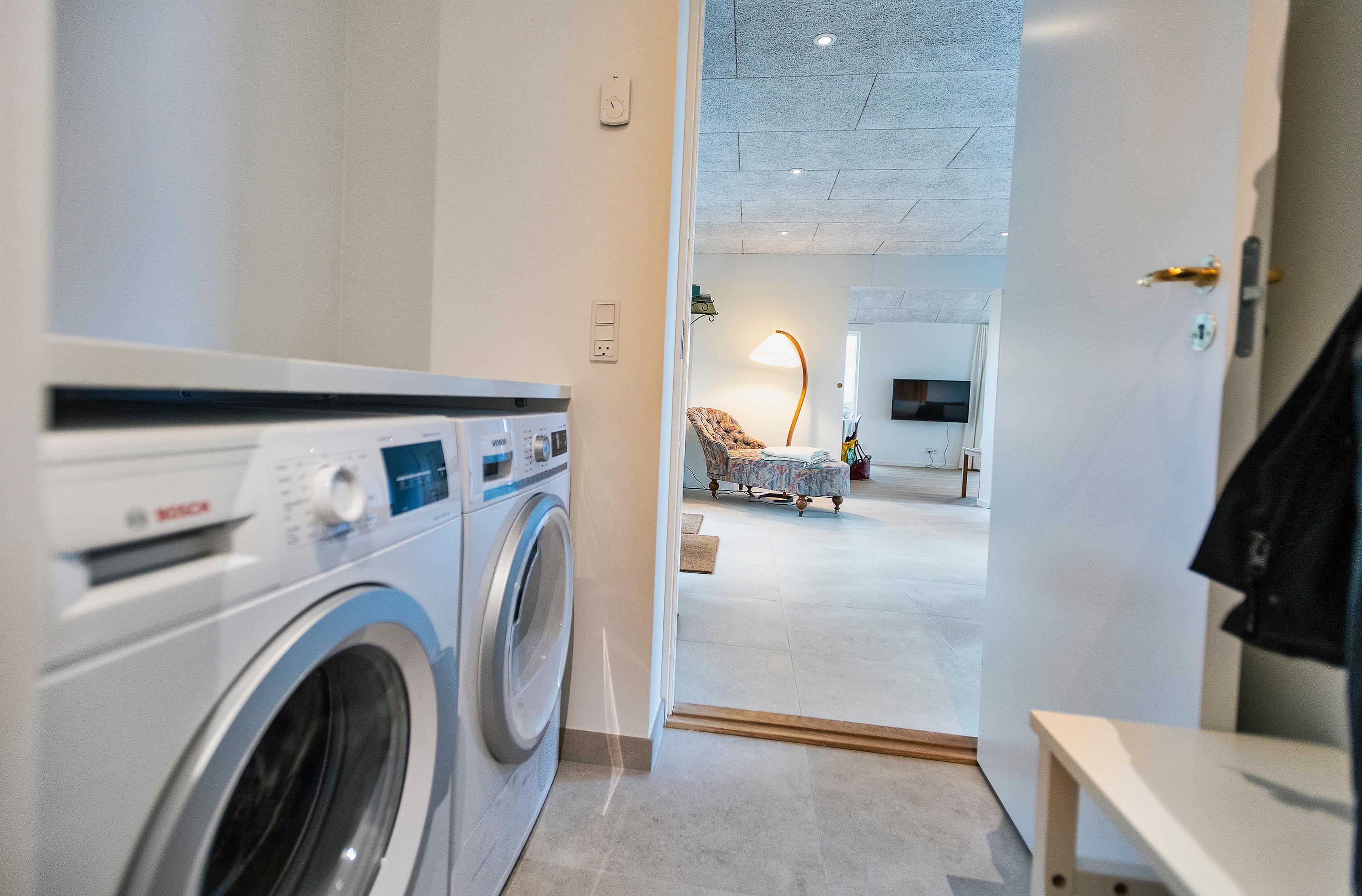 The house's additional rooms are accessed from the hall via a distribution corridor to 4 bedrooms and 2 bathrooms: DB + DB + DB + 2B. To the left in the distribution corridor you come down to a master bedroom with a fantastic south-west facing view. The bedroom is furnished with a double bed (2 beds of 90 x 200 cm), television with Stofa summer house package and a large wardrobe. Furthermore, 1 bedroom with 1 double bed (2 beds of 80 x 200 cm) and 1 bedroom with 1 bunk bed. Lovely bathroom with shower/wc and washing arrangement. To the right in the distribution corridor you come to another bedroom with a double bed (2 beds of 90 x 200 cm). Master bathroom with sauna, corner spa, shower, wall-hung wc and a cupboard arrangement and exit to outdoor shower. All bedrooms are prepared with internet connection. Utility room with good wardrobe space, washing machine and dryer. All rooms appear with pitched ceilings and several large windows with good light.
