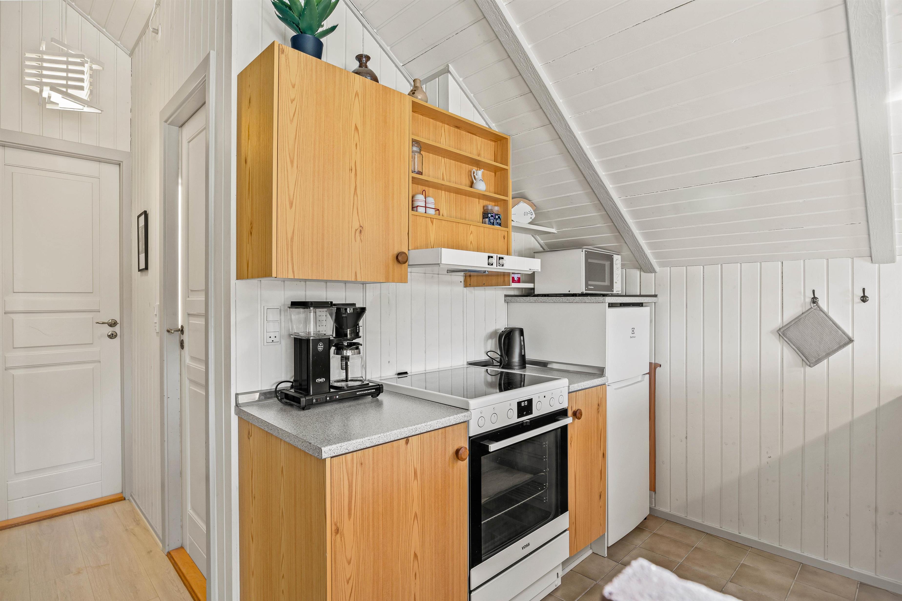 The open-plan living area, with its charming sloped ceilings, invites you to enjoy cosy "hygge" moments. Views of pine trees, heather, and grasses are balm for the soul. The open-plan kitchen has everything you need for a delightful culinary holiday. The dining table isn't just for shared meals – it's perfect for evening games too. The only thing that could enhance the cosiness is a roaring fire in the wood-burning stove.