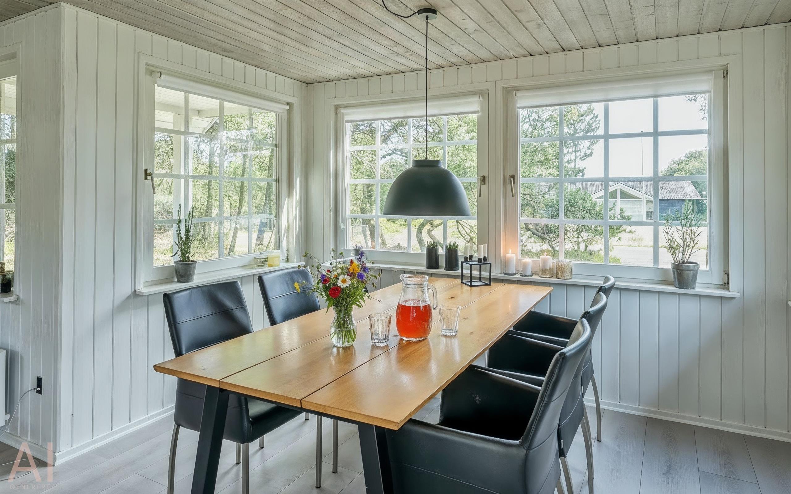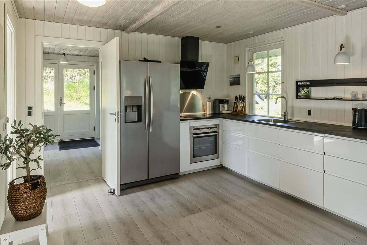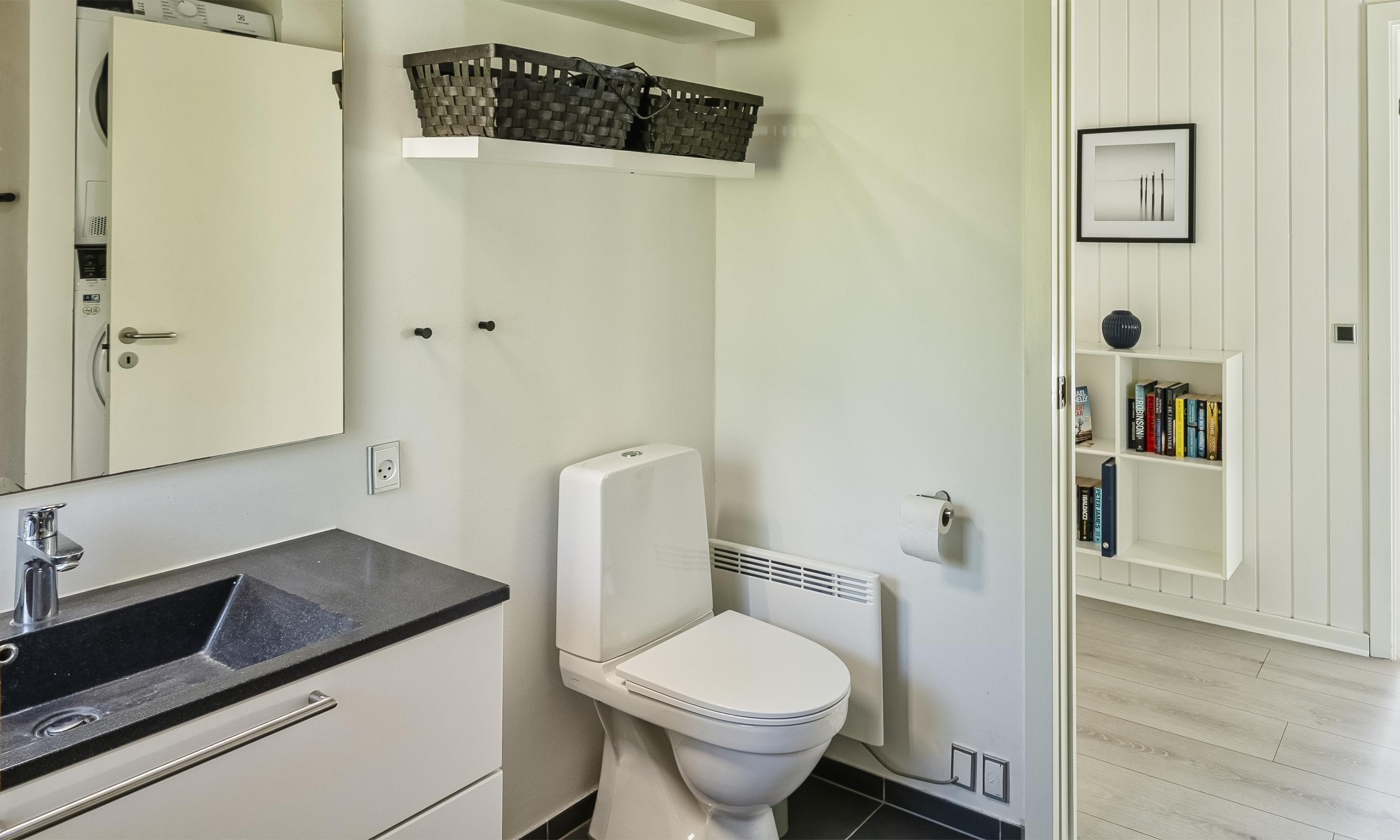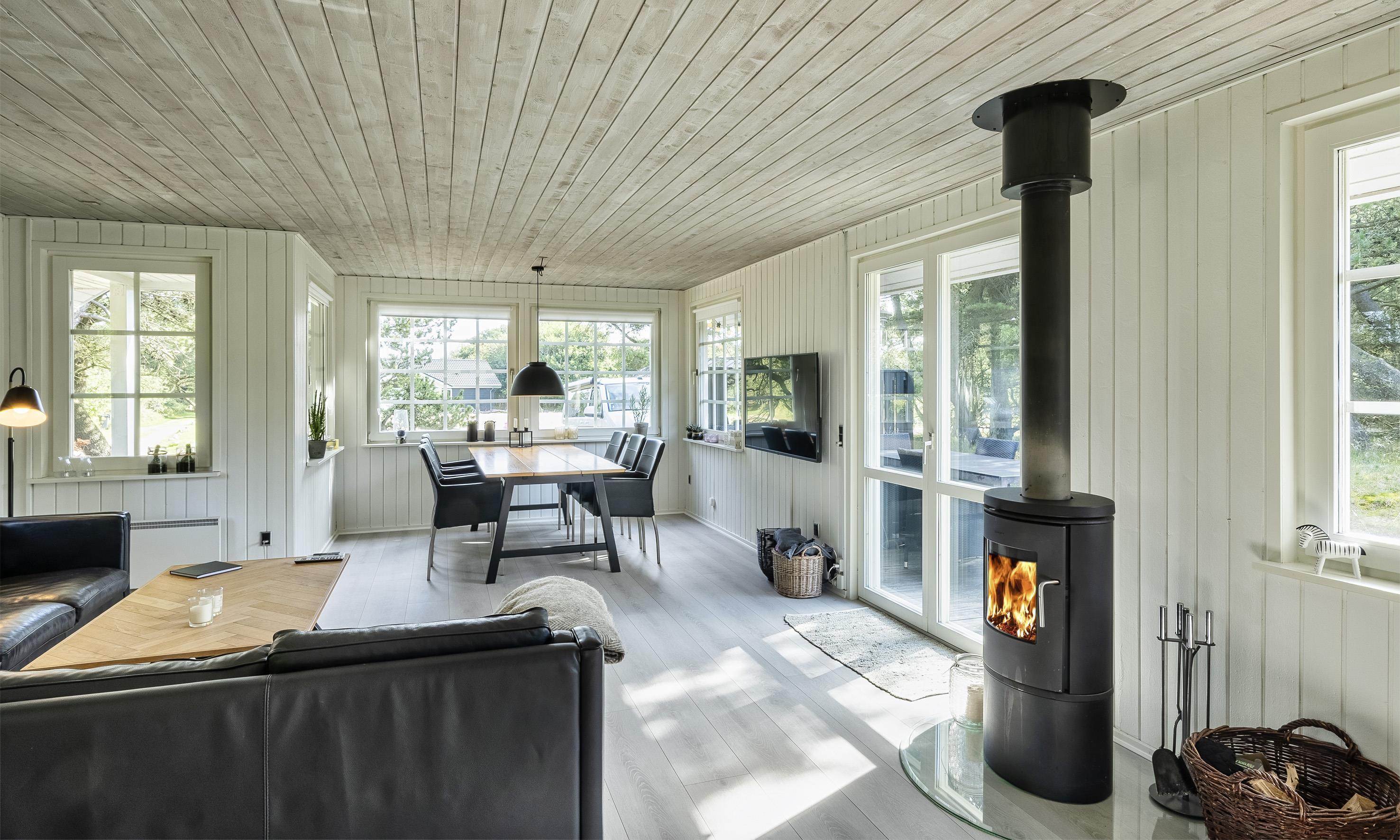 The house is well-furnished with good natural light and includes an entrance/back hallway with ample space for outerwear and shoes. A well-equipped kitchen, dining area, and living room with access to the terrace. There’s a wood-burning stove and a heat pump. The bathroom has a toilet, sink, shower, washing machine, and dryer, along with tiled floors with underfloor heating. Two bedrooms with wardrobe space. One bedroom has a double bed, and the other has two single beds (DB + 2SB).