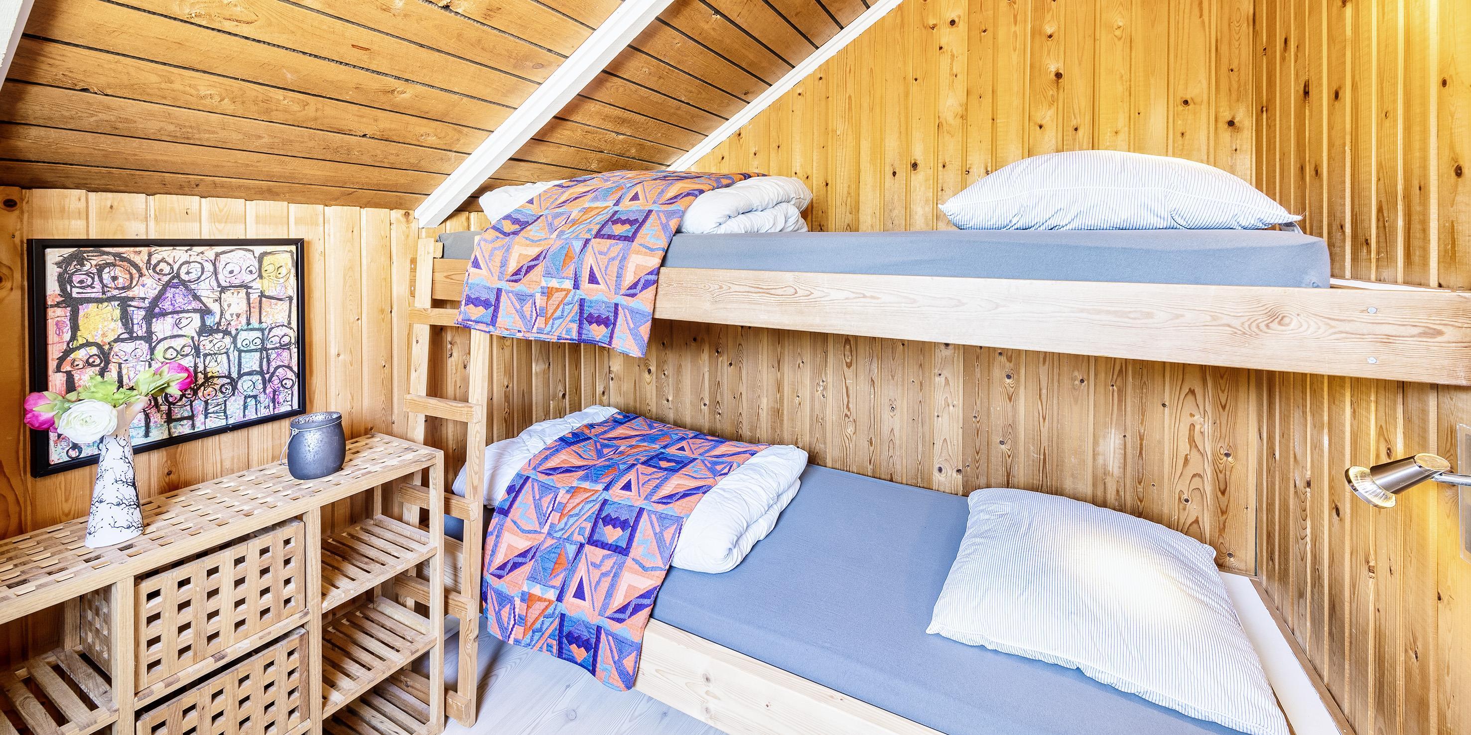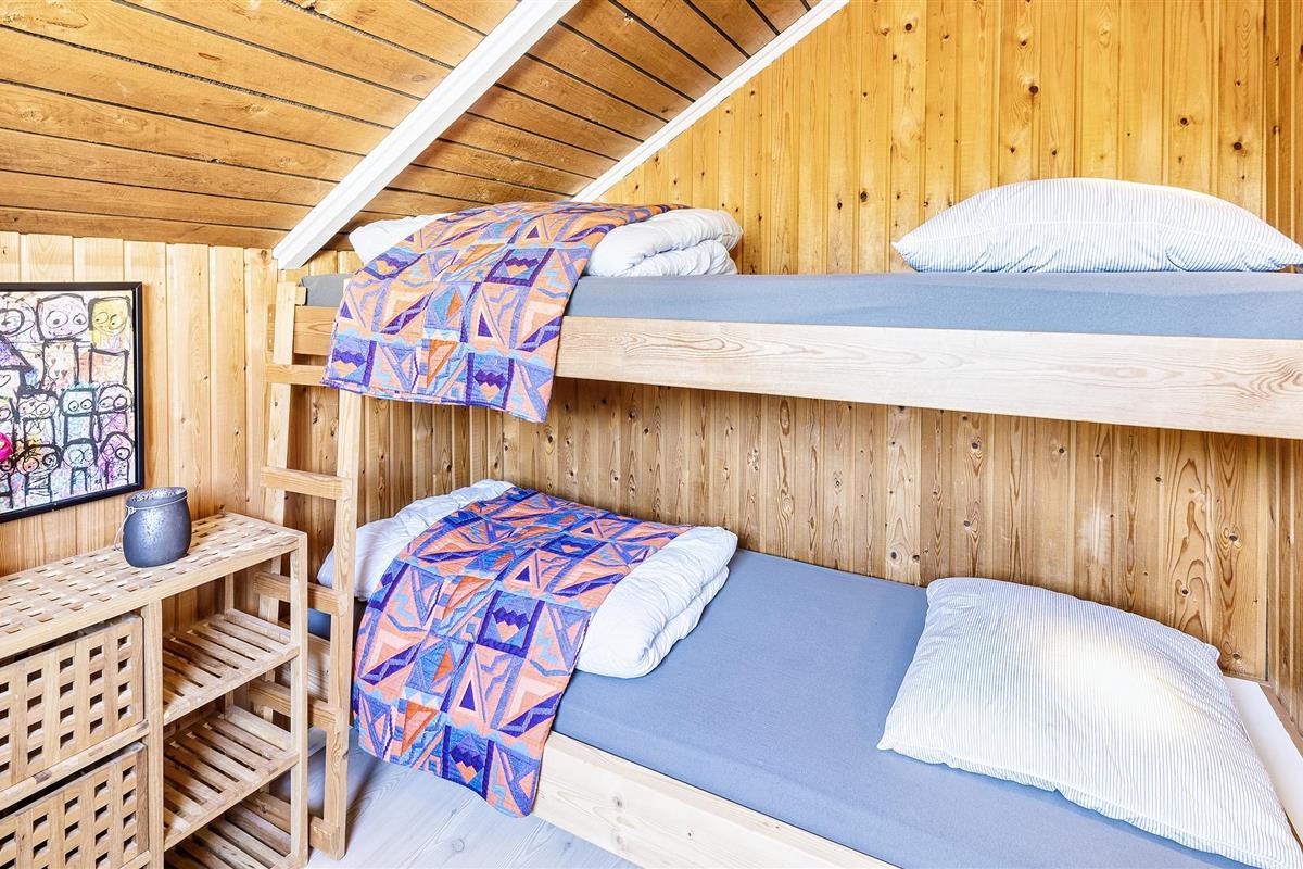 3 bedrooms. 2 with double bed 180x200 cm. 1 with bunk bed (2 single beds 90x200 cm).