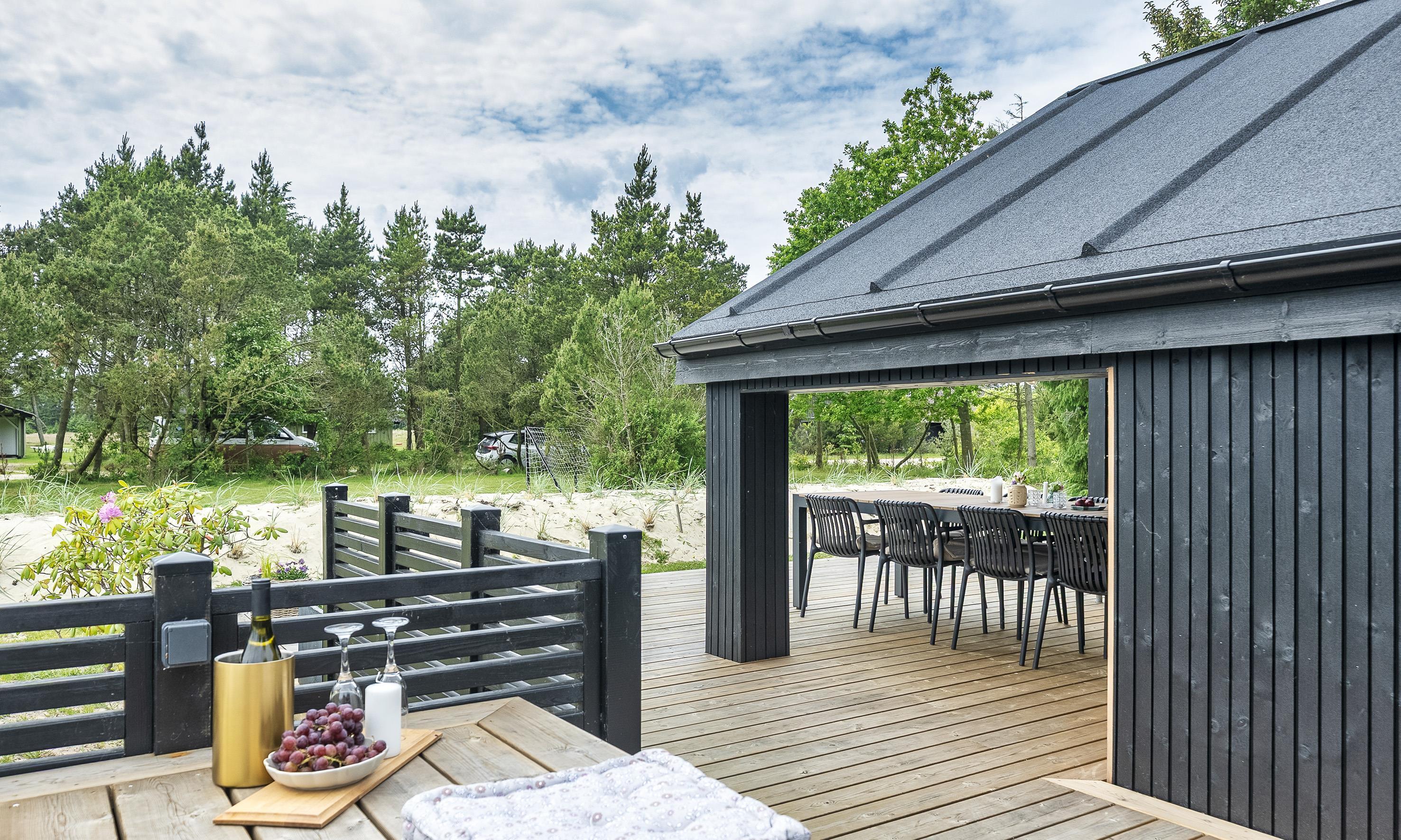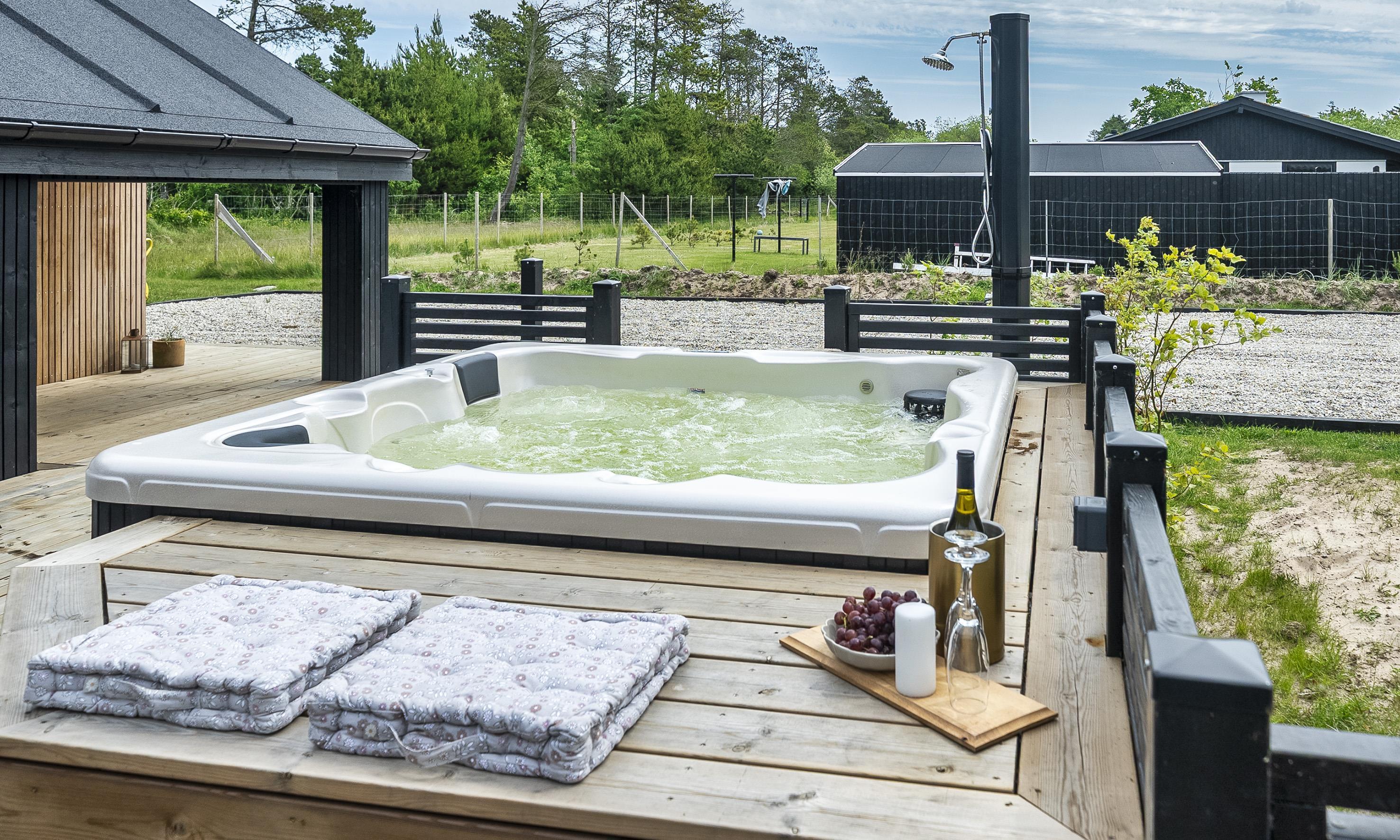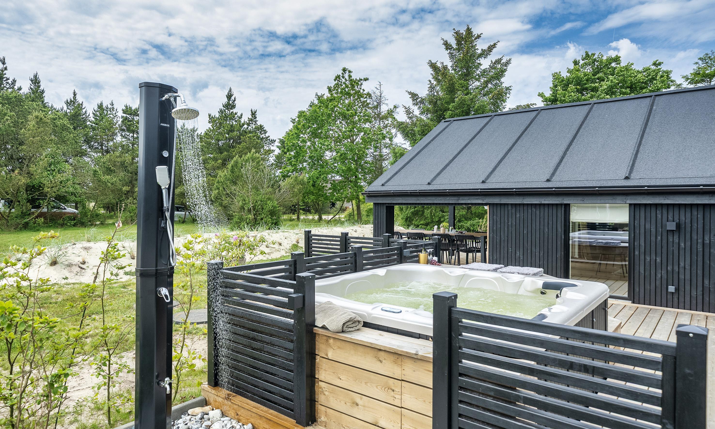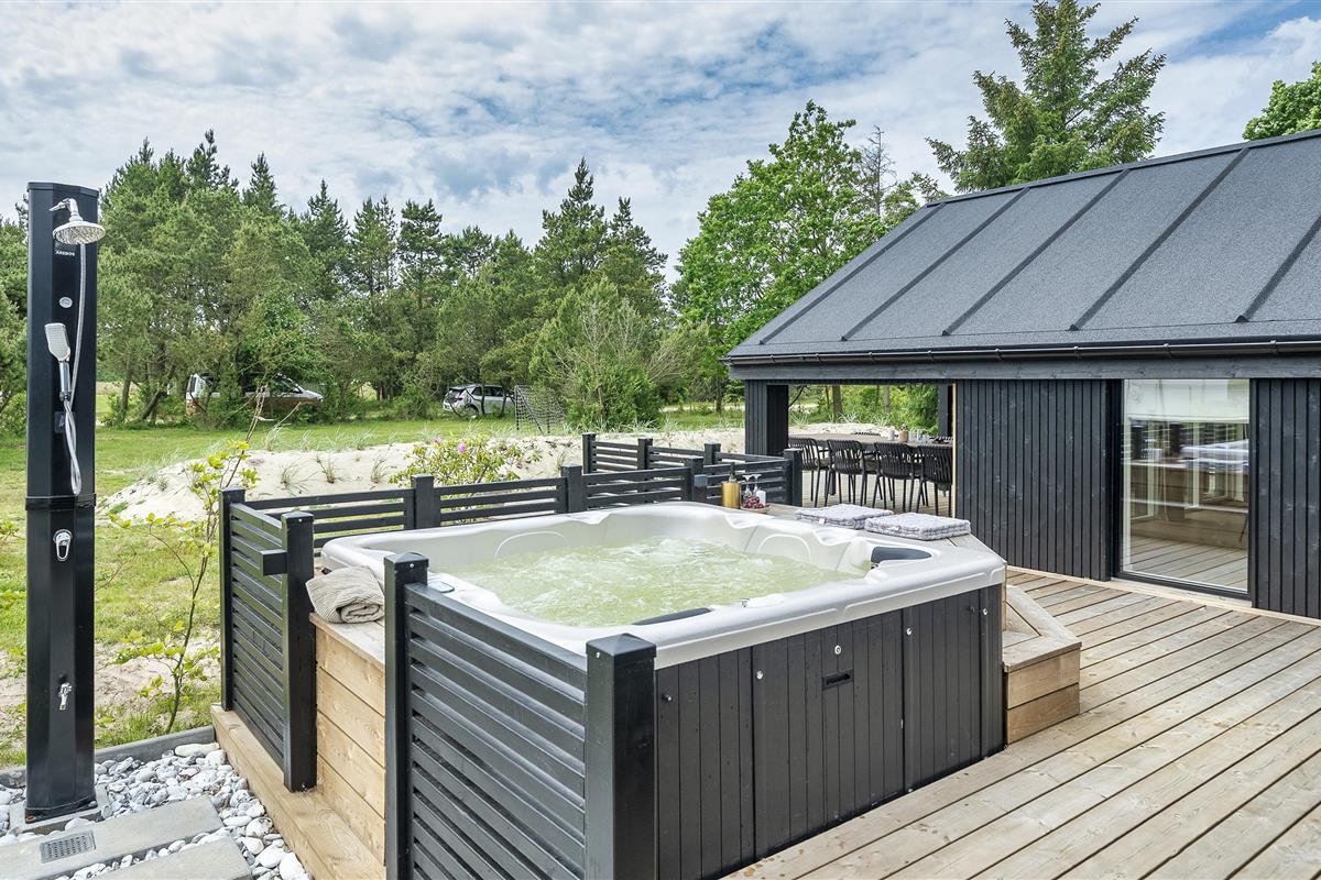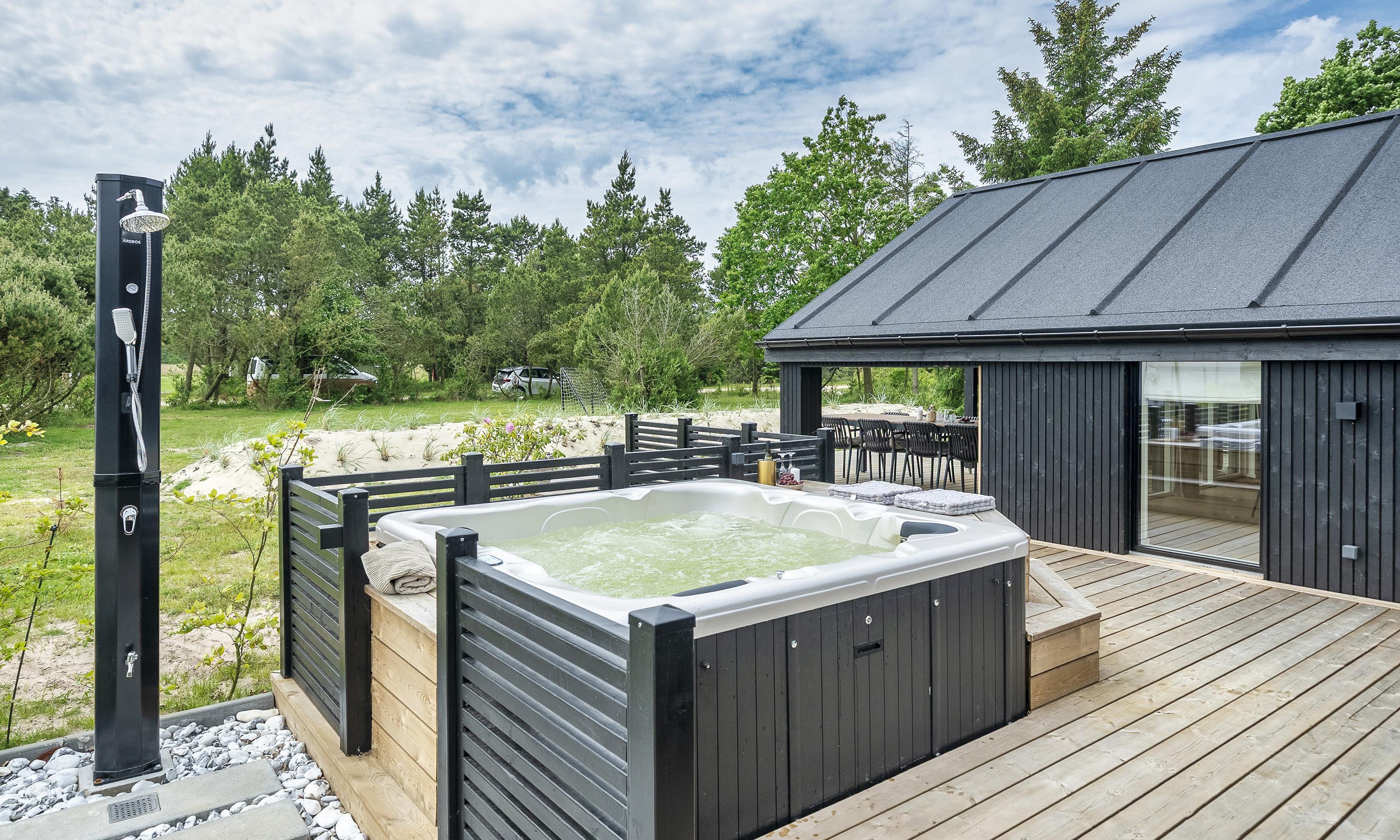 Welcome to this beautiful, newly built holiday home that combines modern comfort with classic summerhouse charm. The house is constructed of wood with a flat roof and features a large, partially covered wooden terrace where you can enjoy your holiday under the open sky – and relax in the wonderful outdoor spa.
